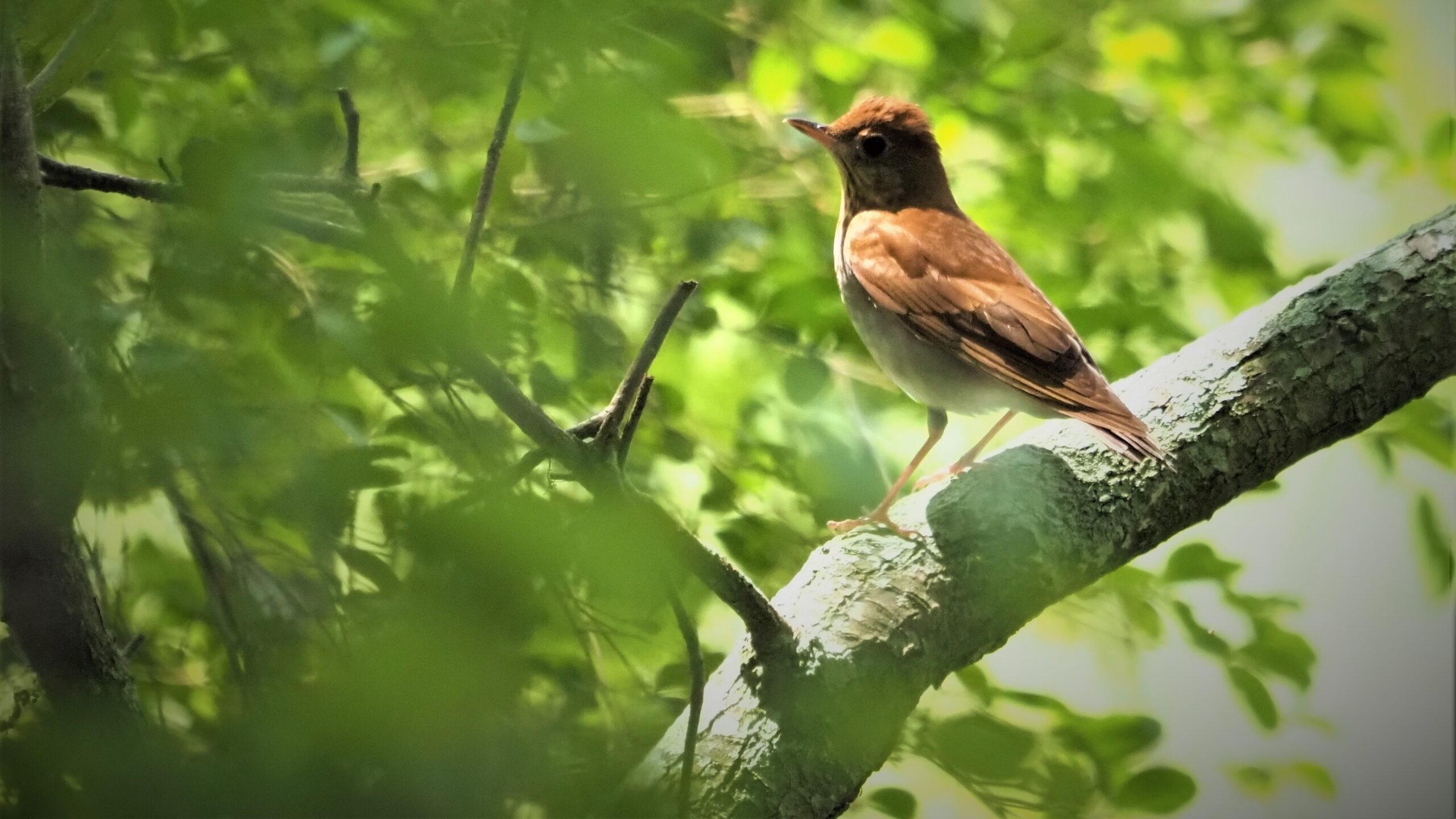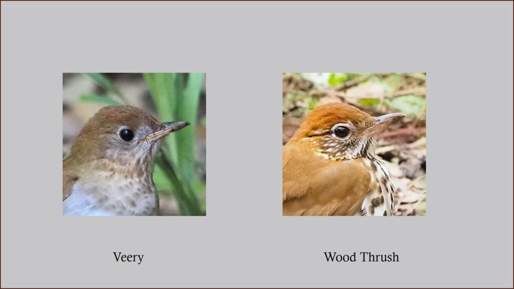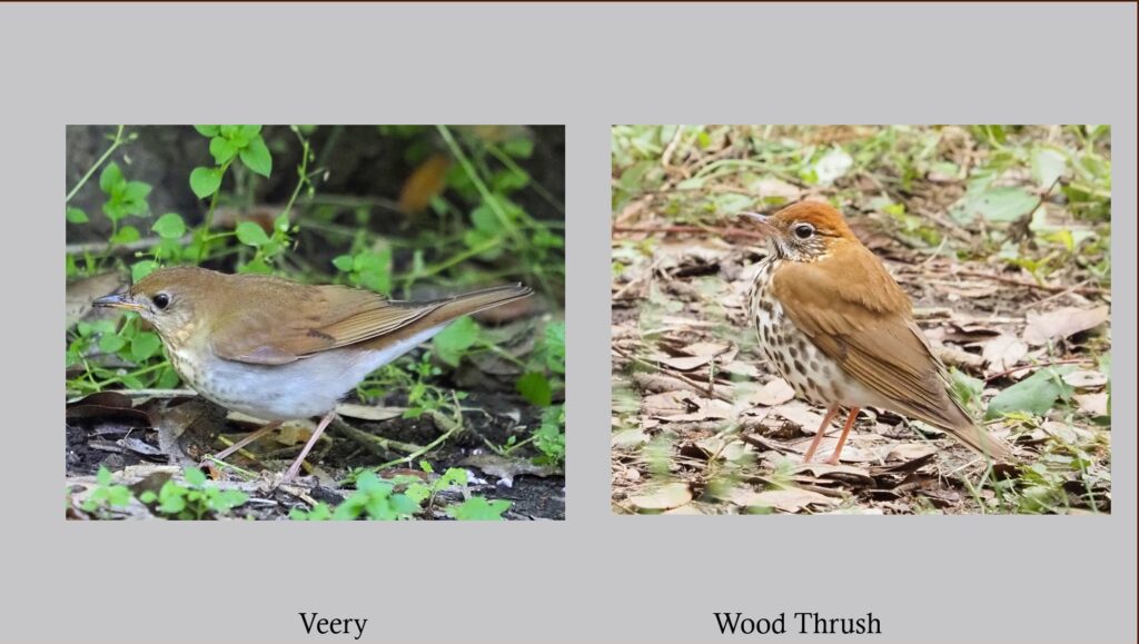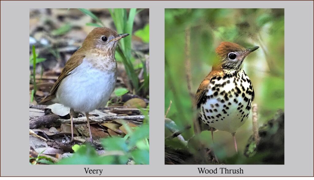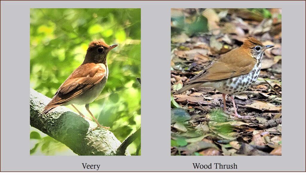 - 2 reddish-brown thrushes– Wood Thrush & Veery,