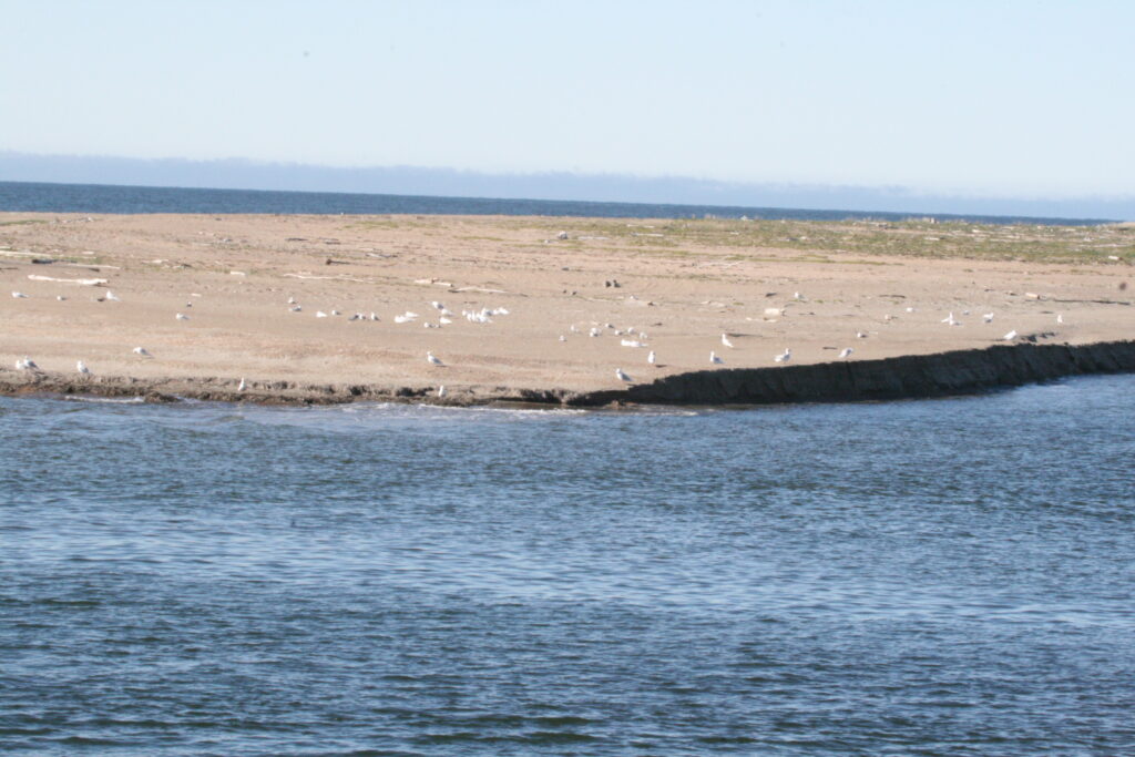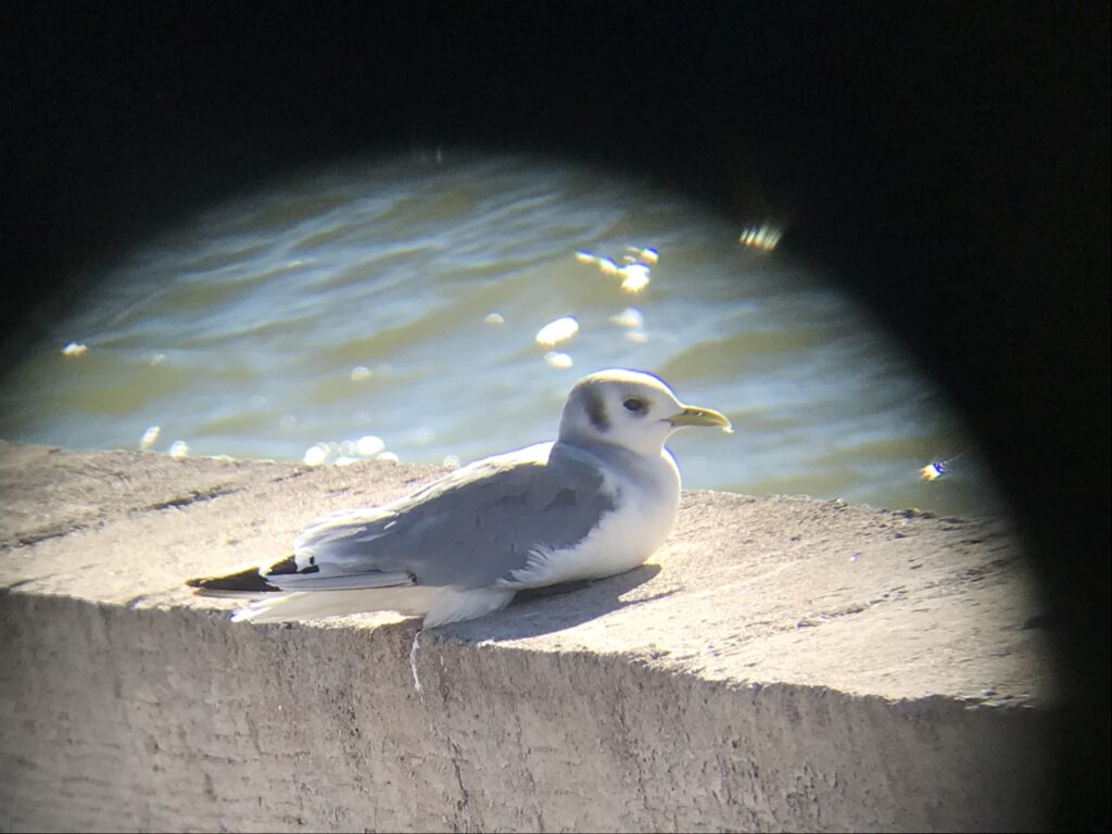 1st year Kittiwakes have an “M” shaped pattern on the back and primaries, a black bill, a black spot behind the eye, and a unique black rear-collar.