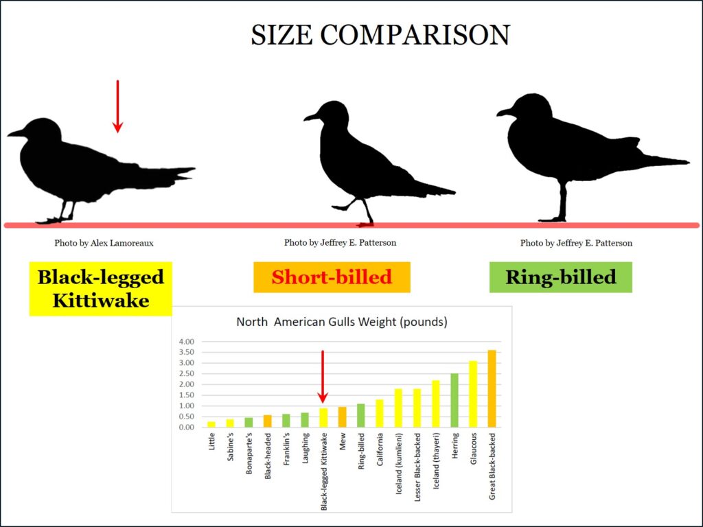 This Kittiwake is slightly heavier than a Laughing Gull, however its structure is noticeably different than most gulls: it has short legs, a sturdy body with a long, but narrow tail. Its long wings are somewhat boom-a-rang-shaped. The back half of the bird is attenuated. The large dark eyes, on a blank face impart a gentle expression. In adults the bill is yellow and is curved on top and flat on the bottom. The adults gray-backs are slightly darker than Ring-billed, but this could easily be missed unless comparing directly. The wings are tipped in black on the outer 5 primaries. Non-breeding adults have a indistinct dark spot or blurry bar behind the eye