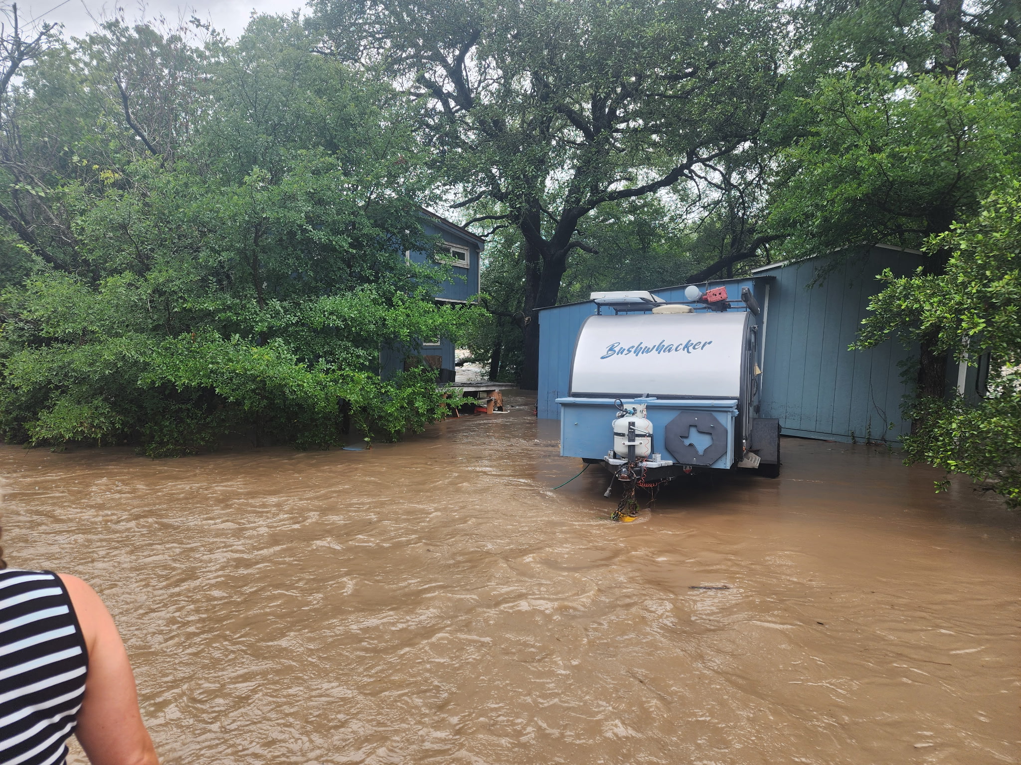 My outbuildings, camper and house did not float away, but that’s my (empty) water tank floating by in the video.