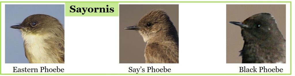 The 3 phoebes in the sayornis genus are fairly easy to identify. The Eastern Phoebe frequents open woodland and park-like habitats, while the Say’s Phoebe is a bird of open western areas and the Black Phoebe prefers dry southwestern areas near a water source.