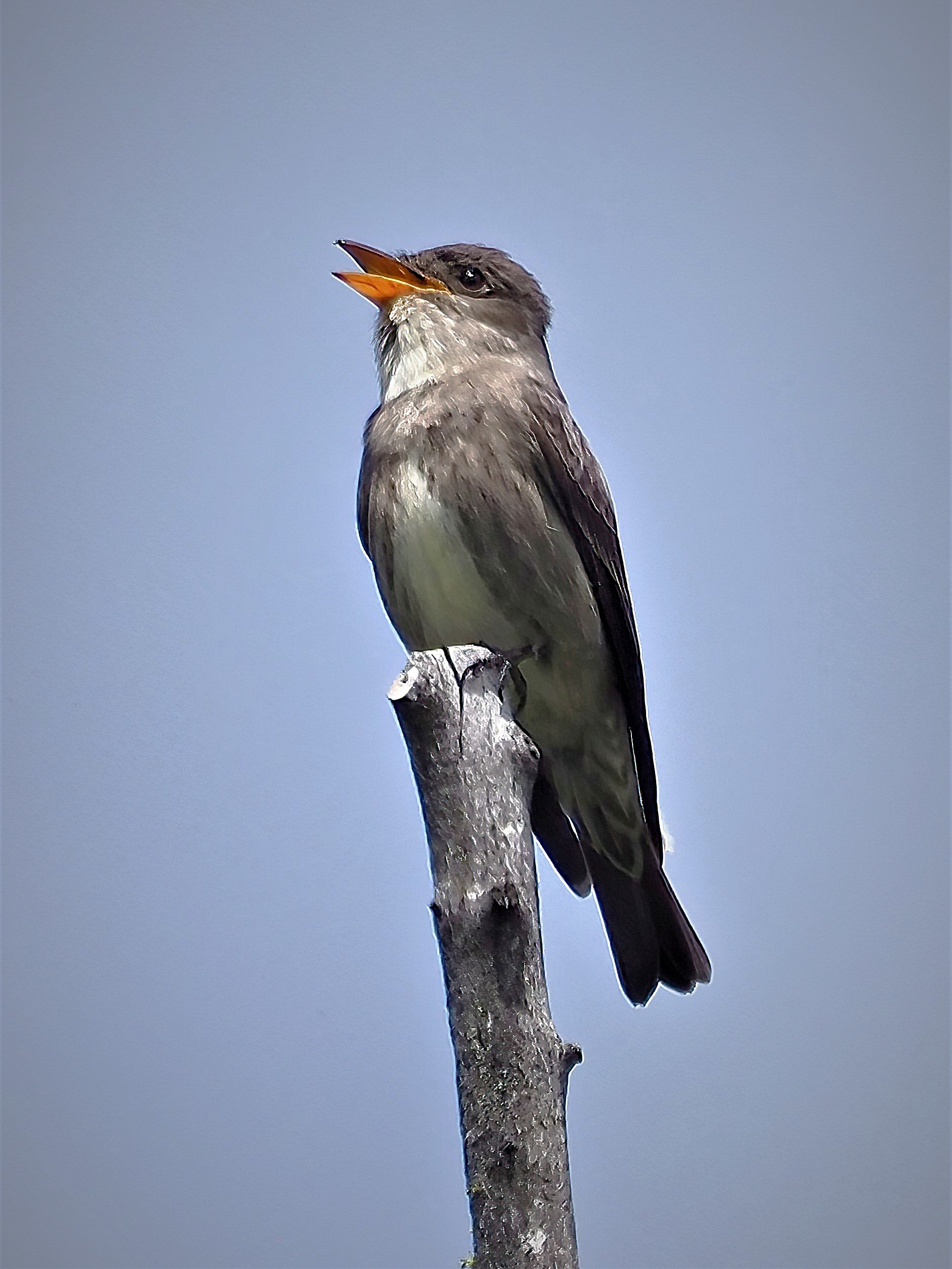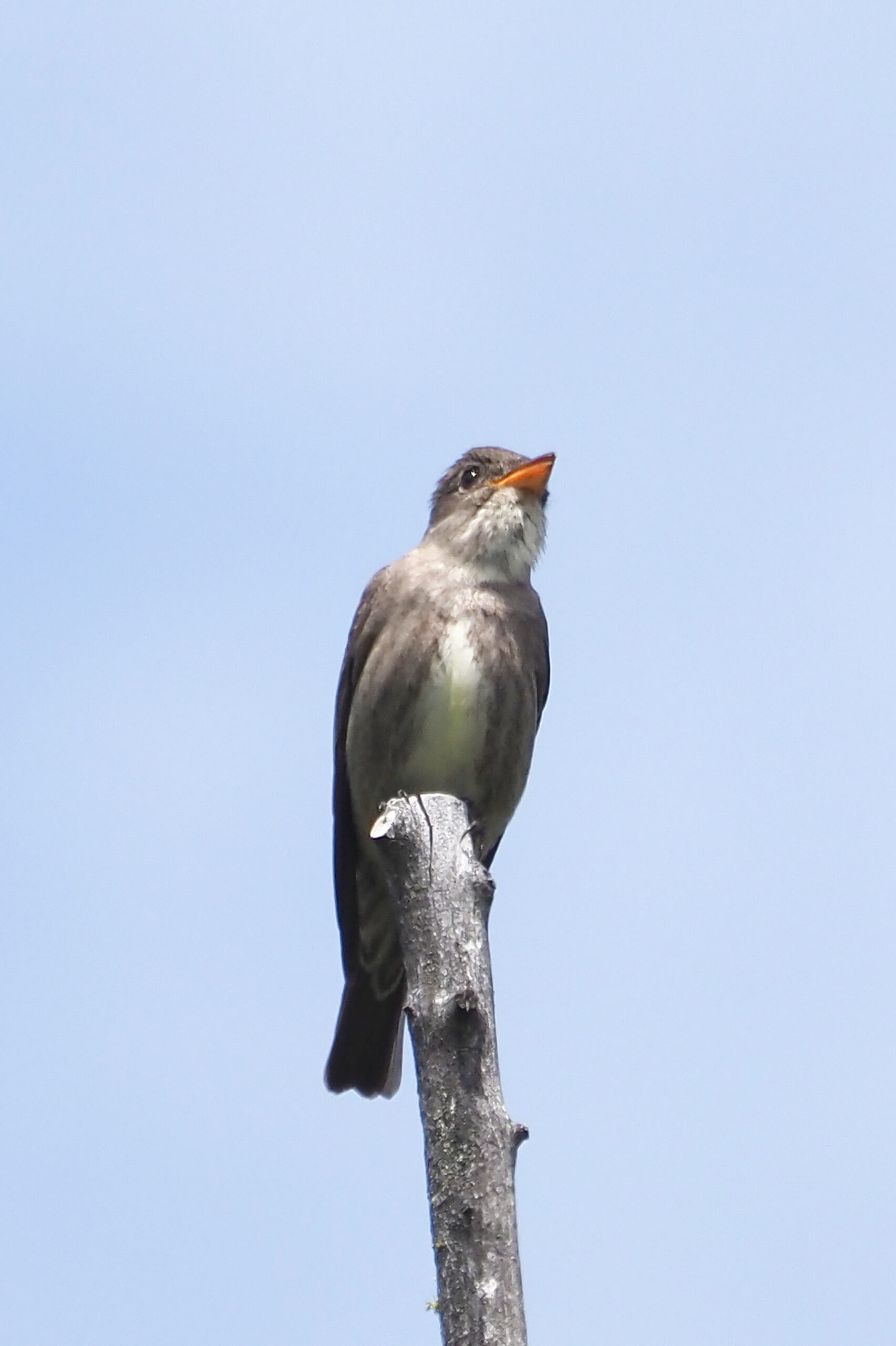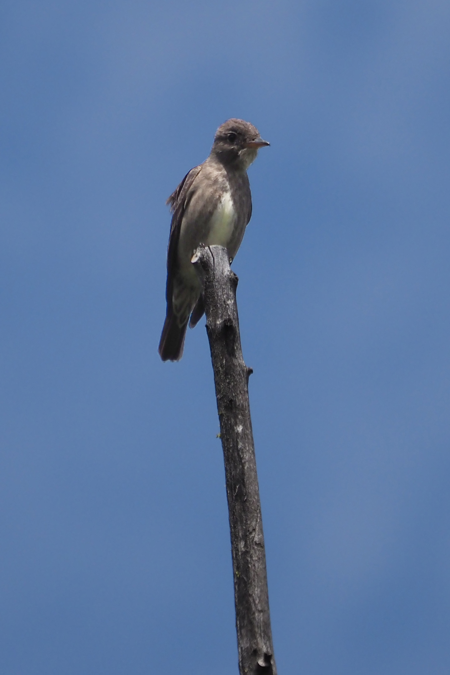 As a fairly distinctive species, the Olive-sided Flycatcher is not a difficult identification. It is a large flycatcher with a white throat and belly, a long primary projection, and a very strong “vested” look. Its bill is dark and thick and it’s lower mandible is usually a dull orangish. This species is frequently found on high exposed perches as in the photo below. Its tail is shorter that that of the similarly-sized Greater Pewee. Sometimes white patches are exposed on the back, at other times they are covered by the folded-wing. The Olive-sided’s “quick, three beers” song is diagnostic.