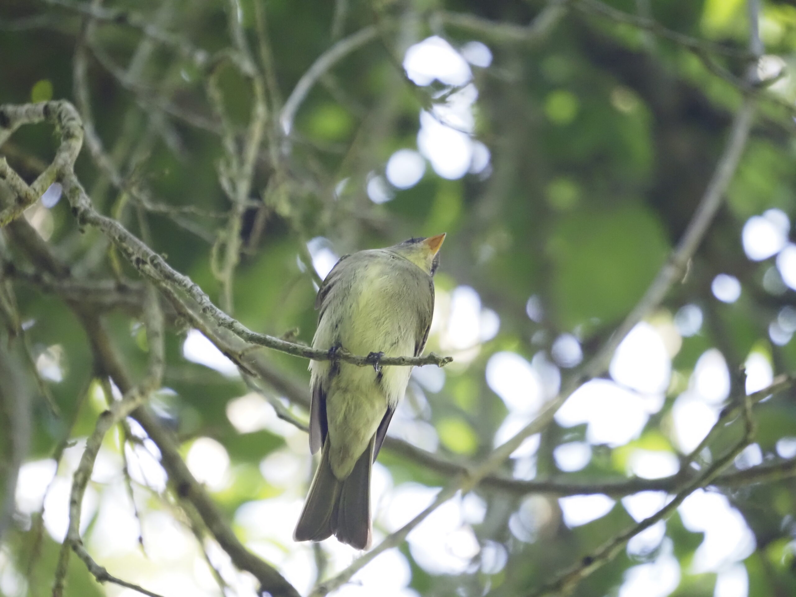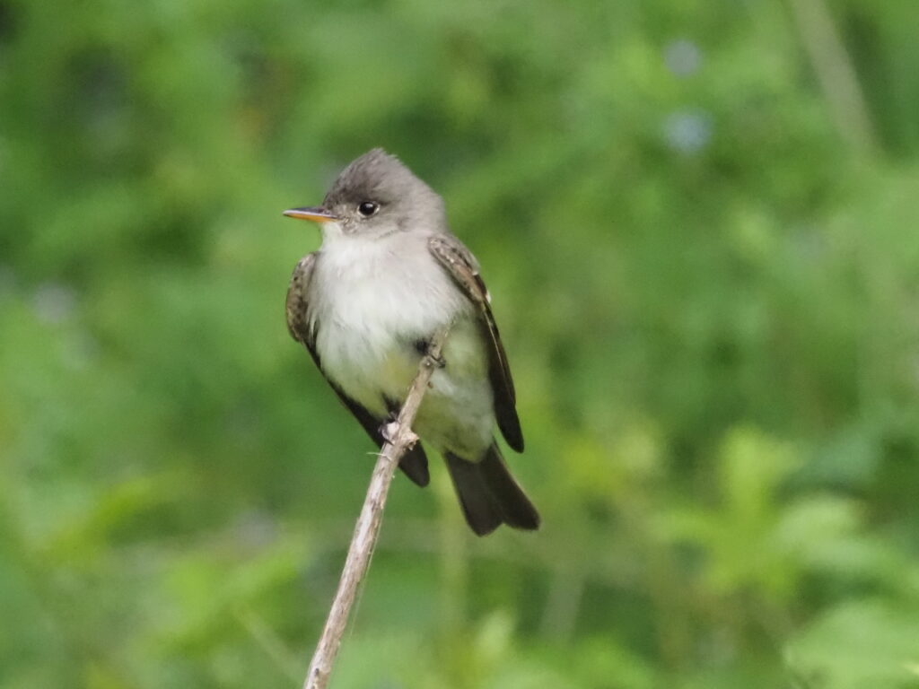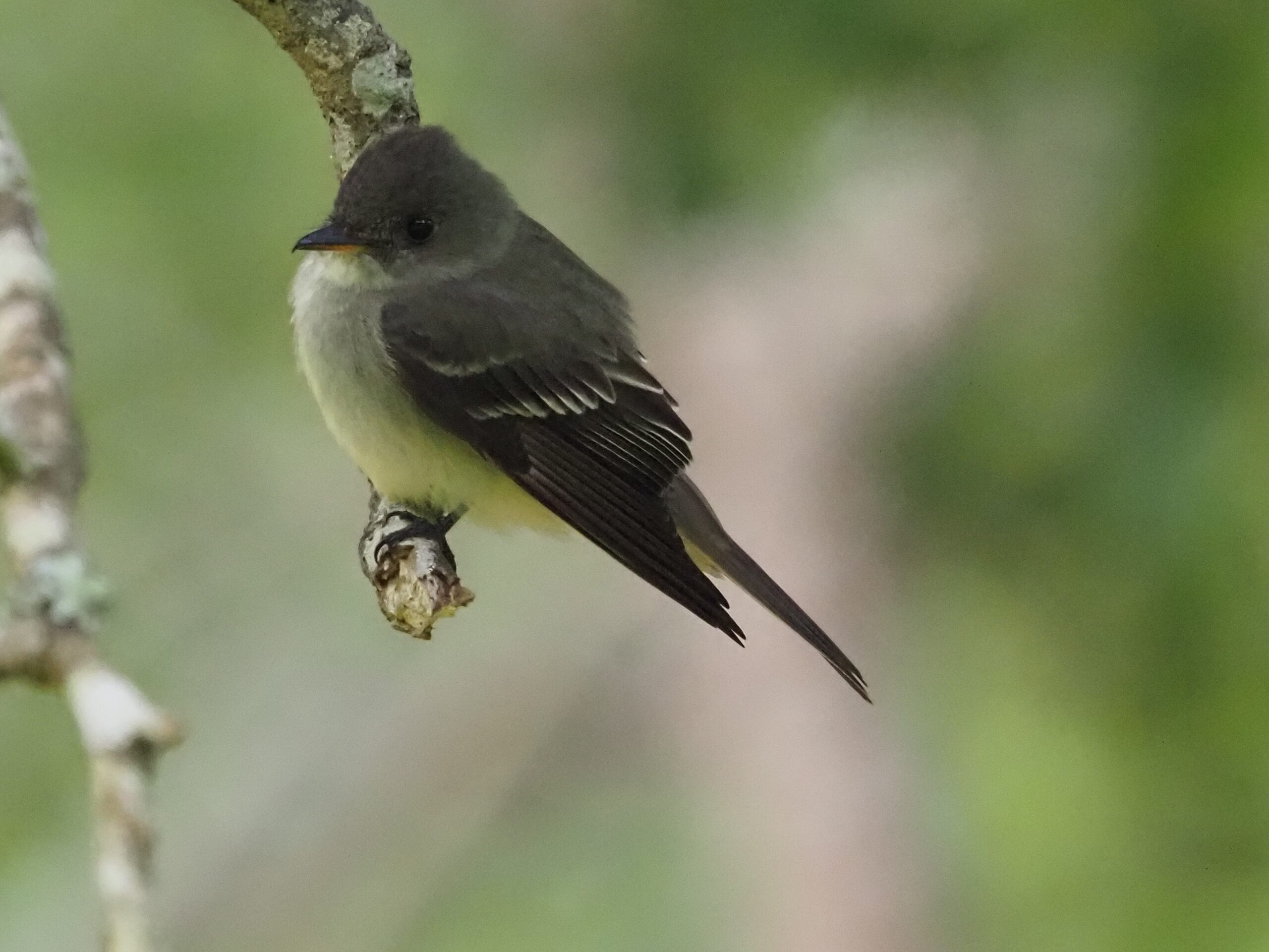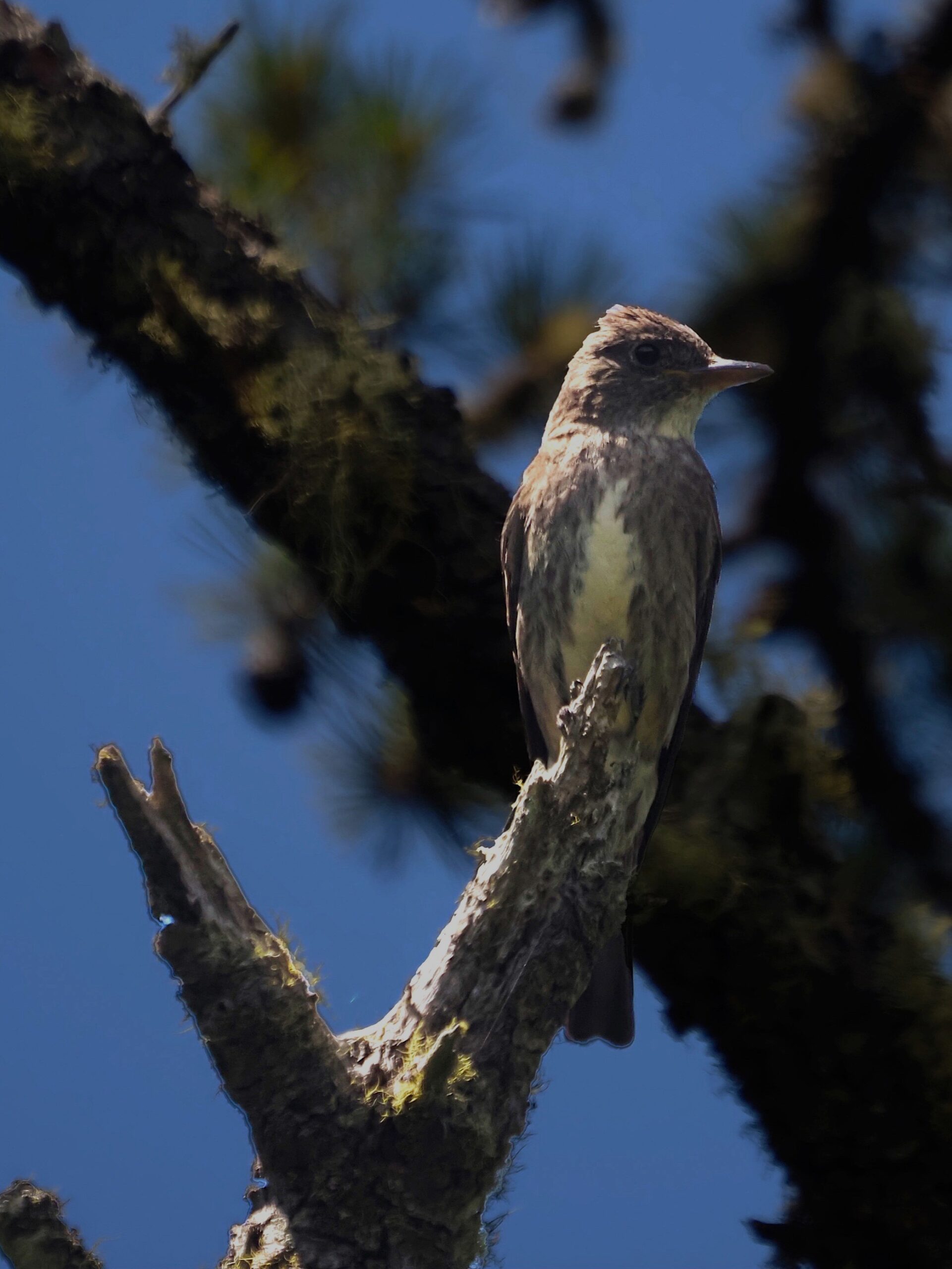 As a fairly distinctive species, the Olive-sided Flycatcher is not a difficult identification. It is a large flycatcher with a white throat and belly, a long primary projection, and a very strong “vested” look. Its bill is dark and thick and it’s lower mandible is usually a dull orangish. This species is frequently found on high exposed perches as in the photo below. Its tail is shorter that that of the similarly-sized Greater Pewee. Sometimes white patches are exposed on the back, at other times they are covered by the folded-wing. The Olive-sided’s “quick, three beers” song is diagnostic.