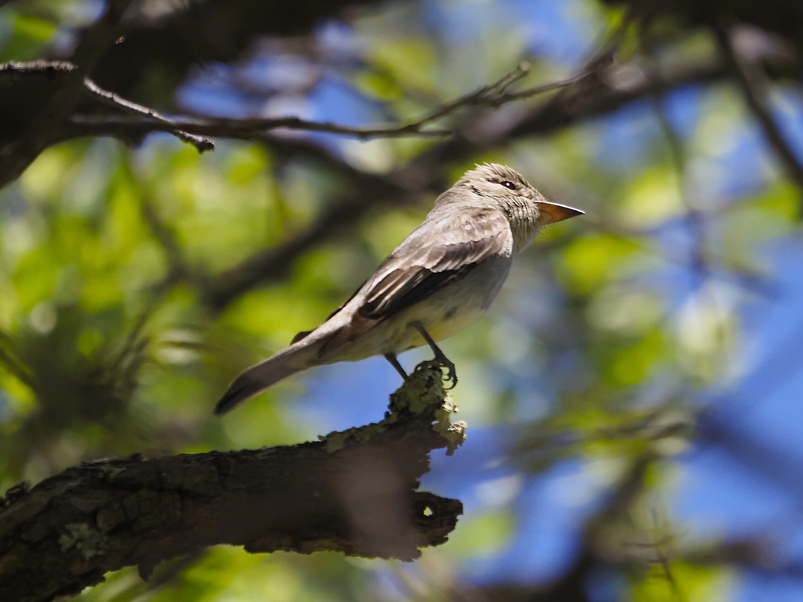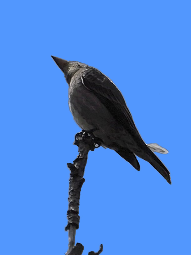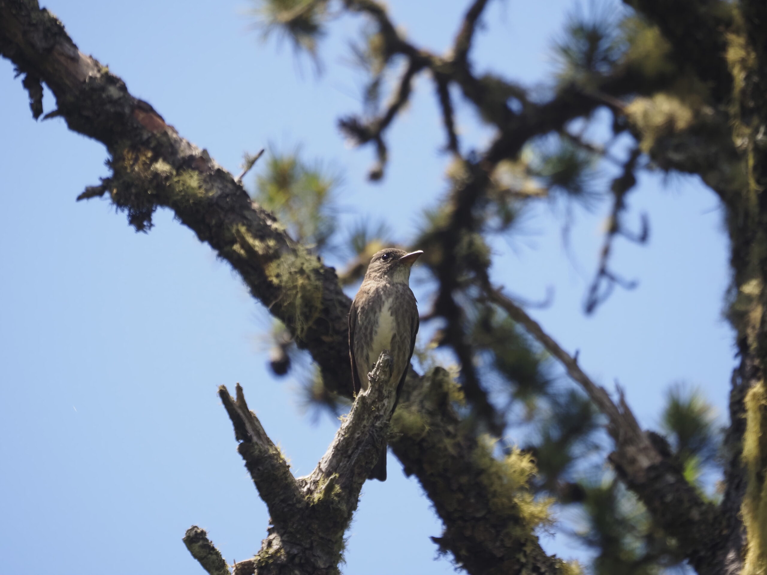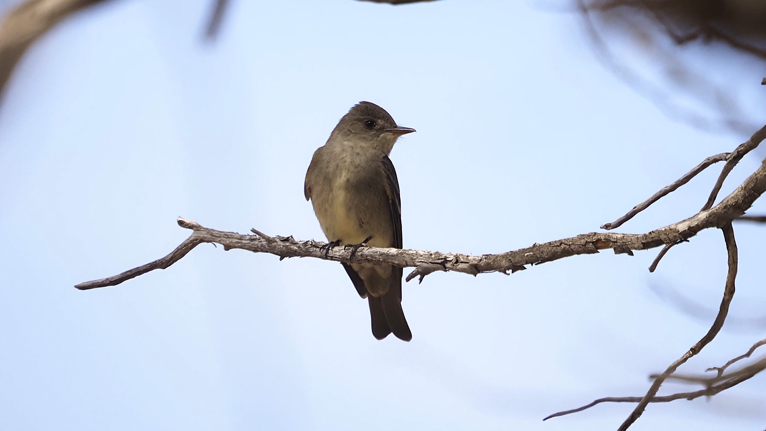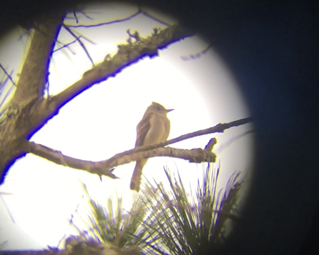 The Greater Pewee is more common in the mountains of Mexico, New Mexico and Arizona than in Texas. The most likely locations in Texas are the mountains of Big Bend and the Davis Mountains, although one has recently (2021-2023) spent several winters in a park in Houston. The Greater Pewee is distinguished by its large size, gray coloring, long primary projection and somewhat thin bill, with dull orange lower mandible. It might be confused with the similarly-sized Olive-sided Flycatcher, but it lacks the distinctive “vested” breast of that species and has a thinner bill and a longer tail. It is noticeably larger than the other 2 pewees and is known for its low, soft “pip, pip-pip-pip” call and its “jose, jose, jose maria” song. Sightings of this species in Texas should be photographed, documented and submitted to the TBRC. Because it is a rare in Texas, I only have a single poor, digi-scoped video of this species, from which I extracted the still photo below.