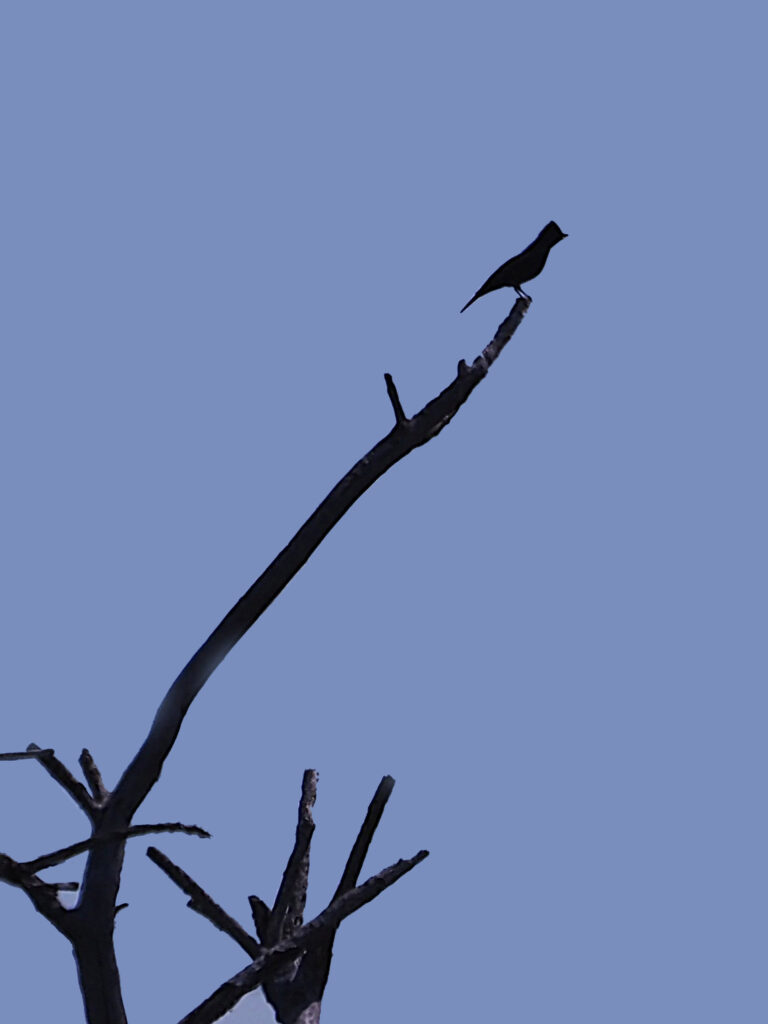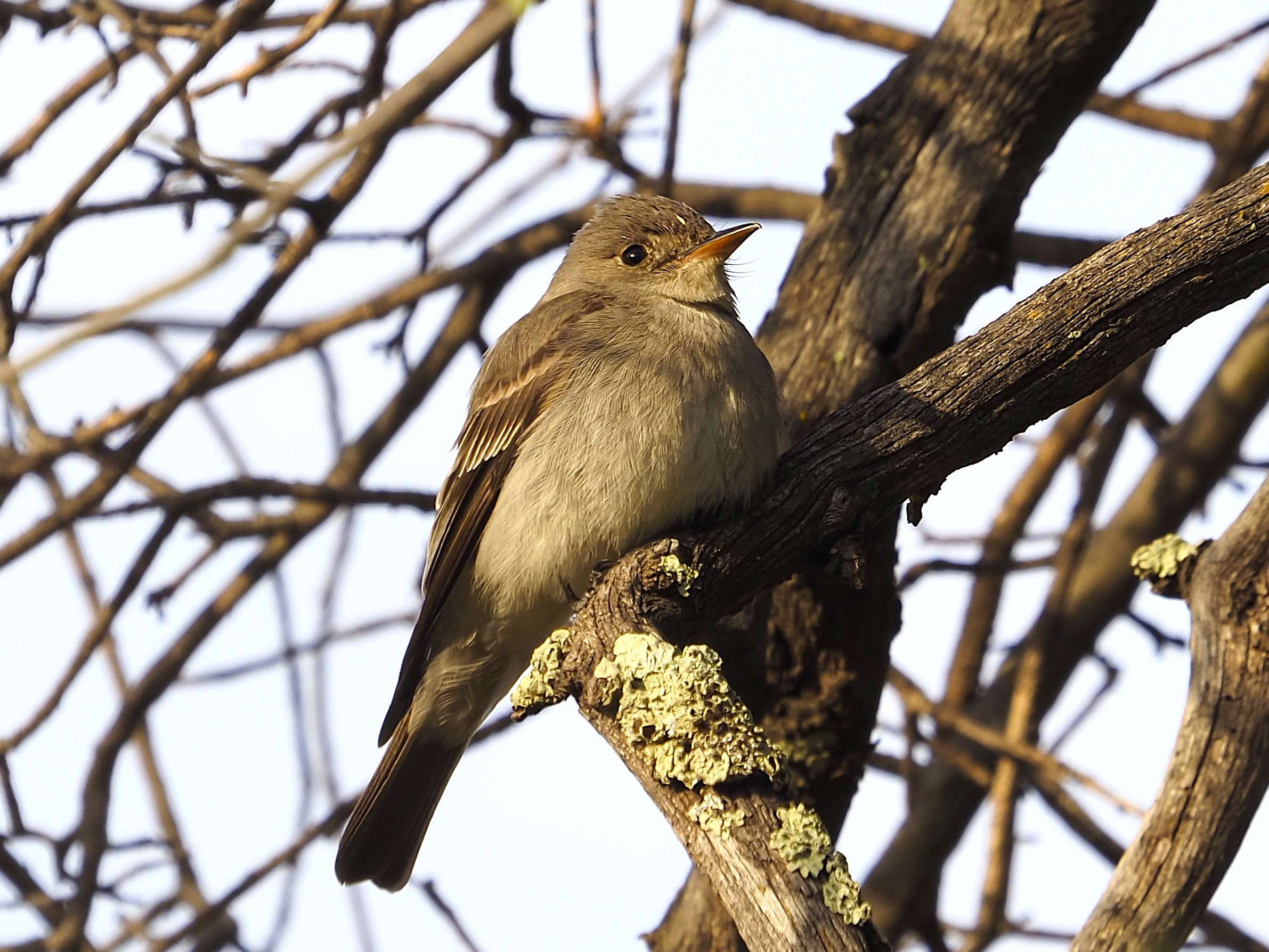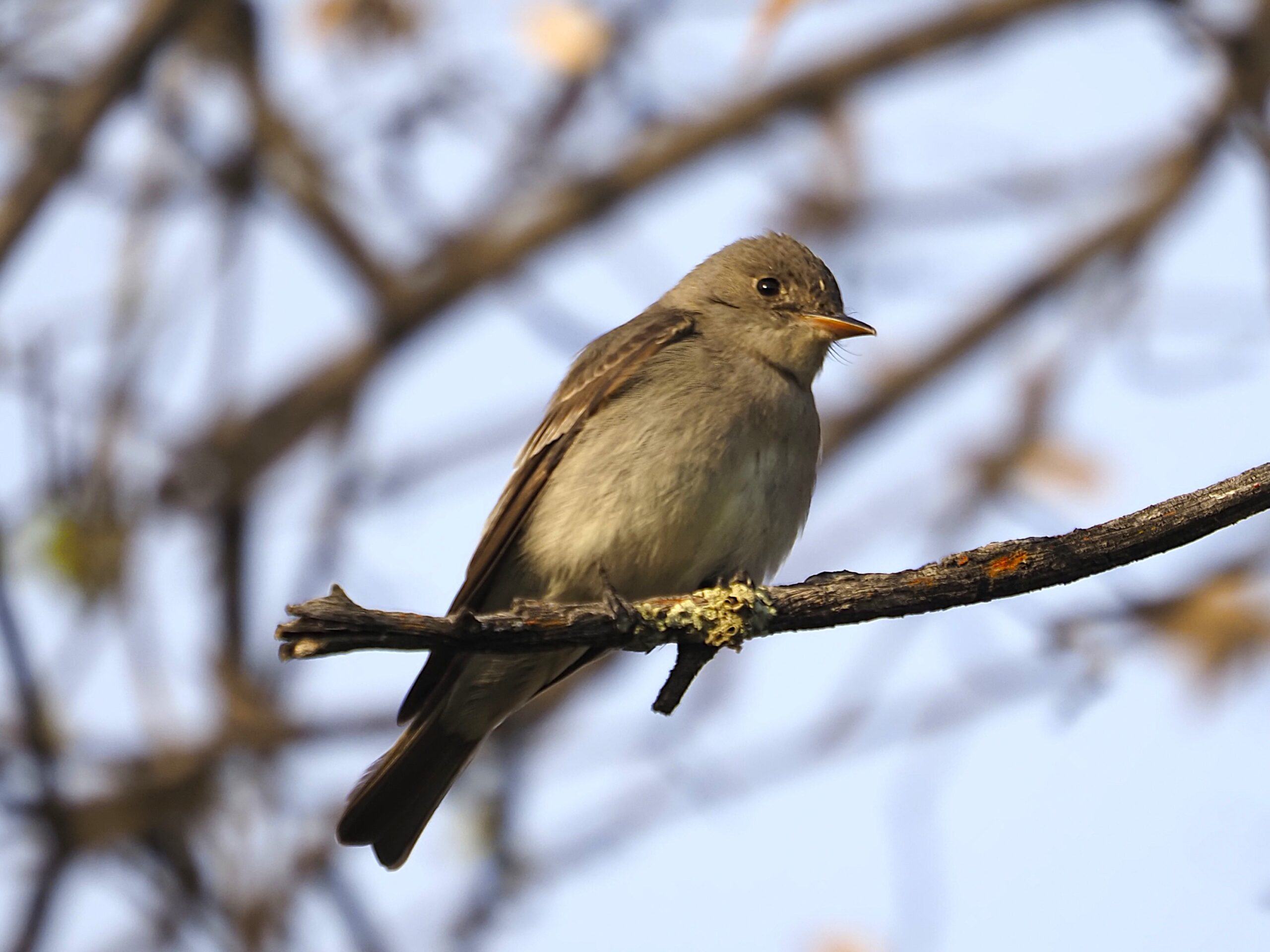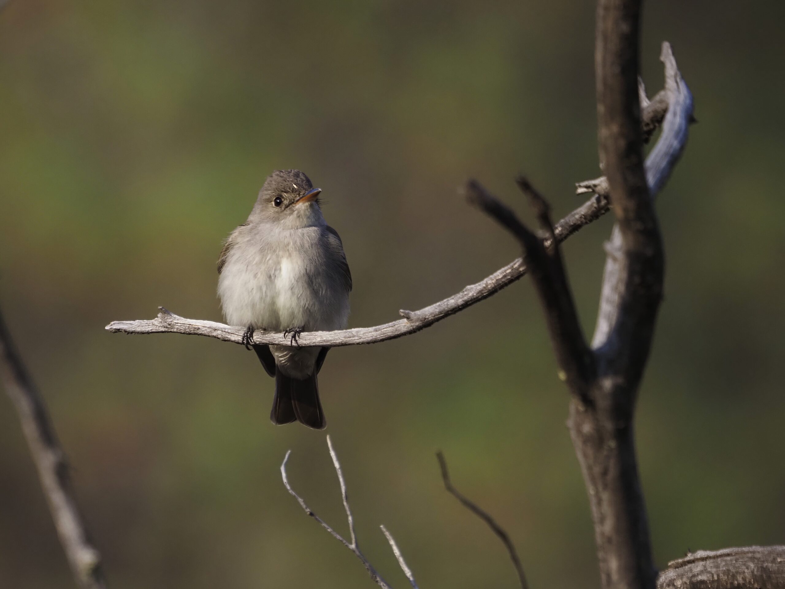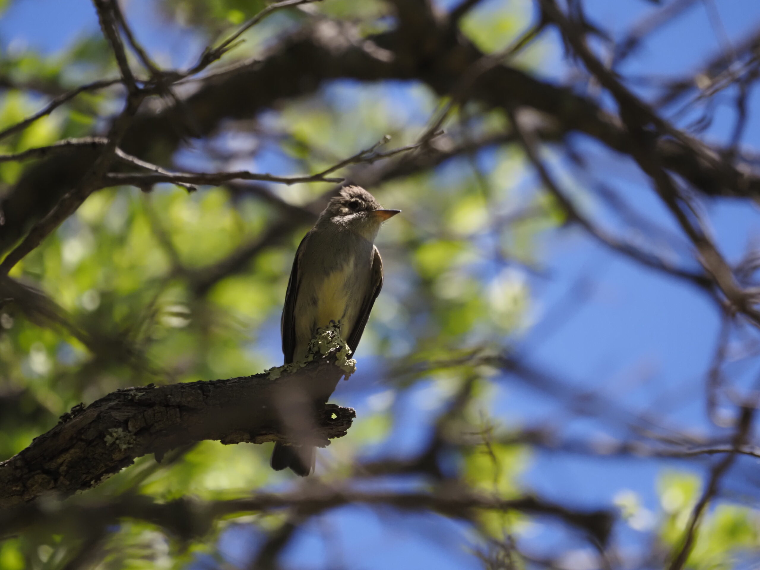 The Greater Pewee is more common in the mountains of Mexico, New Mexico and Arizona than in Texas. The most likely locations in Texas are the mountains of Big Bend and the Davis Mountains, although one has recently (2021-2023) spent several winters in a park in Houston. The Greater Pewee is distinguished by its large size, gray coloring, long primary projection and somewhat thin bill, with dull orange lower mandible. It might be confused with the similarly-sized Olive-sided Flycatcher, but it lacks the distinctive “vested” breast of that species and has a thinner bill and a longer tail. It is noticeably larger than the other 2 pewees and is known for its low, soft “pip, pip-pip-pip” call and its “jose, jose, jose maria” song. Sightings of this species in Texas should be photographed, documented and submitted to the TBRC. Because it is a rare in Texas, I only have a single poor, digi-scoped video of this species, from which I extracted the still photo below.
