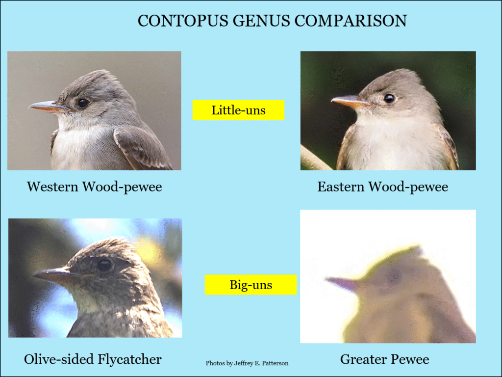 Sixteen species comprise the genus contopus. Most of these reside in Central and South America, with only four species regularly present in North America and Texas. The Greater Pewee is a TBRC Review List species with 45 accepted records. The Olive-sided Flycatcher is a fall and spring migrant and the Eastern and Western Wood-pewees are both migrants and summer nesters in Texas. These four flycatchers can be divided into “big-uns” and “little-uns” as shown below. The “little-uns”, the 2 Wood-Pewees, are the primary identification challenge in this group.