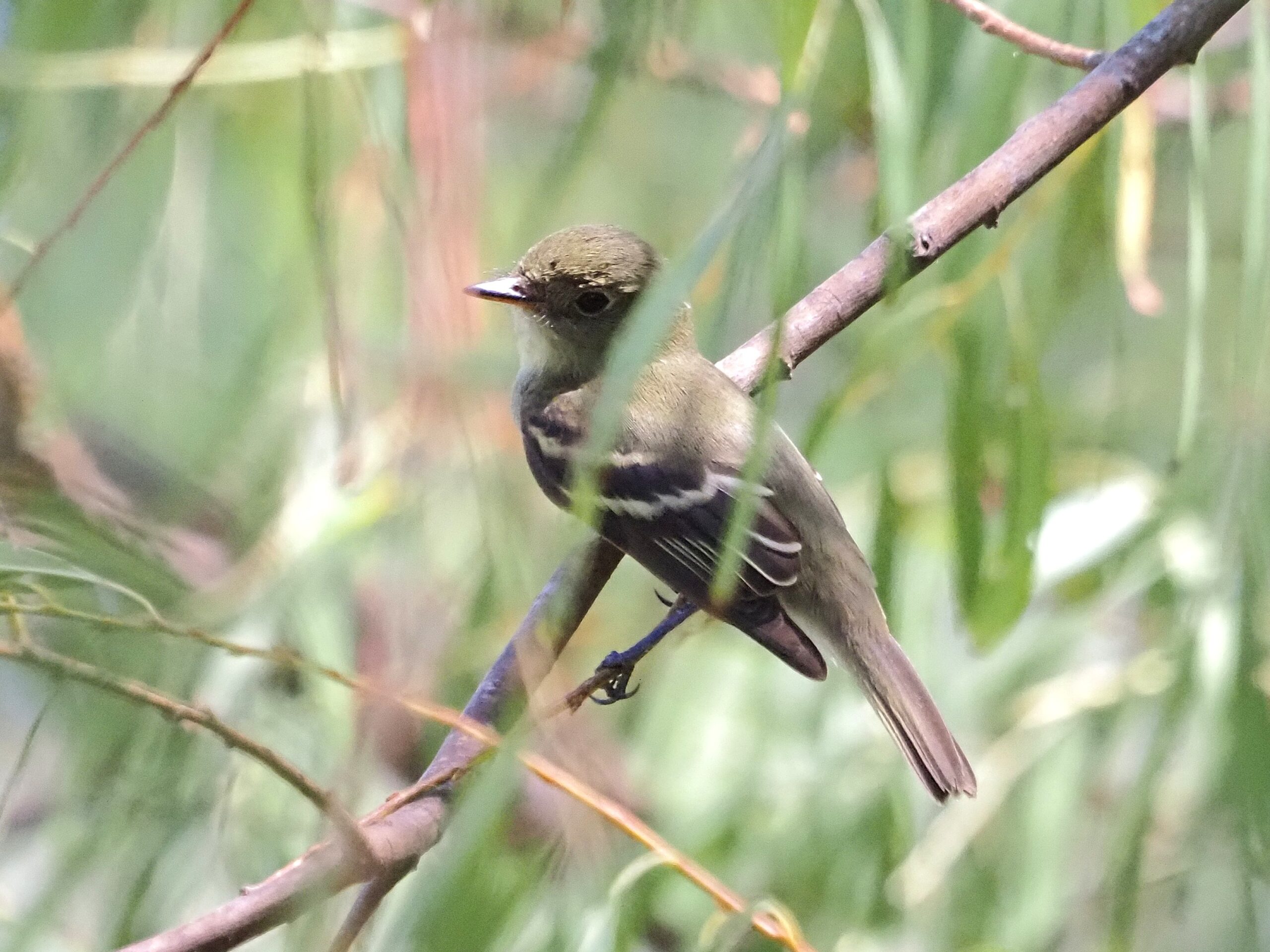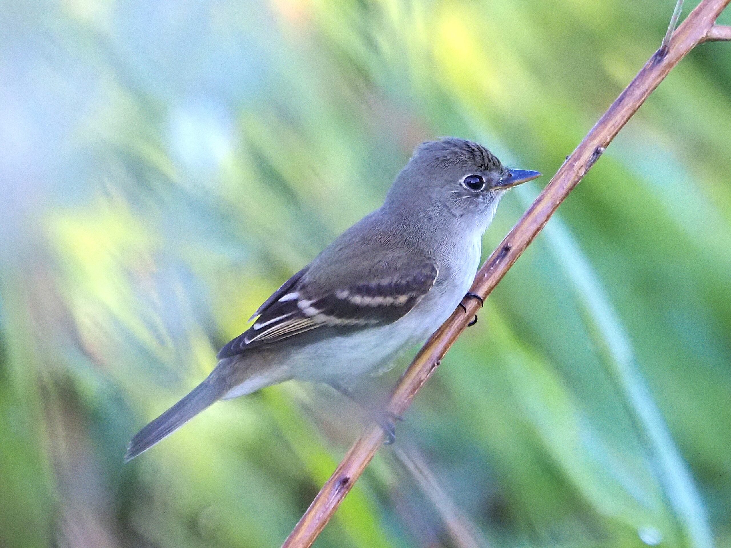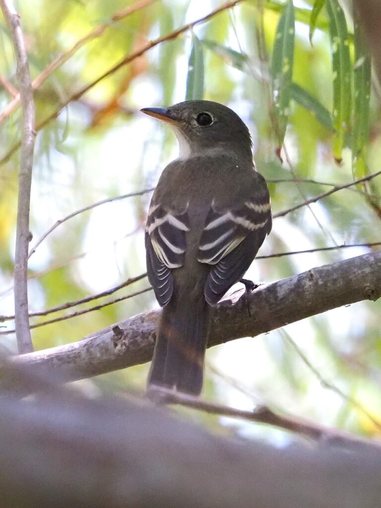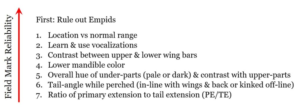 The photos in the gallery below show several of the more “pewee-like” Empid species — the Gray Flycatcher, “Trails” Flycatcher, and the Acadian Flycatcher. Note the primary projection, wing-bar and eye-ring intensity, the crest, the width of the tail, and the overall structure of Empids vs Pewees.