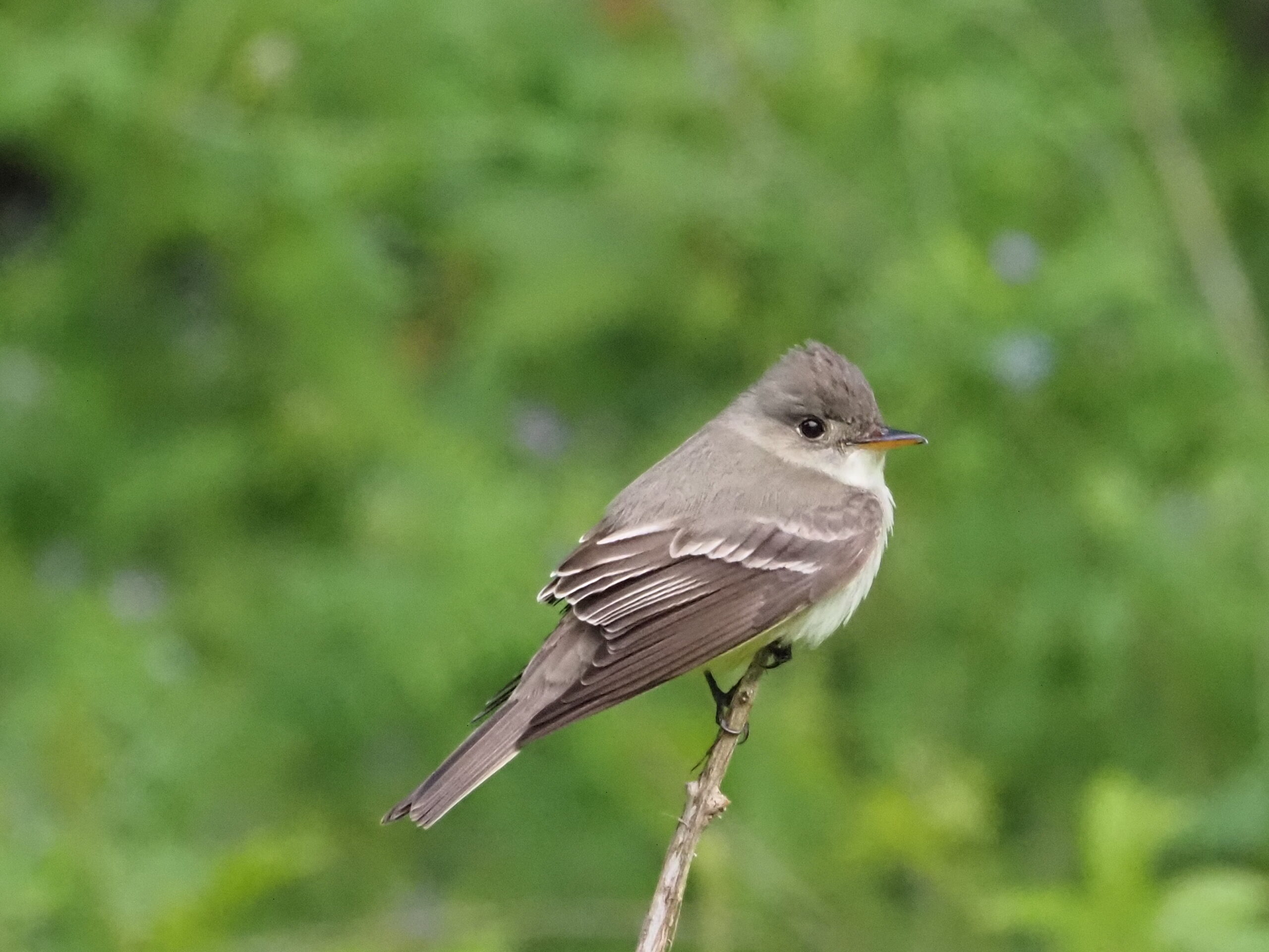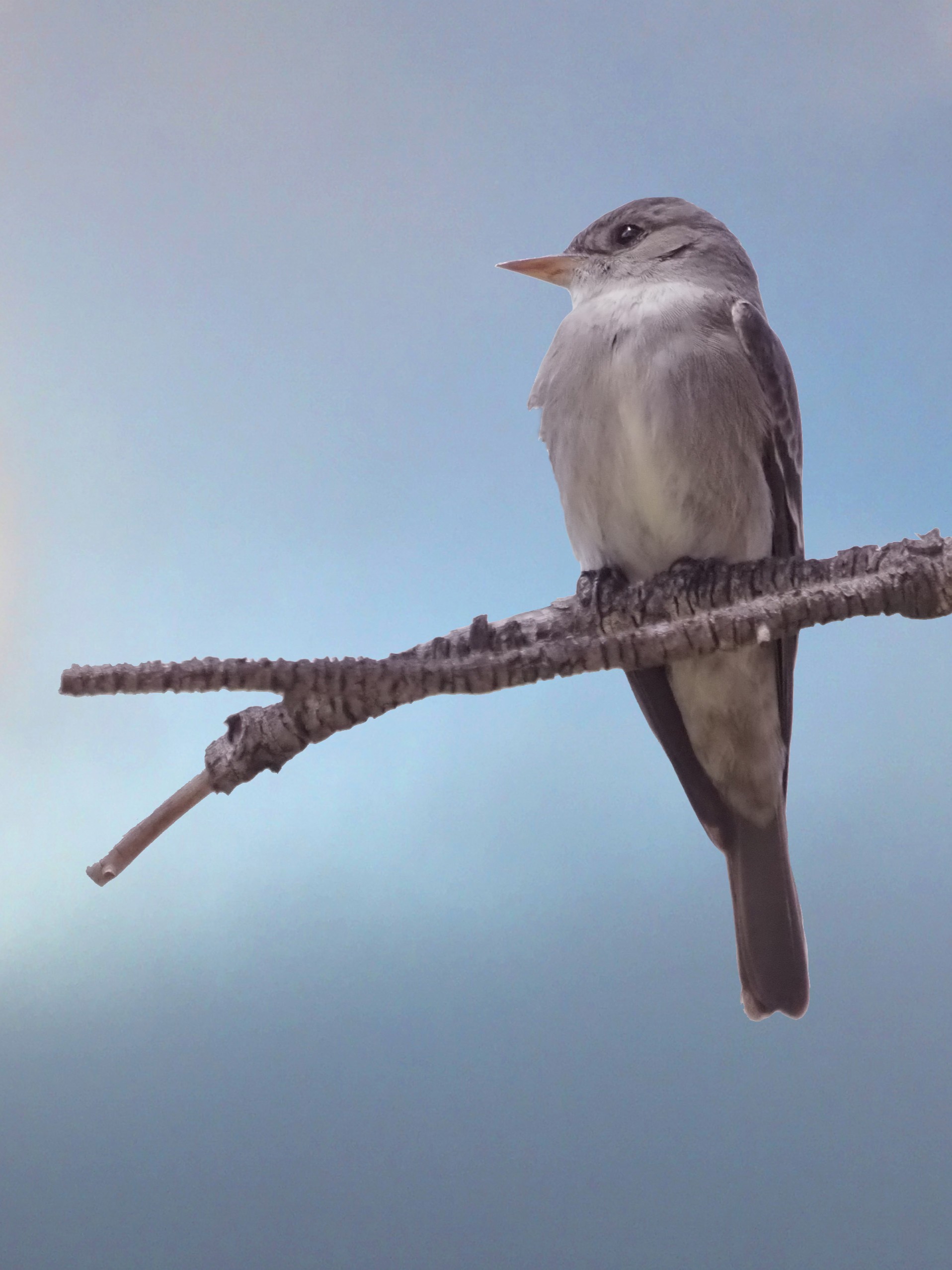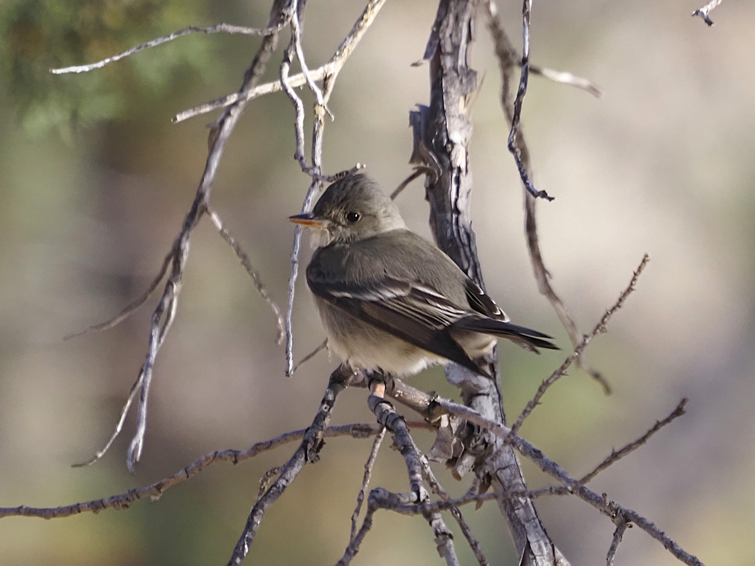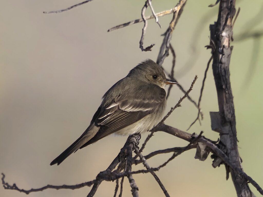 The first thing to look for with a Pewee sighting is to make sure it’s not an Empid, and the first thing to note in this regard is that Pewees have very long primary projections compared to Empids. Empids usually have more prominent wing-bars and most species have more noticeable eye-rings than Pewees. Pewees wing-bars are dull and their eye-rings are inconspicuous or non-existent. All of these points can be seen in the photos below.