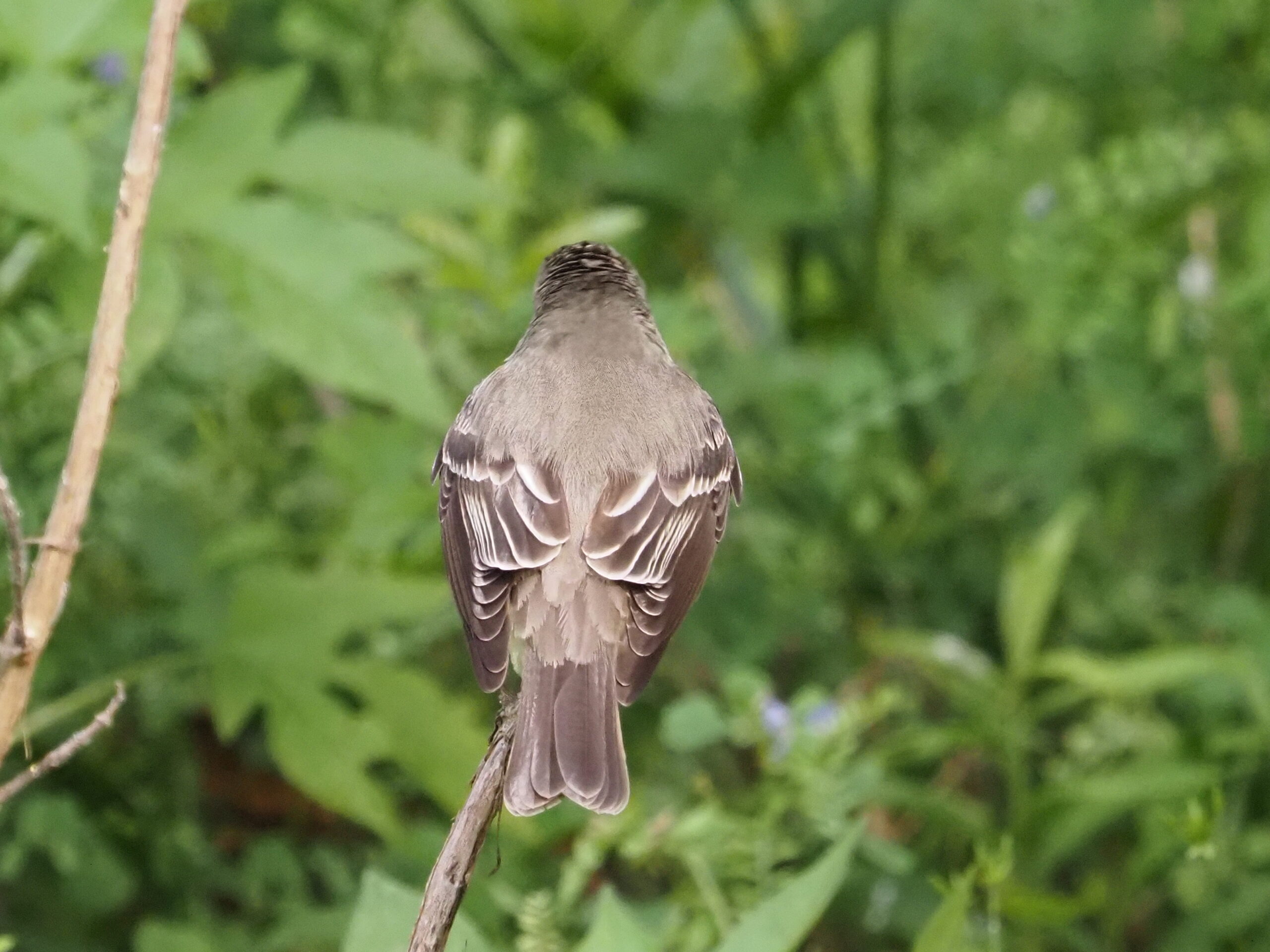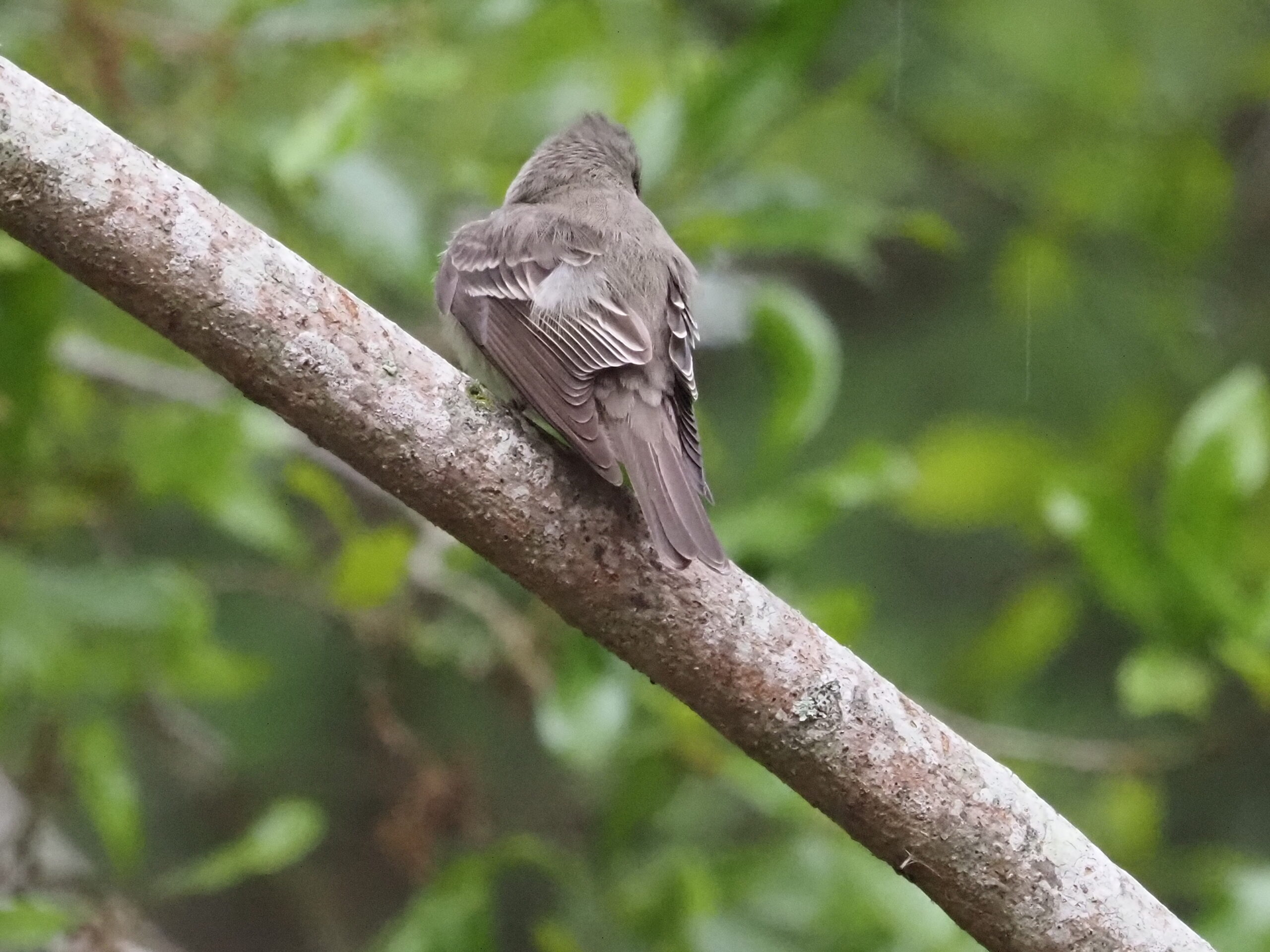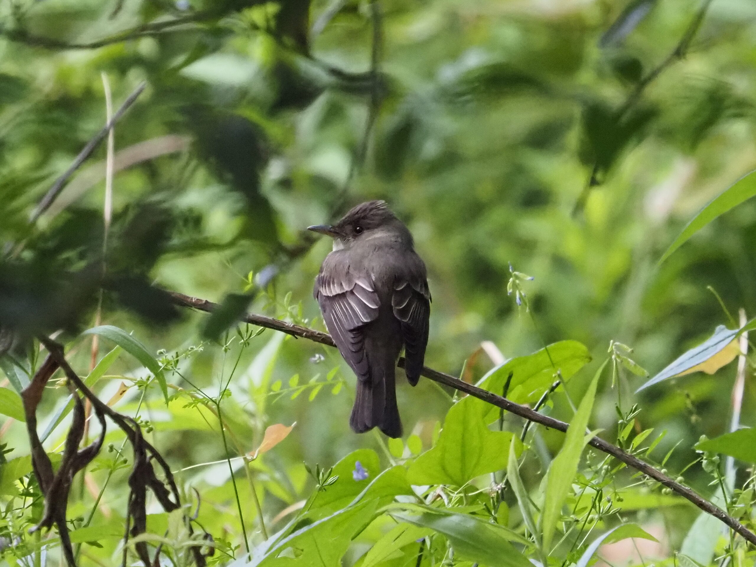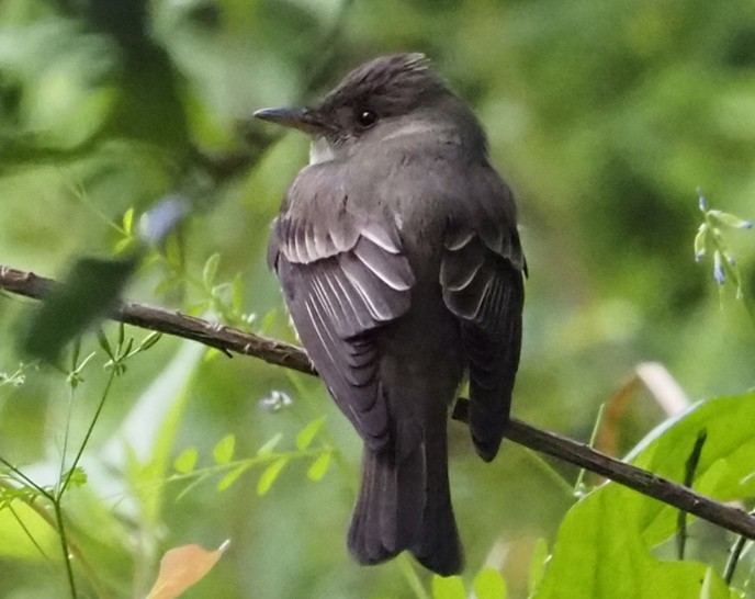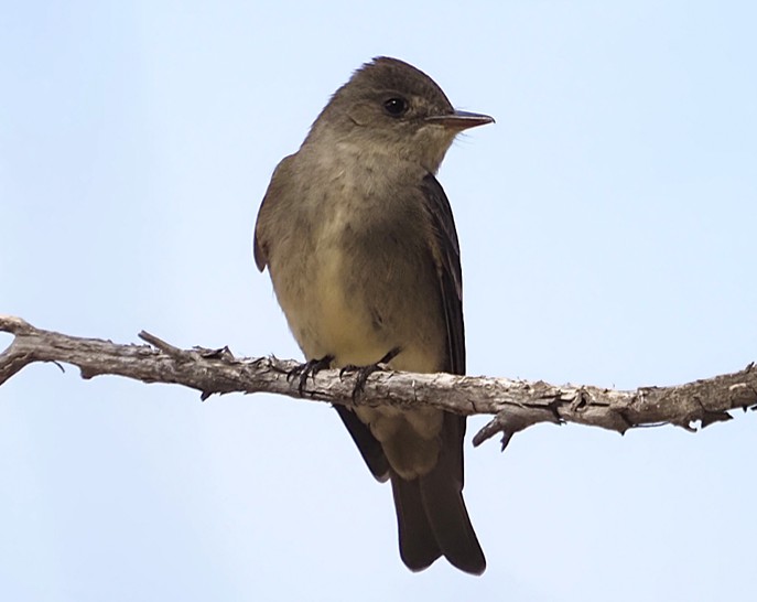 The first thing to look for with a Pewee sighting is to make sure it’s not an Empid, and the first thing to note in this regard is that Pewees have very long primary projections compared to Empids. Empids usually have more prominent wing-bars and most species have more noticeable eye-rings than Pewees. Pewees wing-bars are dull and their eye-rings are inconspicuous or non-existent. All of these points can be seen in the photos below.