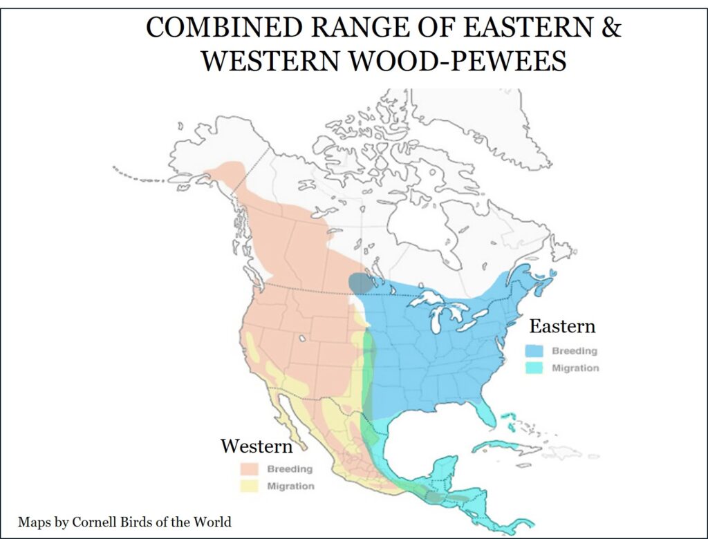 Although much of the fun of birding is finding out-of-range individuals, the normal range of species is where they are found a very large percentage of the time. So it is important to know a species range and consider it during identification. The normal range of the 2 Wood-Pewees is shown in the combined range map below.