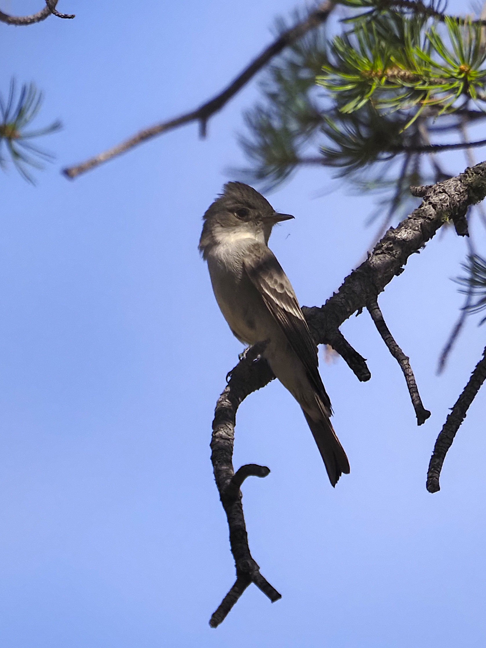 Another generalization that tends to be true, but not always, is the general coloration of the 2 pewees: Western tends to be darker and Eastern tends to be paler in the underparts (throat, chest, belly…). This results in more contrast for the Eastern between upper and lower parts.