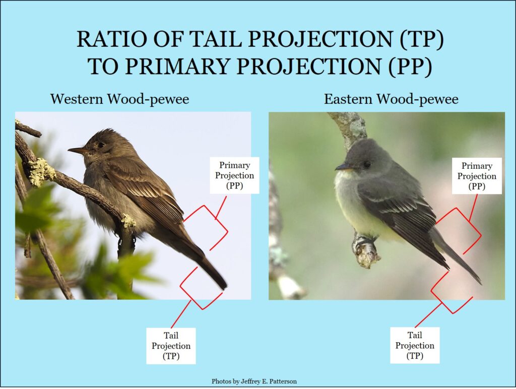 According to Lee & Birch, “although there is overlap, Eastern tends toward a slightly shorter primary projection and a longer tail than Western: ratio of the primary projection (PP) to tail projection (TP) is greater in Western than in Eastern“. However, in their 2008 article for Birding Magazine, (Field Identification of Western & Eastern Wood-pewees; Lee, Cin-Ty; Birch, Andrew; Eubanks, Ted Lee. Birding Magazine; Sept/Oct 2008) they describe this field mark as “…perhaps too subtle to be of direct use in the field…”. I find this a difficult determination to make even with photographs, therefore, this may be an in-the-hand measurement that could be made. In their more recent book they describe the Western as “…subtly shorter tailed than Eastern” which may be a more manageable field mark (with emphasis on “field”).