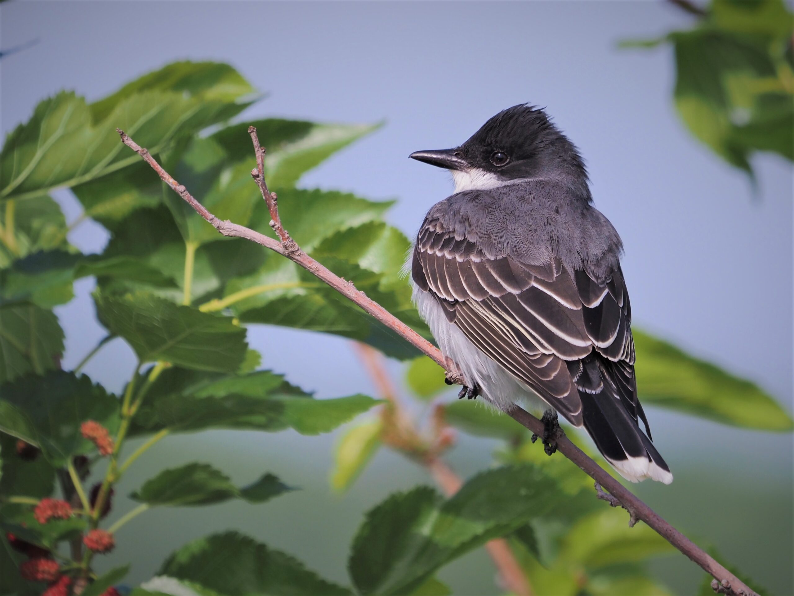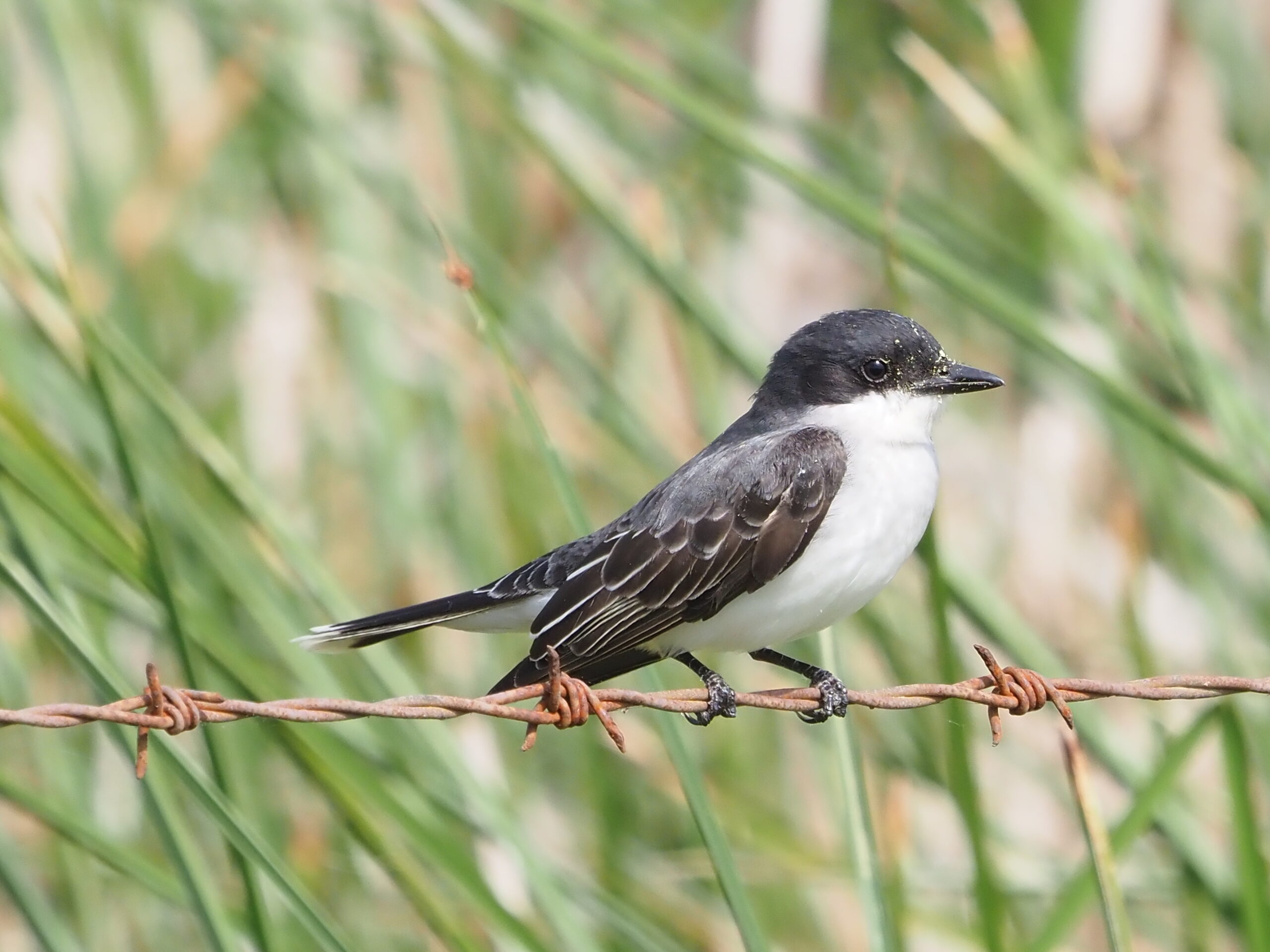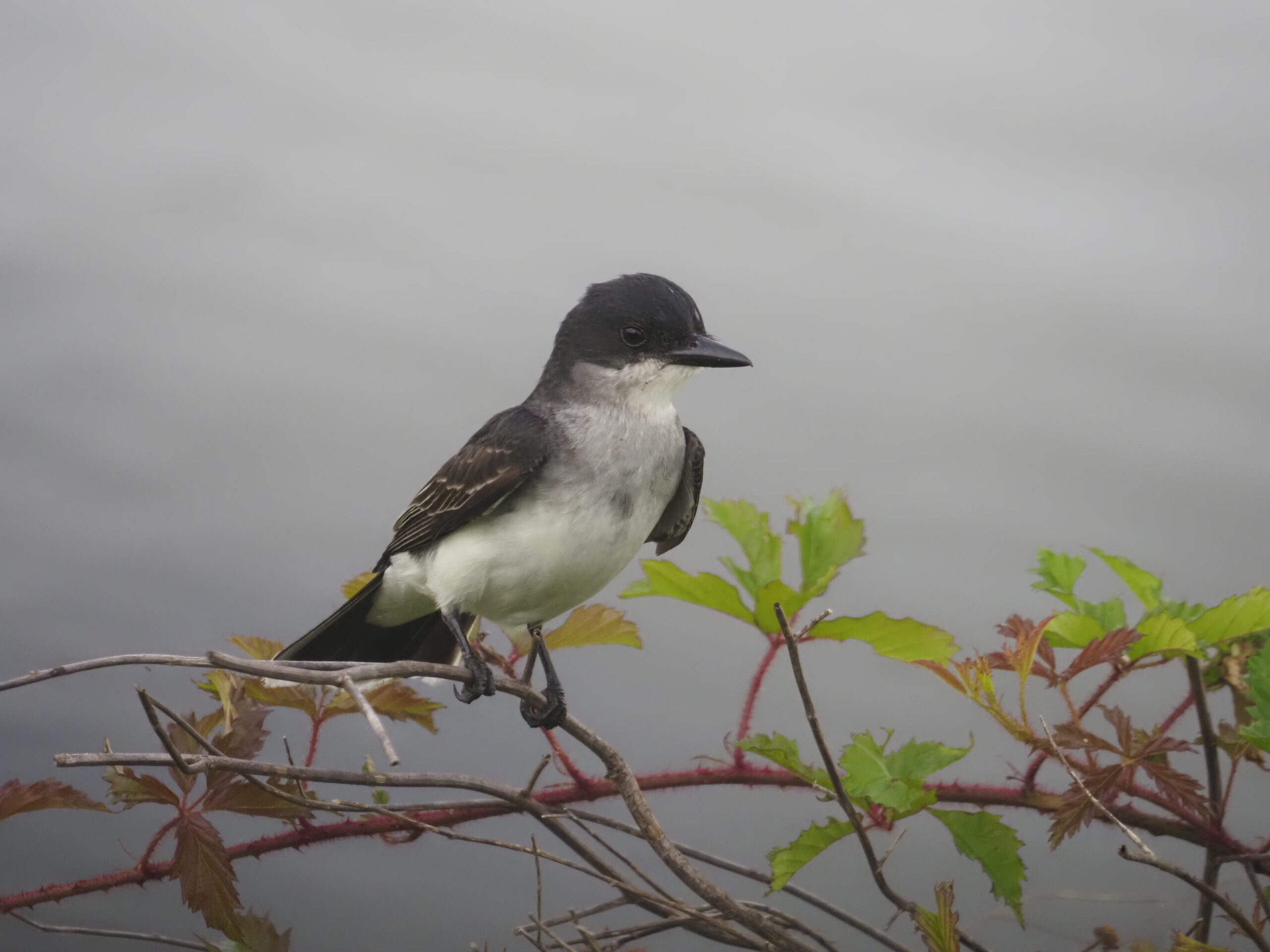 The Eastern Kingbird is a dapper black and white flycatcher with black or dark gray upper parts and white and pale gray lower parts. If seen fleetingly, the black tail with the white tip is a good clue, as are the distinctive, mostly dark underwings.