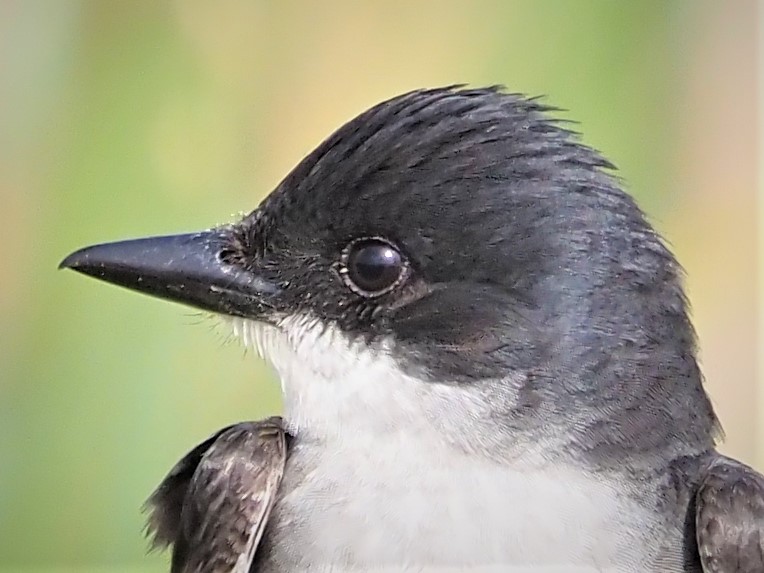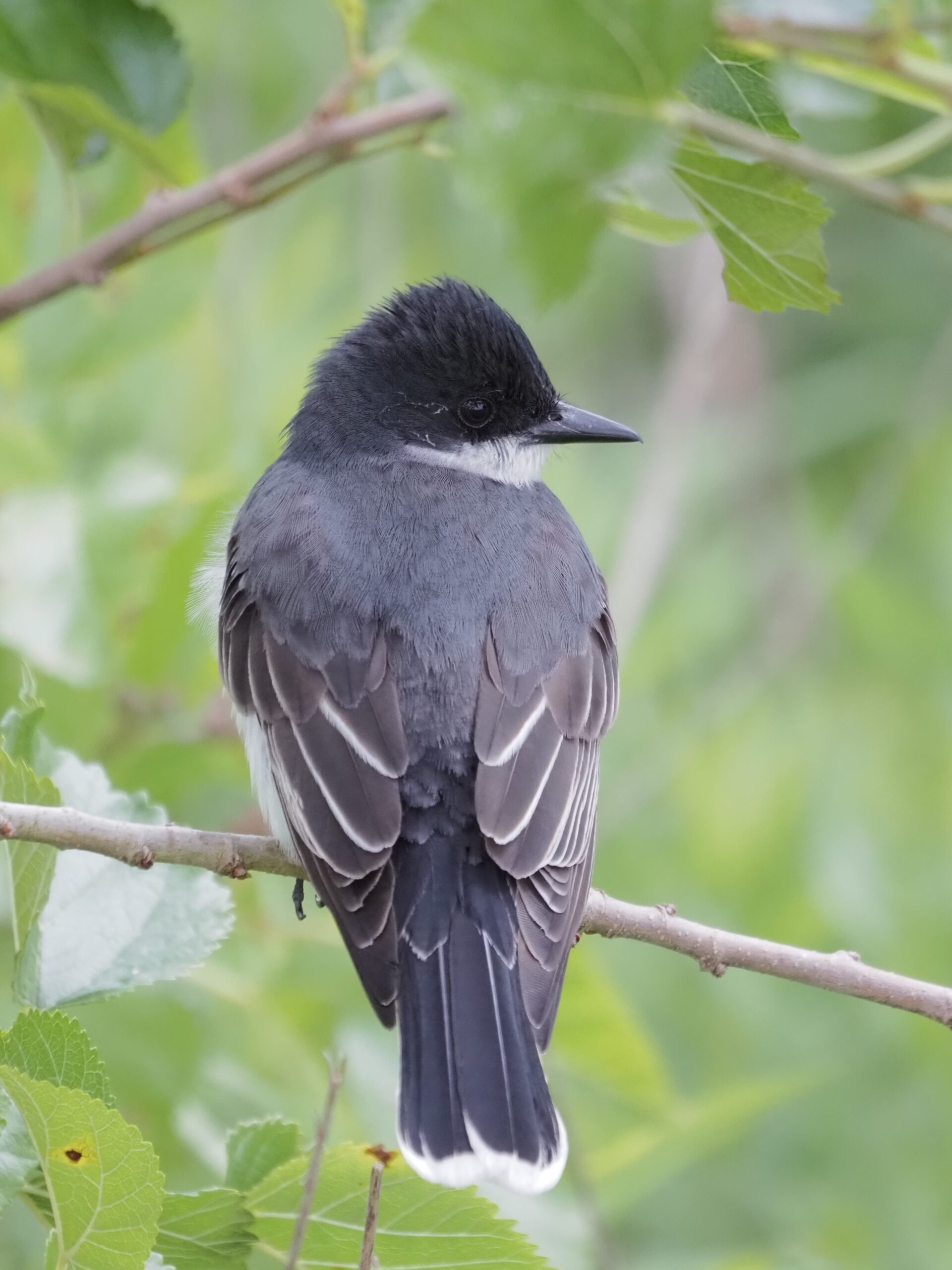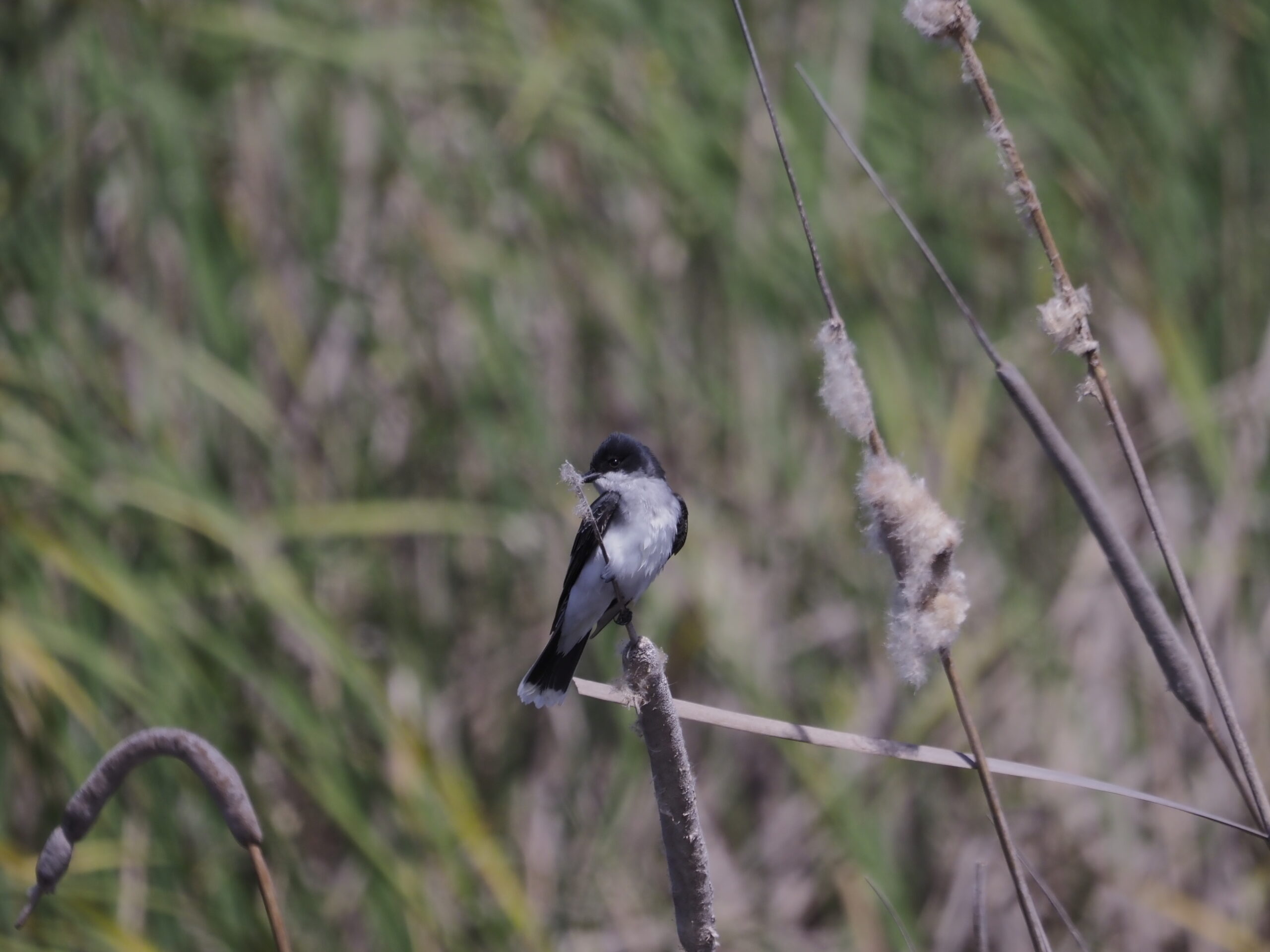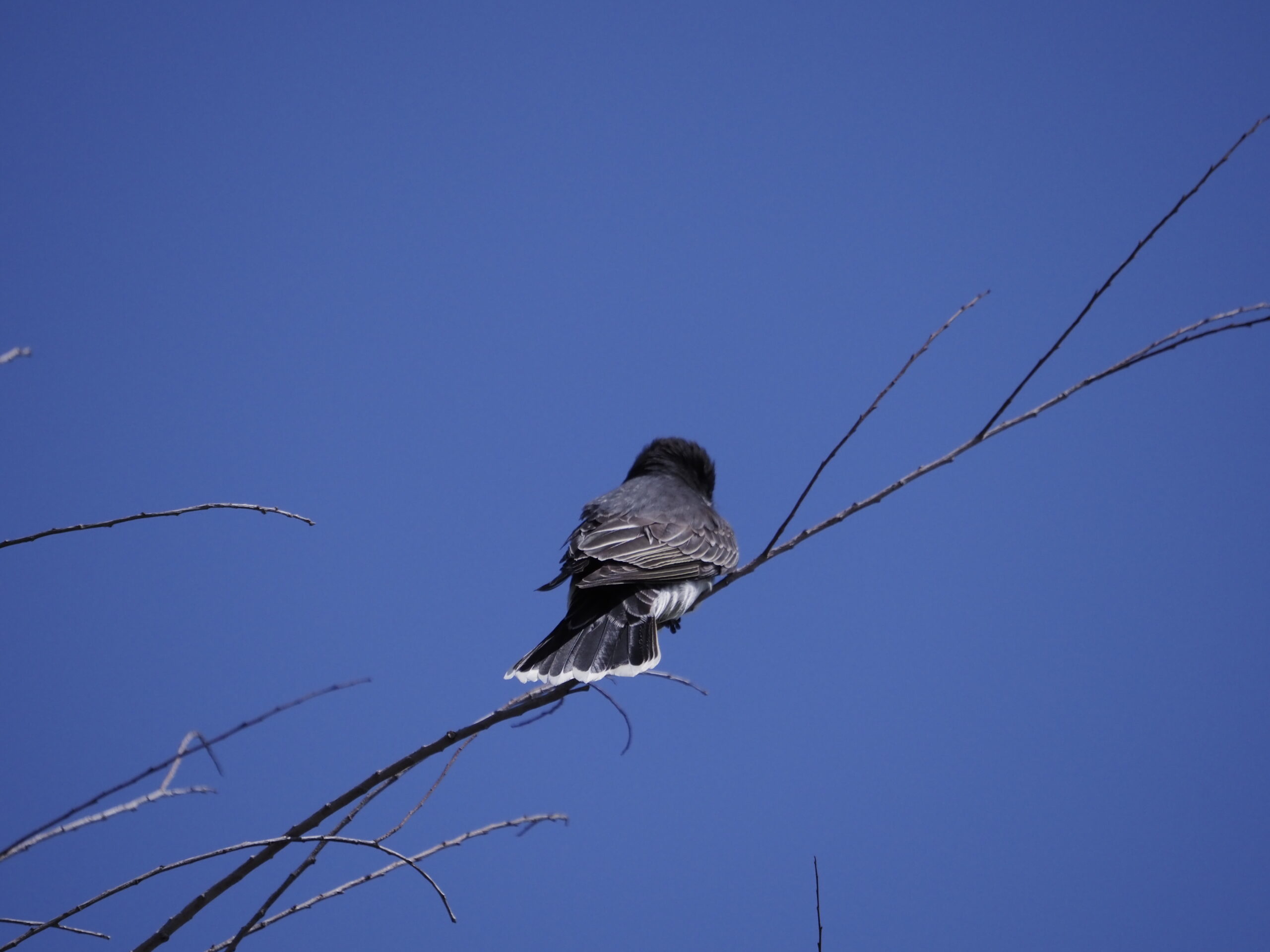 The Eastern Kingbird is a dapper black and white flycatcher with black or dark gray upper parts and white and pale gray lower parts. If seen fleetingly, the black tail with the white tip is a good clue, as are the distinctive, mostly dark underwings.