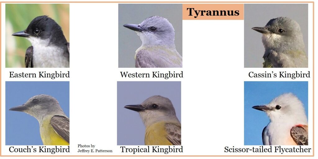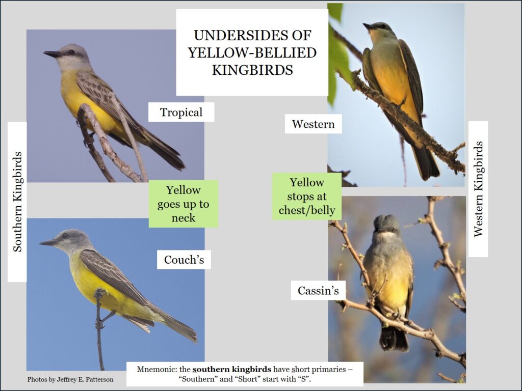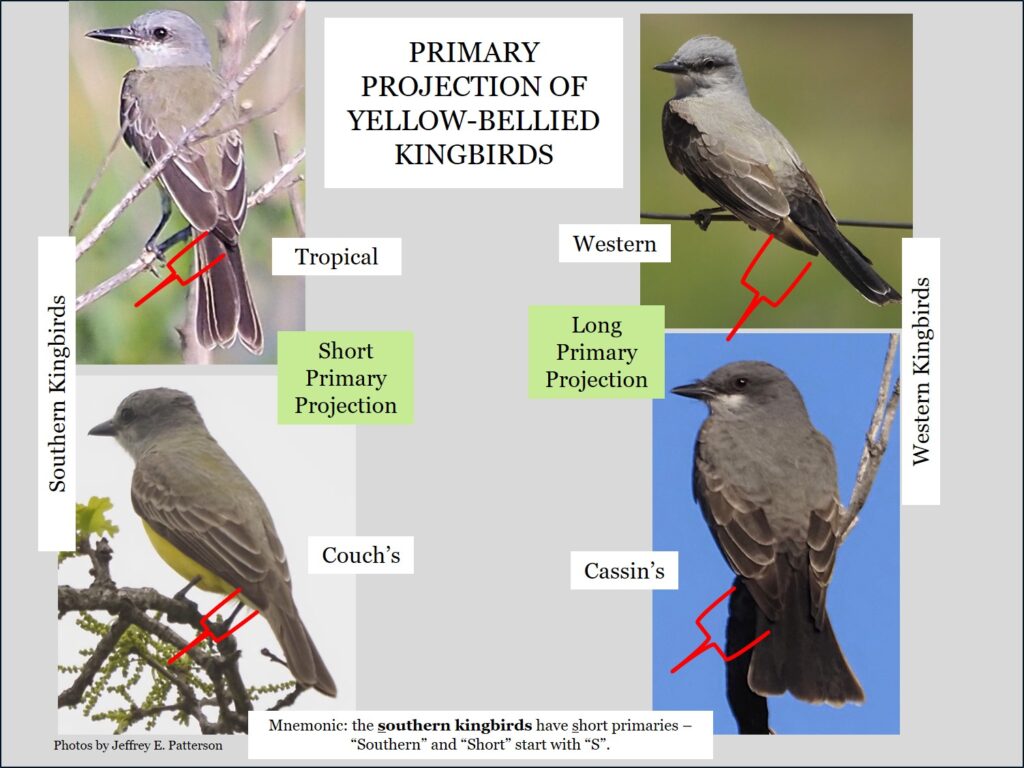 Couch’s & Tropical also have shorter primary projections than Western & Cassin’s. If one remembers the distribution of these kingbirds a mnemonic that may help recall primary lengths is “Southern Kingbirds have short primaries” (both “southern” and “short” start with “S”).
