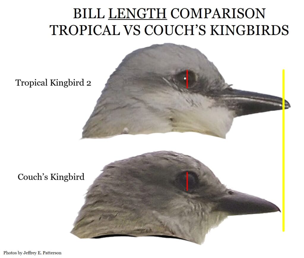 According to Lee & Birch the Couch’s has a “shorter, stouter bill than Tropical”, while the Tropical has a “long bill”.