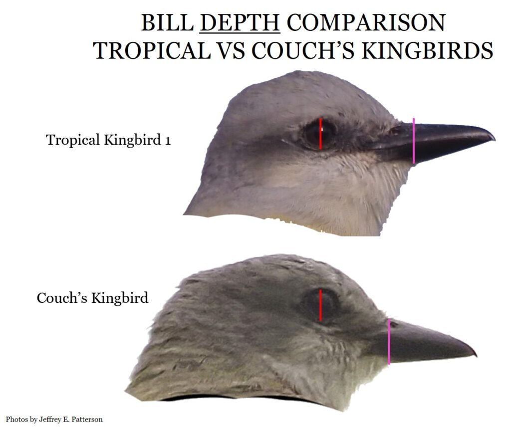 Finally, Lee & Birch state that the “Couch’s has a “shorter, broad-based bill than Tropical”. This field mark was also difficult to evaluate because most of the readily available photos in the MaCaulay Library are in profile. My only appropriate photo of the Couch’s is facing diagonal to the camera, but it does seem to be broader at the base in comparison to my Tropical photos.
