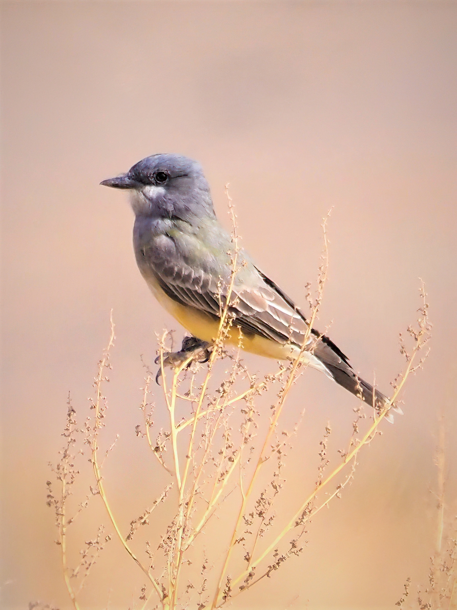 The best visual field mark on silent kingbirds is the usually dark gray breast, head & neck of the Cassin’s which contrasts markedly with the white cheek and throat. The Cassin’s white cheek is sharply restricted to even with the back of the eye, while the Western’s white cheek grades away more gradually, extends slightly behind the eye, and does not sharply contrast with the gray breast, head & neck.