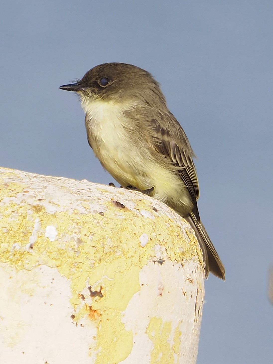 The Eastern Phoebe is readily identified by its almost lack of wingbars, its flycatcher bill, its faint yellow wash on belly and breast, it’s dark face and head, and especially its almost constant tail bobbing (see video below).