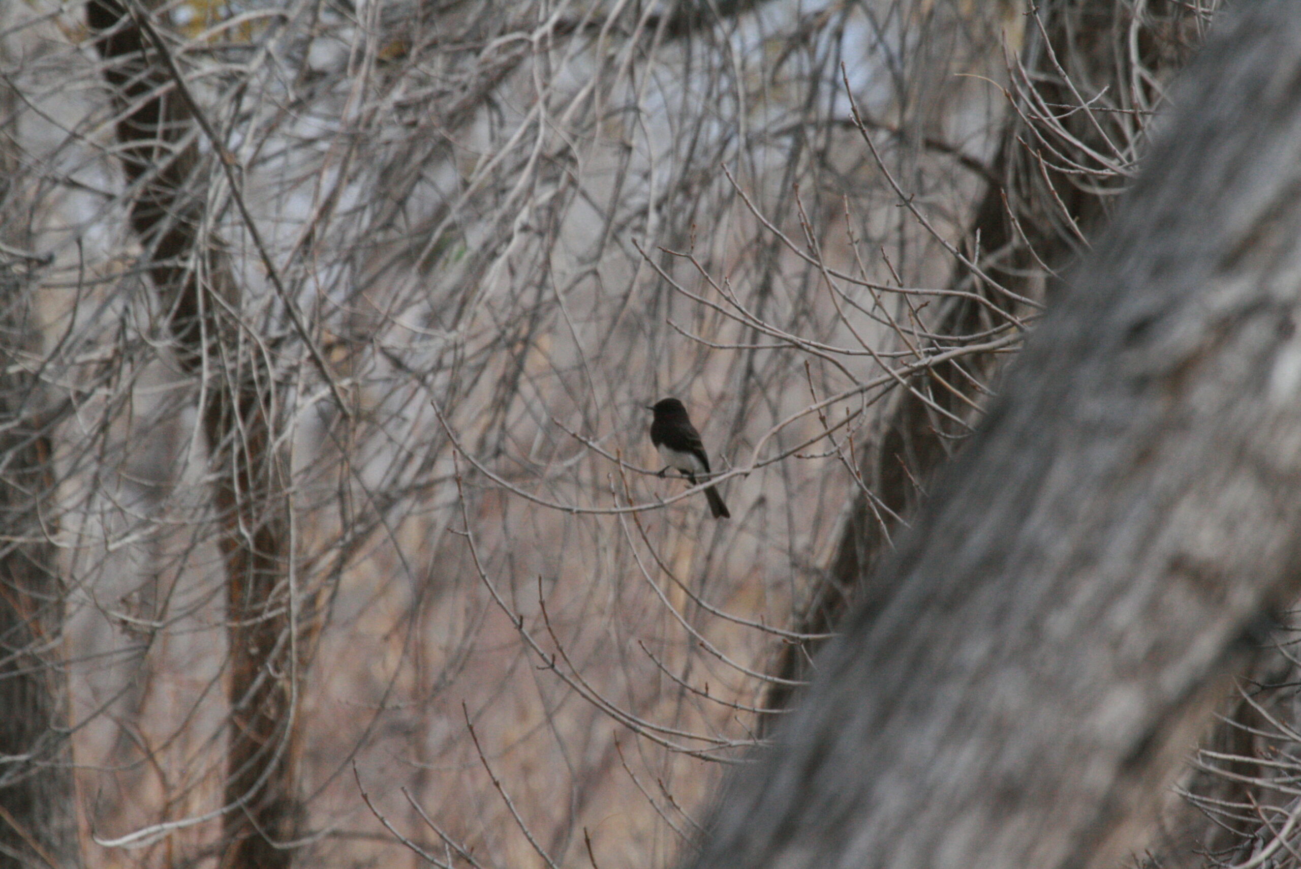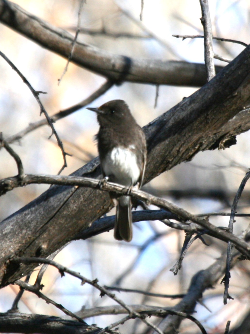 The Black Phoebe is a distinctive black & white bird, with an abrupt demarcation on the belly/breast between black and white. The upper parts are almost all black. At times it is possible to confuse the Black with the Eastern, however the Eastern has a dark face & head and a dingy, yellowish wash on the undersides, including the breast, whereas the Black has a sharp demarcation between a clean-white belly and a black breast.