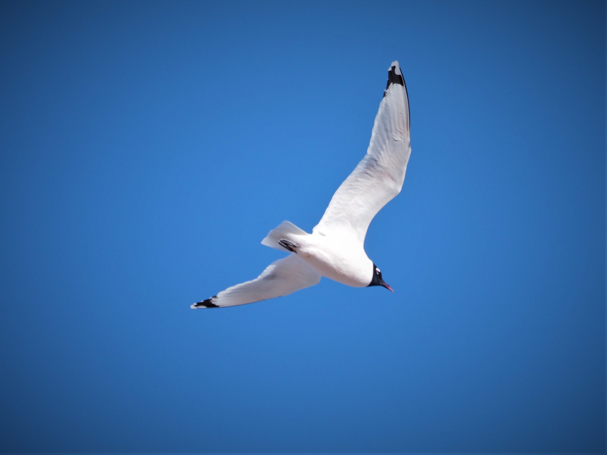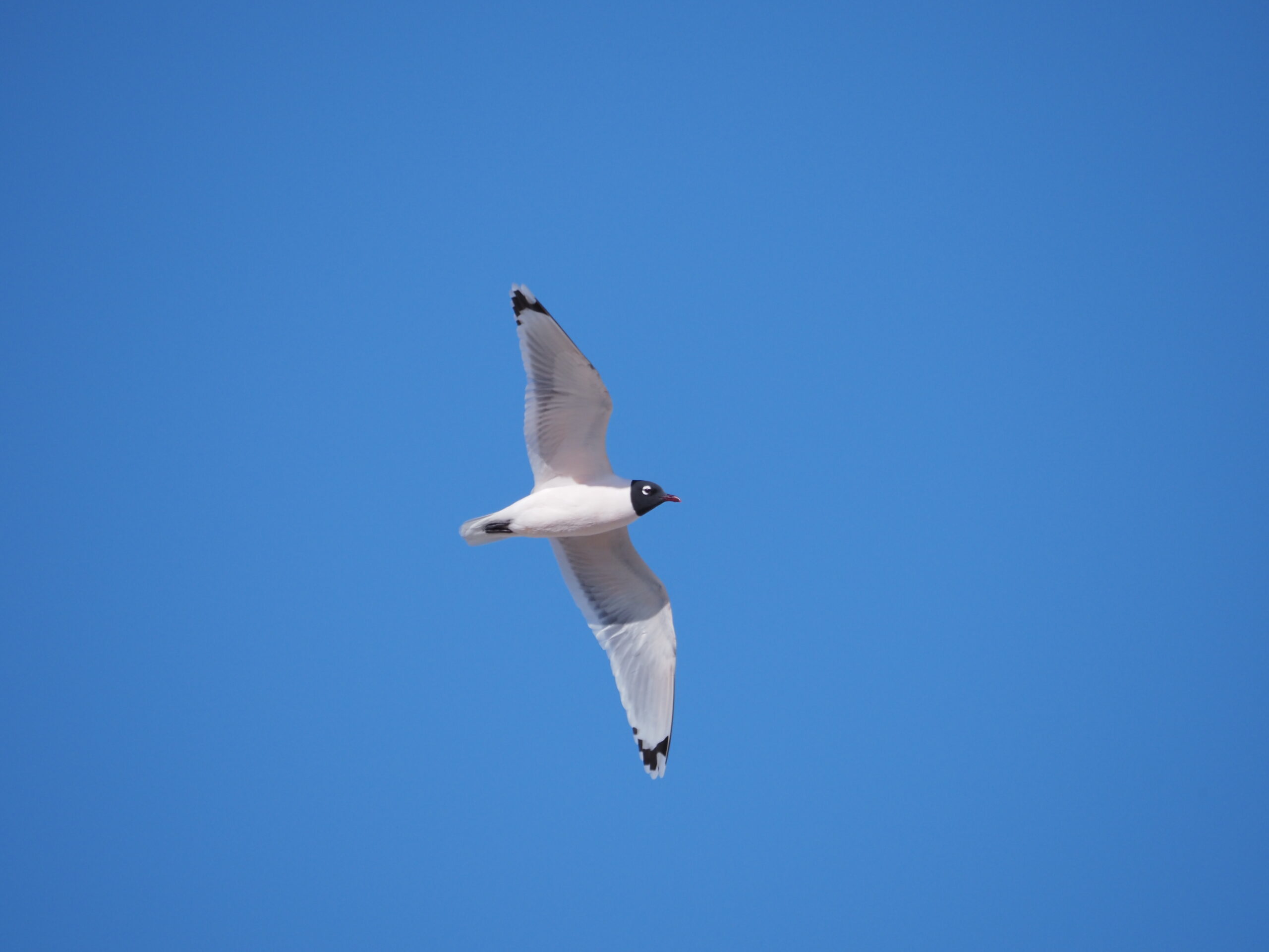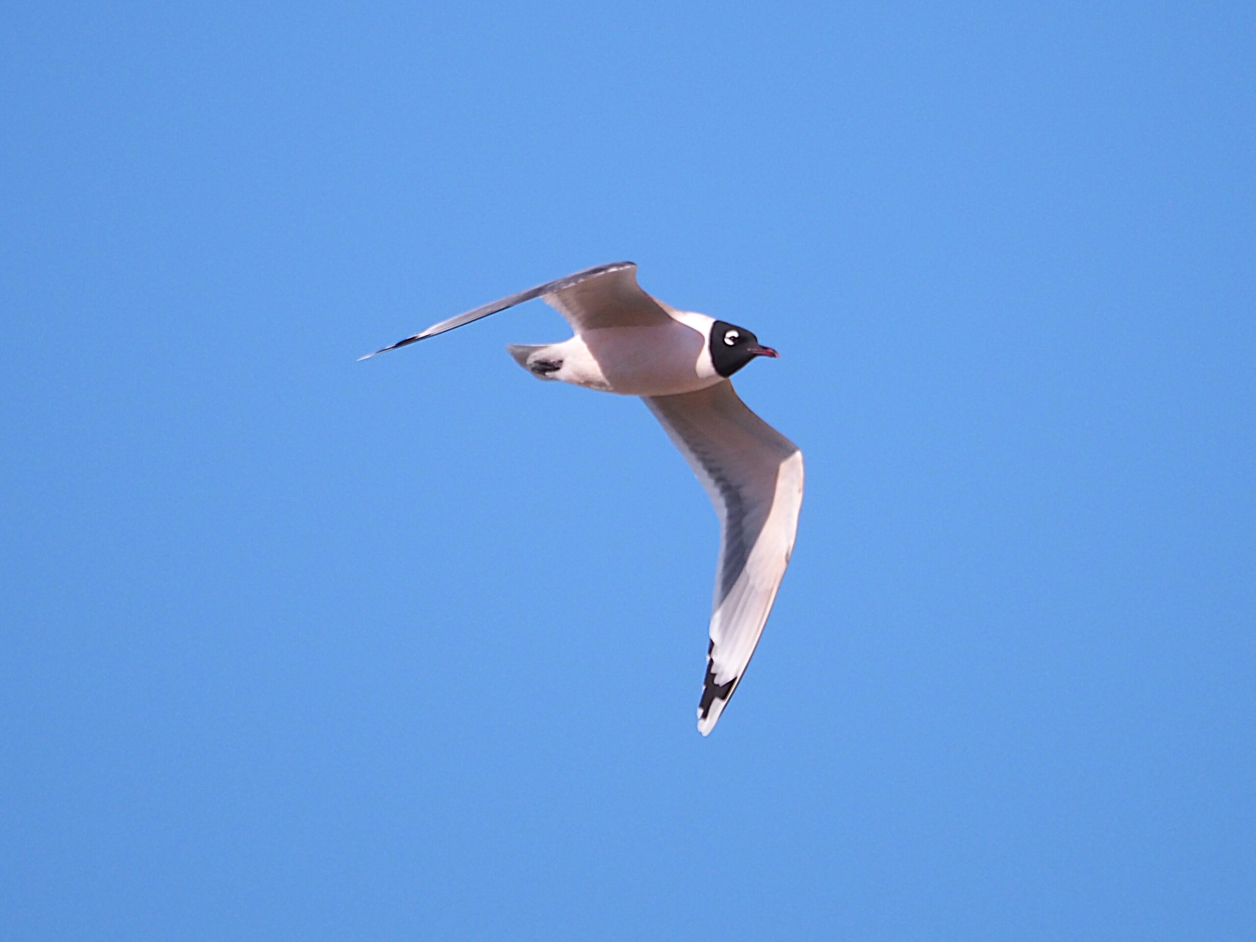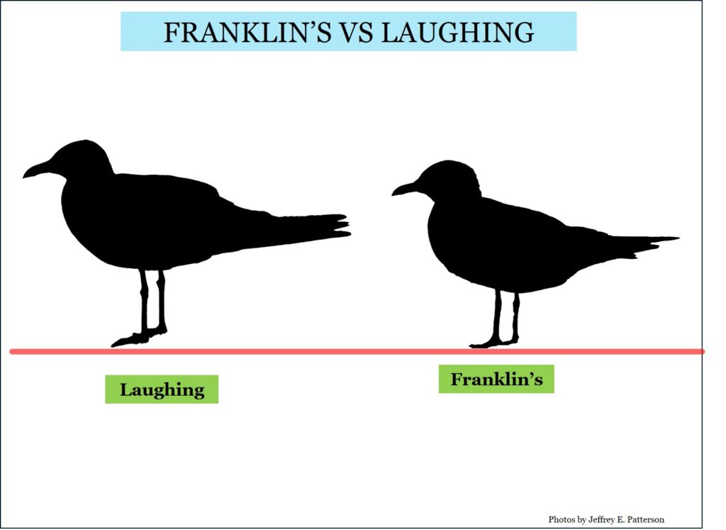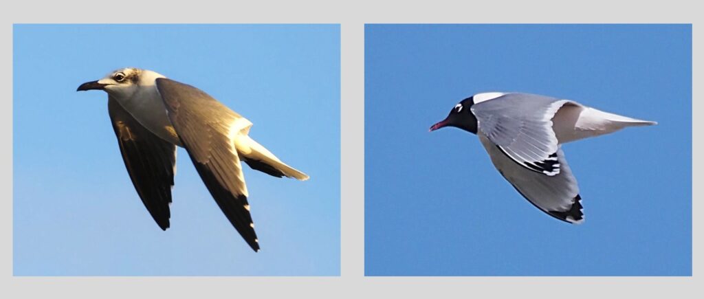 In flight the Franklin’s is easily distinguished from the Laughing by examination of the wingtips. The Laughing has long, pointed black wingtips, which slowly change to gray, then to white towards the body. But for the primary tips, the Franklin’s ventral wings are all white and the outer primary tips have a white-black-white pattern. The black on the primary tips is minimal compared to that of Laughing.