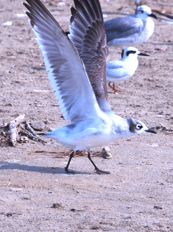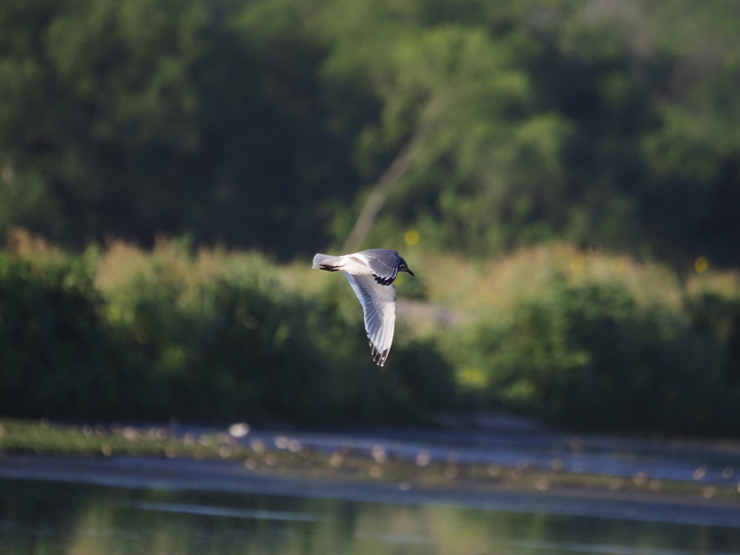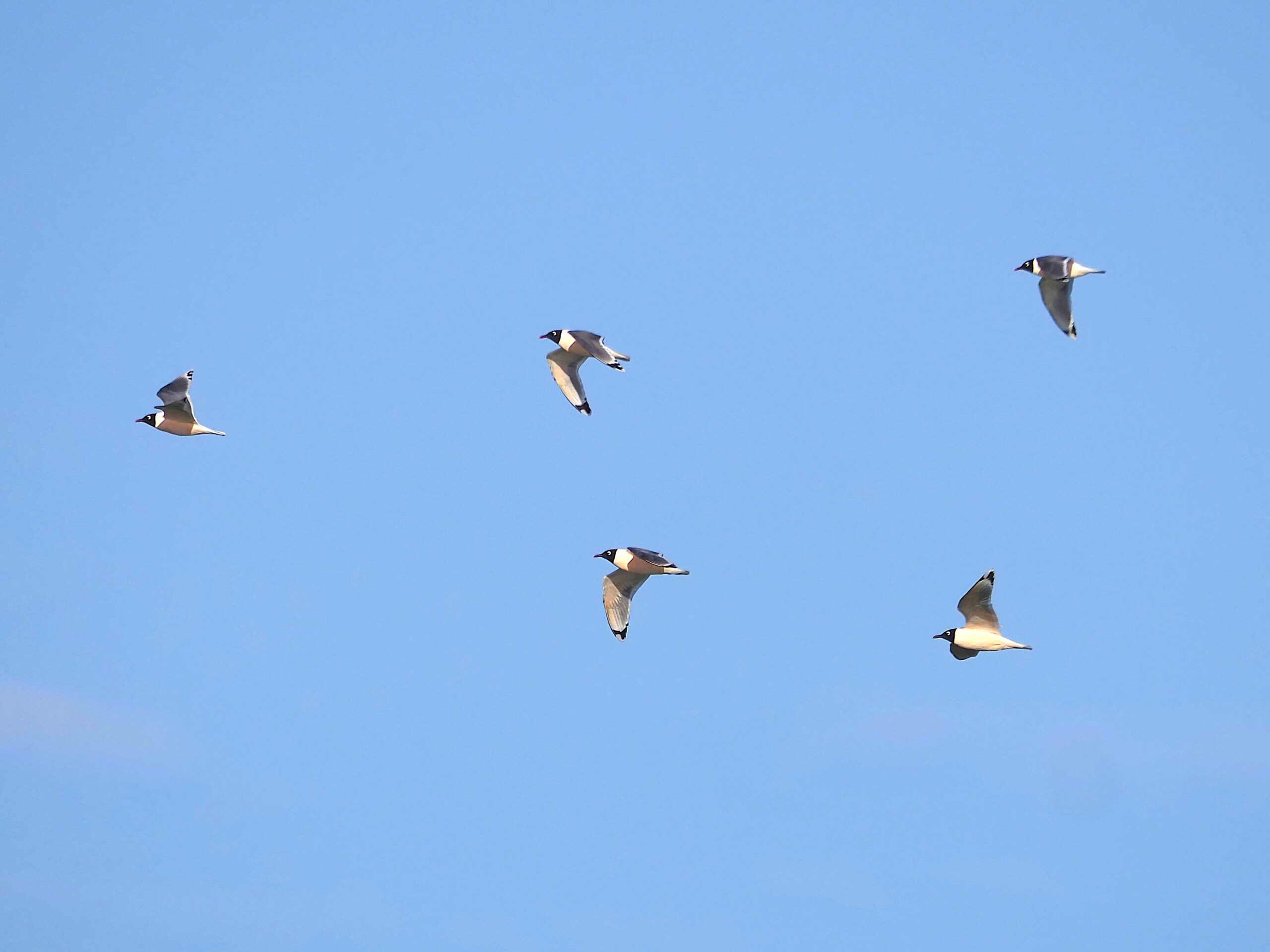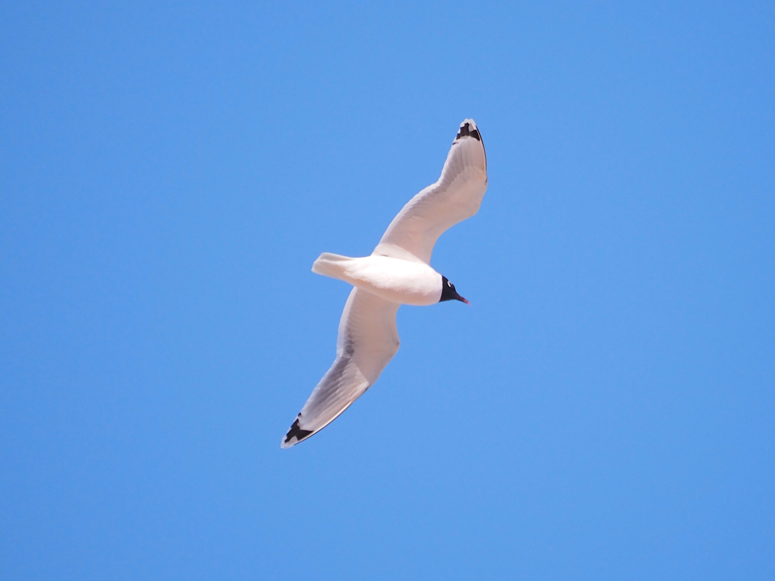 In flight the Franklin’s is easily distinguished from the Laughing by examination of the wingtips. The Laughing has long, pointed black wingtips, which slowly change to gray, then to white towards the body. But for the primary tips, the Franklin’s ventral wings are all white and the outer primary tips have a white-black-white pattern. The black on the primary tips is minimal compared to that of Laughing.