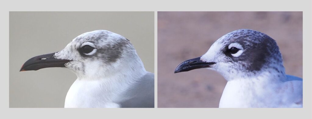 The images below compares the bill and head of Laughing and Franklin’s in basic plumage. Note the shorter, less drooping bill, the rounder head, the bolder eye-arcs, and the more extensive black cap-remnants on Franklin’s.