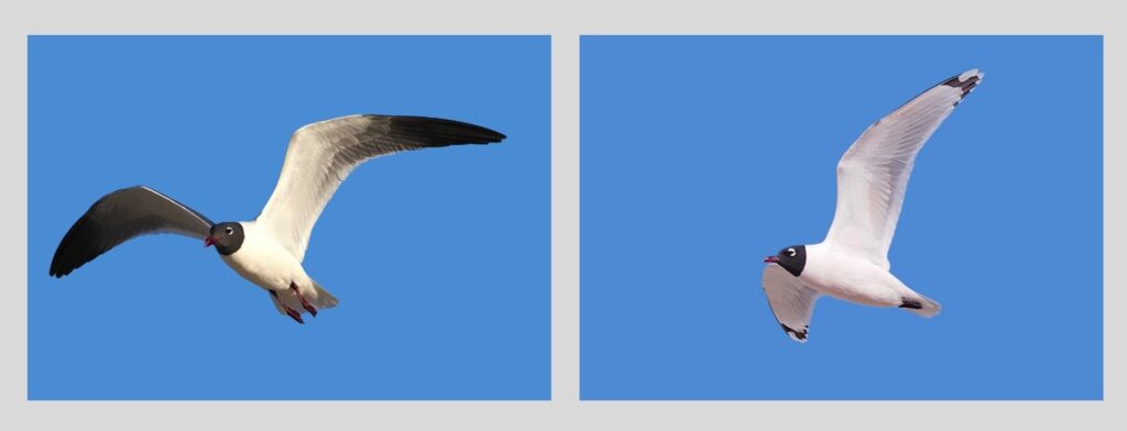 The dorsal wingtip patterns on the two species is similar to the ventral. A white band, then a black band, and white tips (formed by the apical spots) on the Franklin’s and mostly black and pointy on the Laughing.