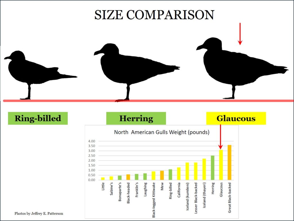 The word “glaucous” describes a light, bluish-gray color, which is apt for the adult back color of this large gull. The Glaucous Gull is the 2nd largest gull in the world; smaller than only the Great Black-backed Gull (GBBG); some large Glaucous even exceed the size of some GBBGs. So comparative size is the first clue to ID.