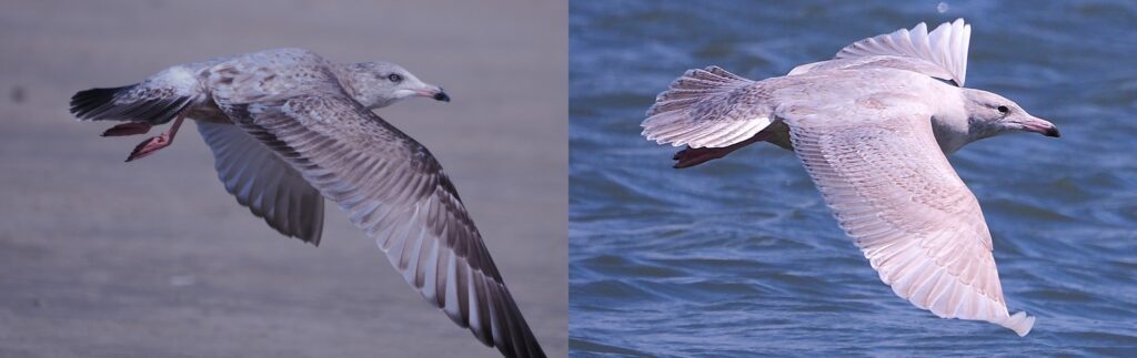 In flight the Glaucous’s wide-at-the-base wings are apparent, as compared to the Herring below.