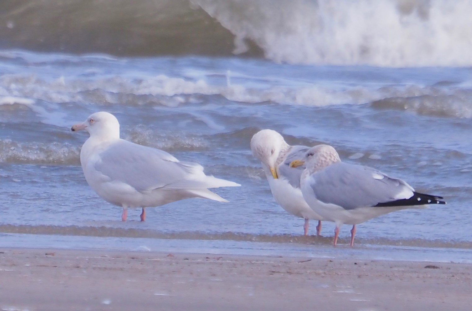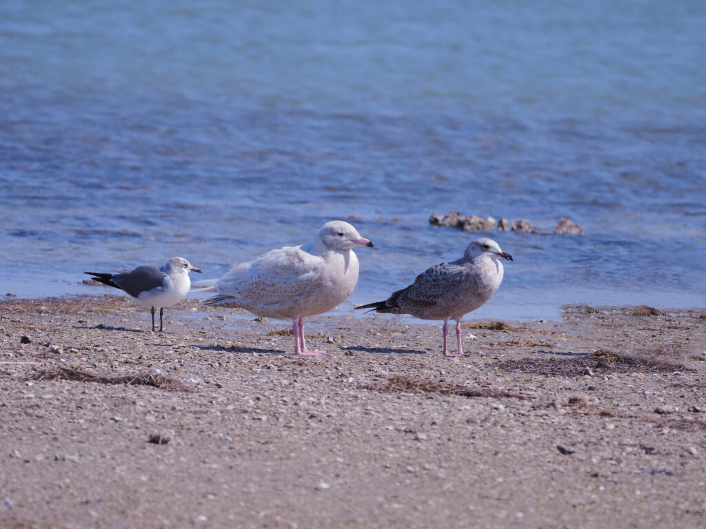 This 1st year Glaucous below, spent at least February-June of 2024 in Corpus Christi. The Herring is usually considered a large gull, but the individual on the right (below) was dwarfed by this robust young Glaucous.