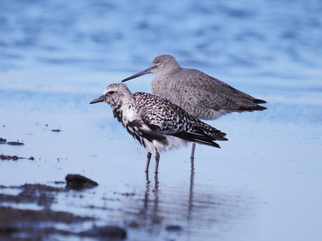 The Black-bellied Plover is a fairly large shorebird. It is compared here to a Eastern Willet.