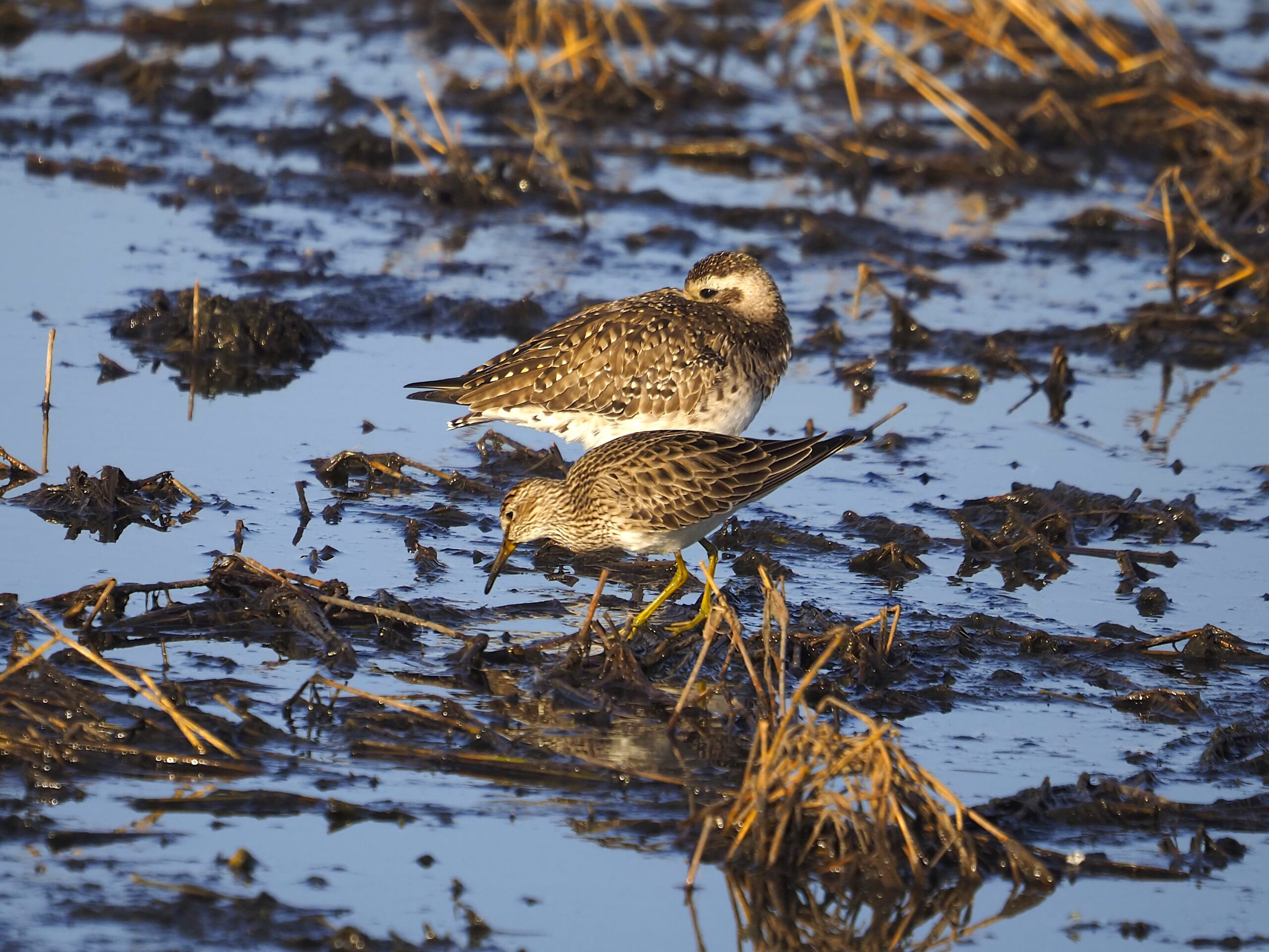 This is a composite photo. Note the bulkier build, thicker neck, thicker bill and shorter wings of the Black-bellied on the left.