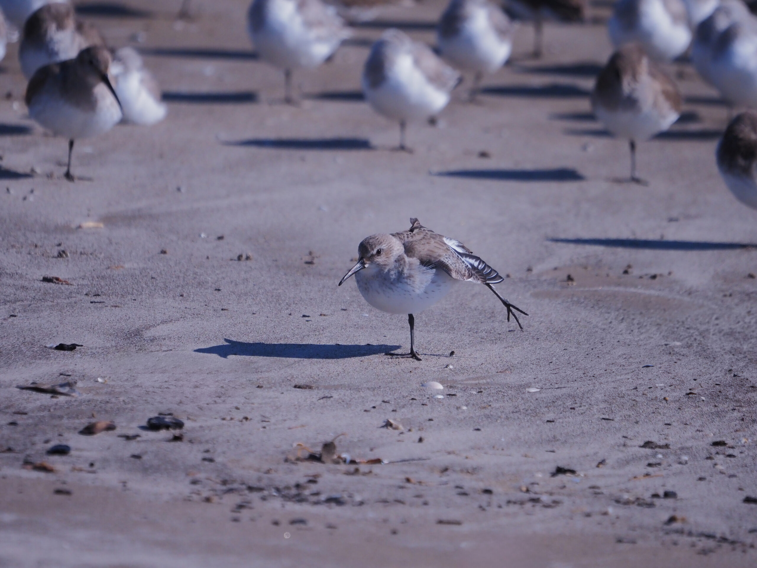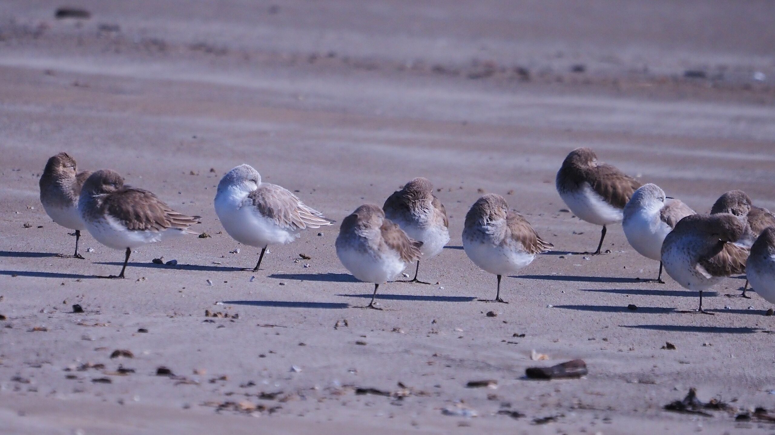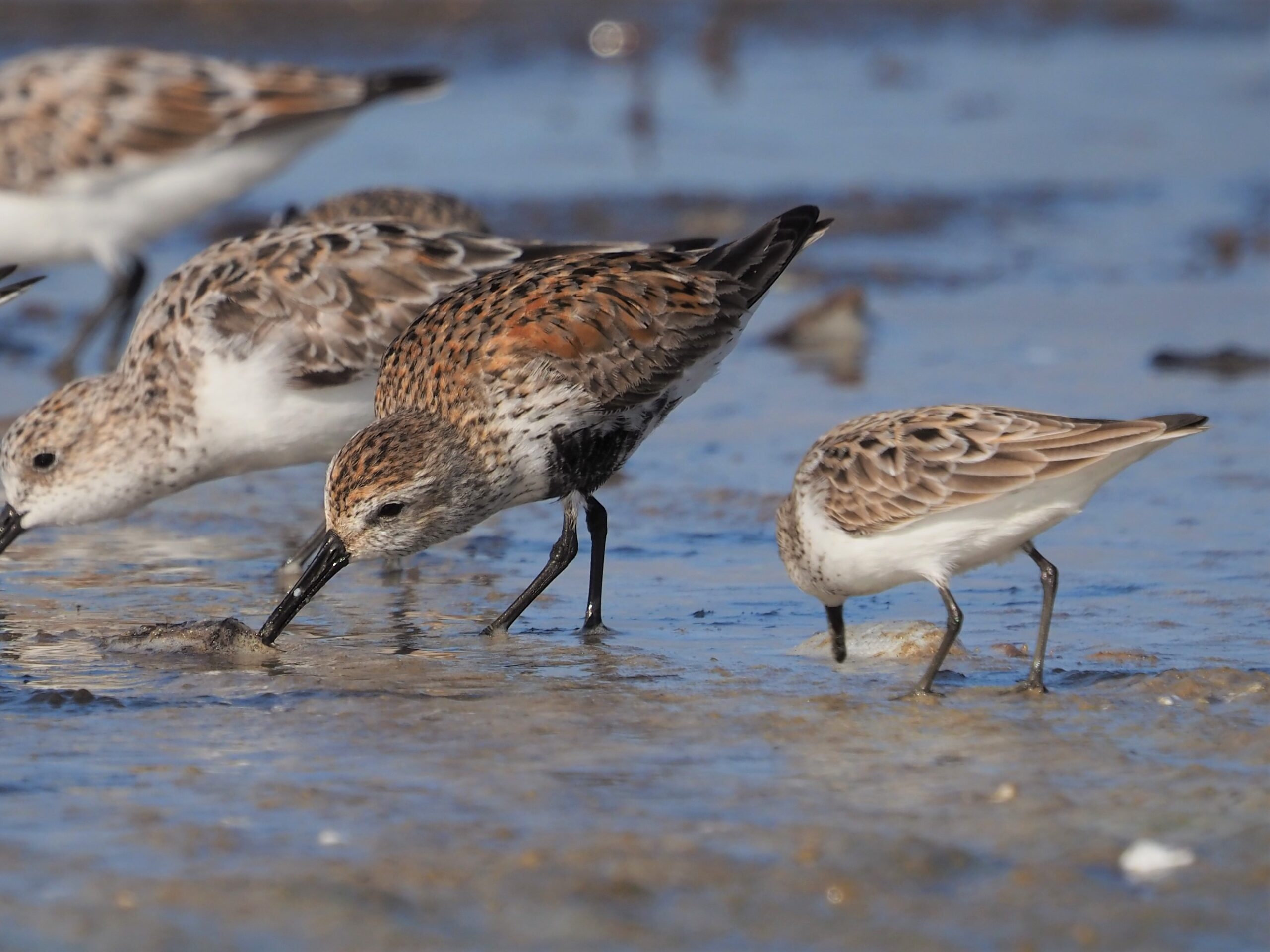 Dunlin are also common on the Texas Coast in winter in their basic plumage. One photo shows a much paler Sanderling with a group of Dunlin.