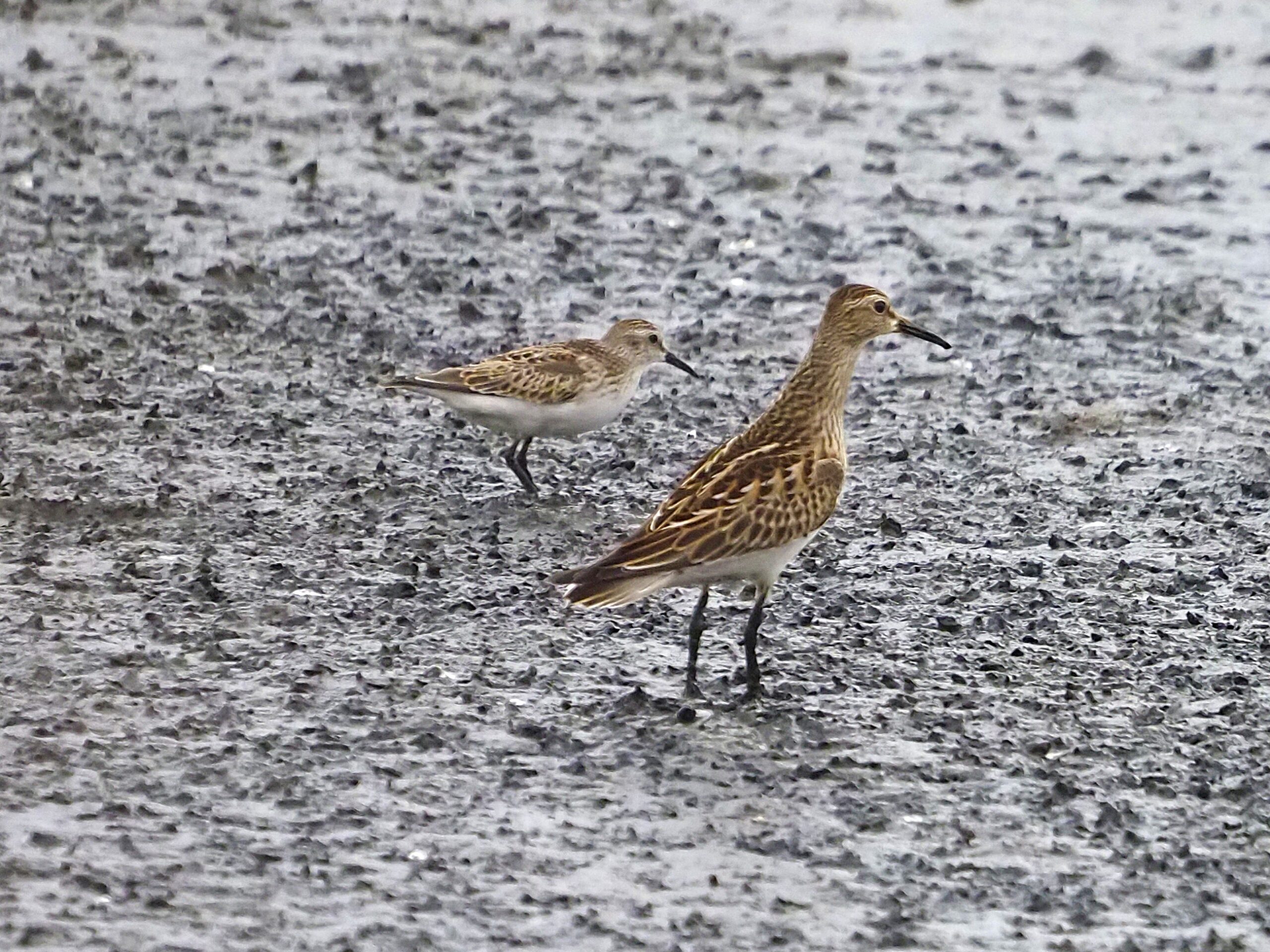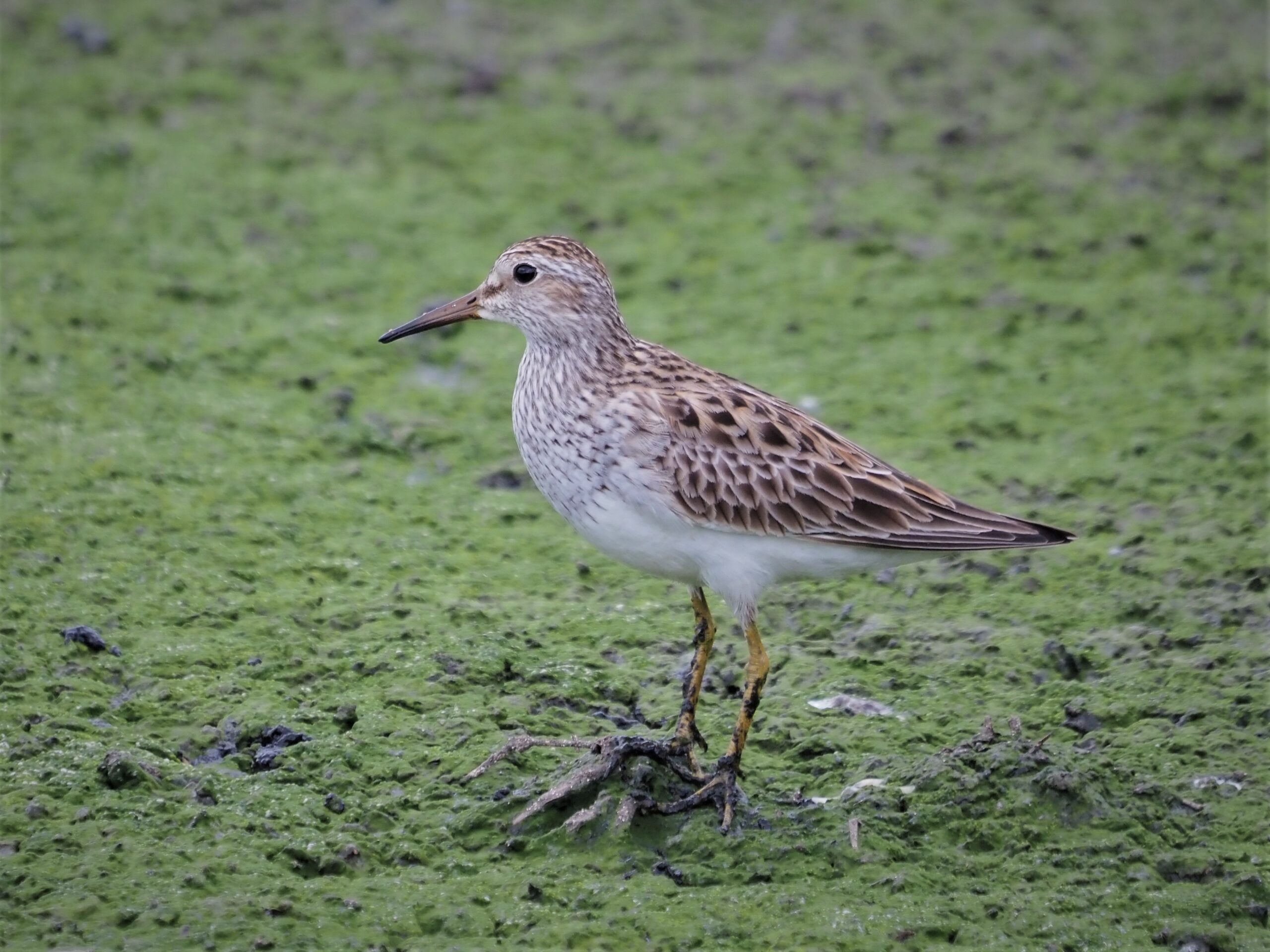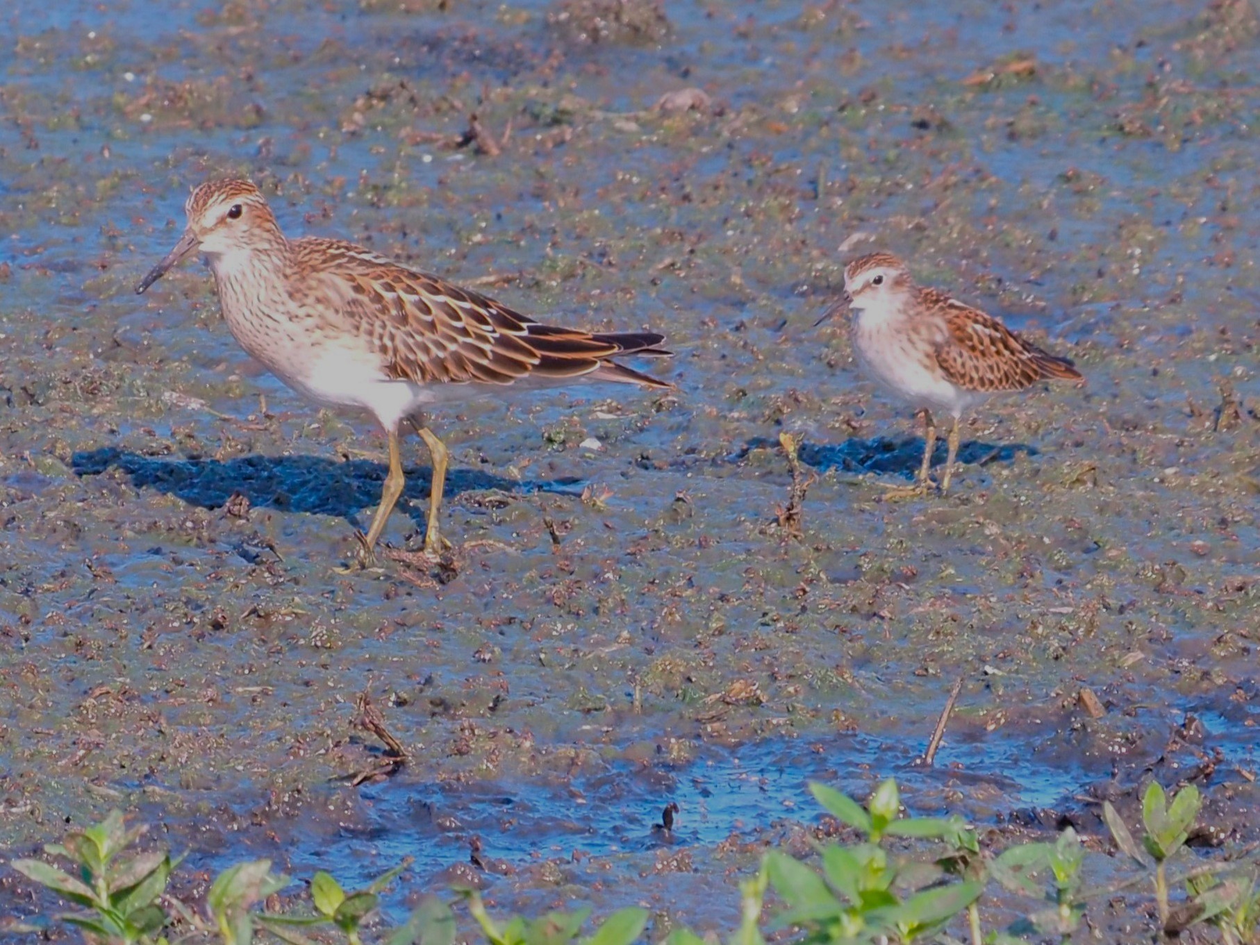 The Pectoral is sometimes described as “a very large Least”. It shares the brownish tones, yellow legs and slightly down-curved, medium length bill with the Least. However, as seen below it is much larger and longer-legged. One photo also shows the Pectoral compared to the Semipalmated Sandpiper and Lesser Yellowlegs.