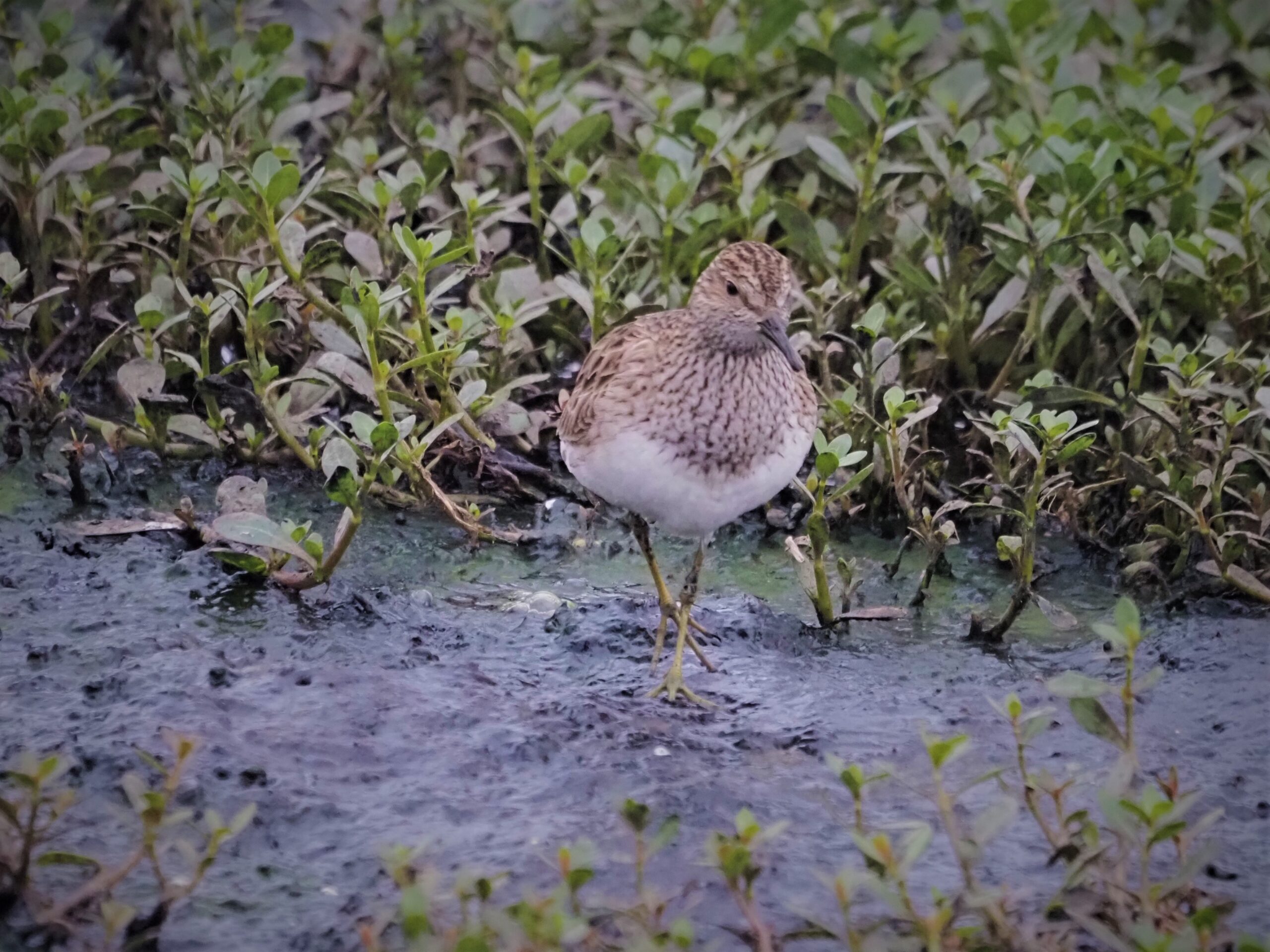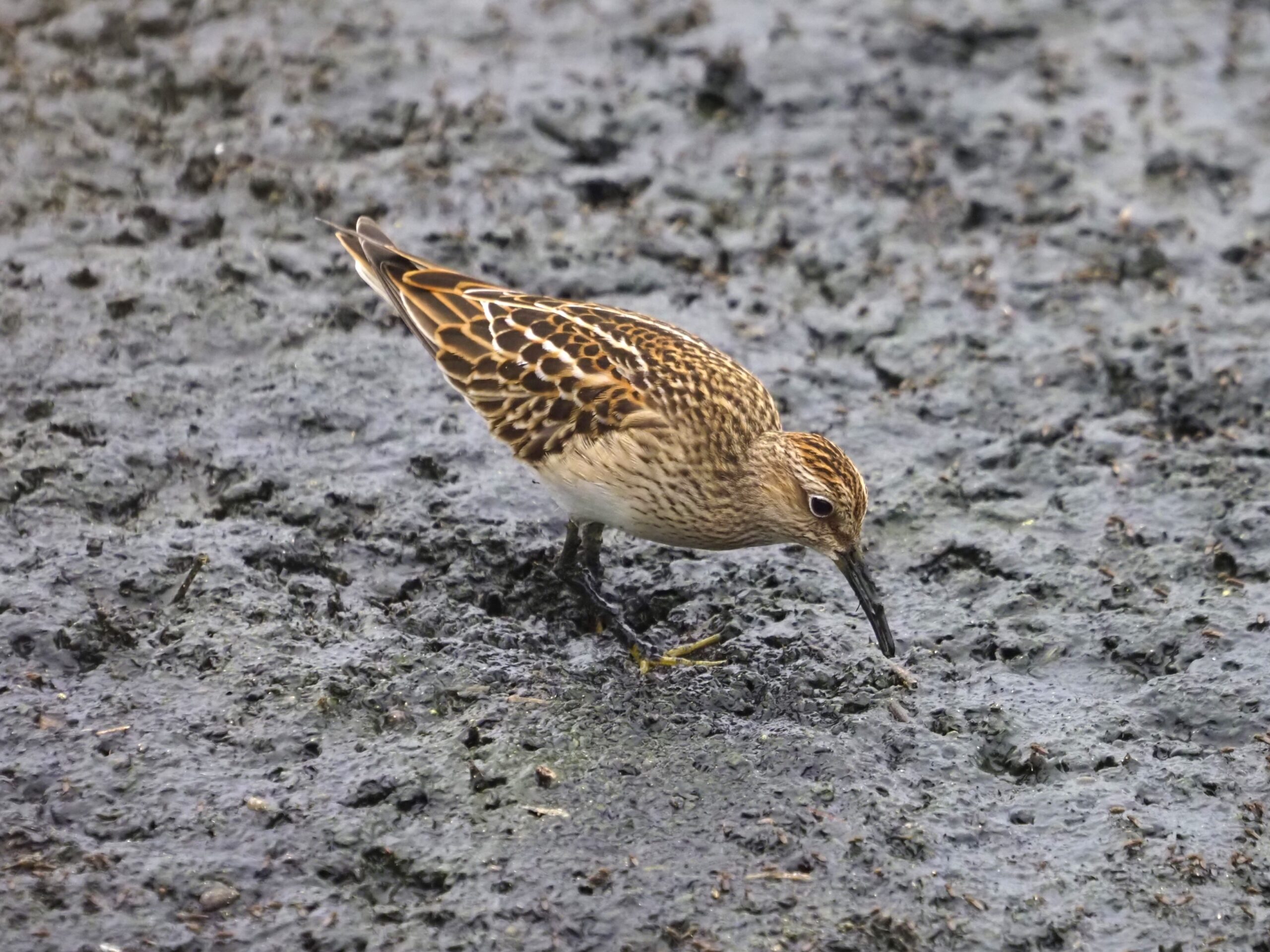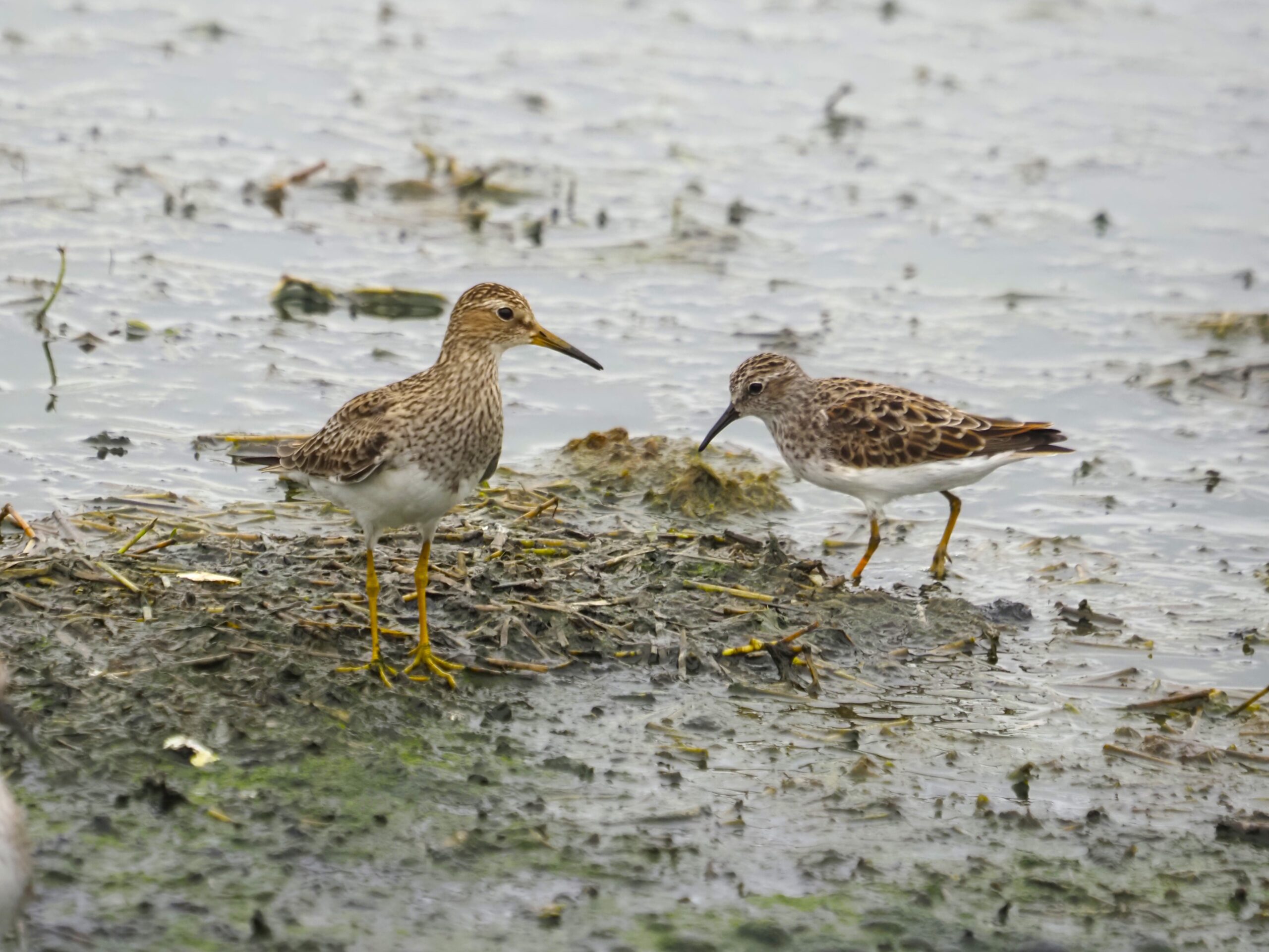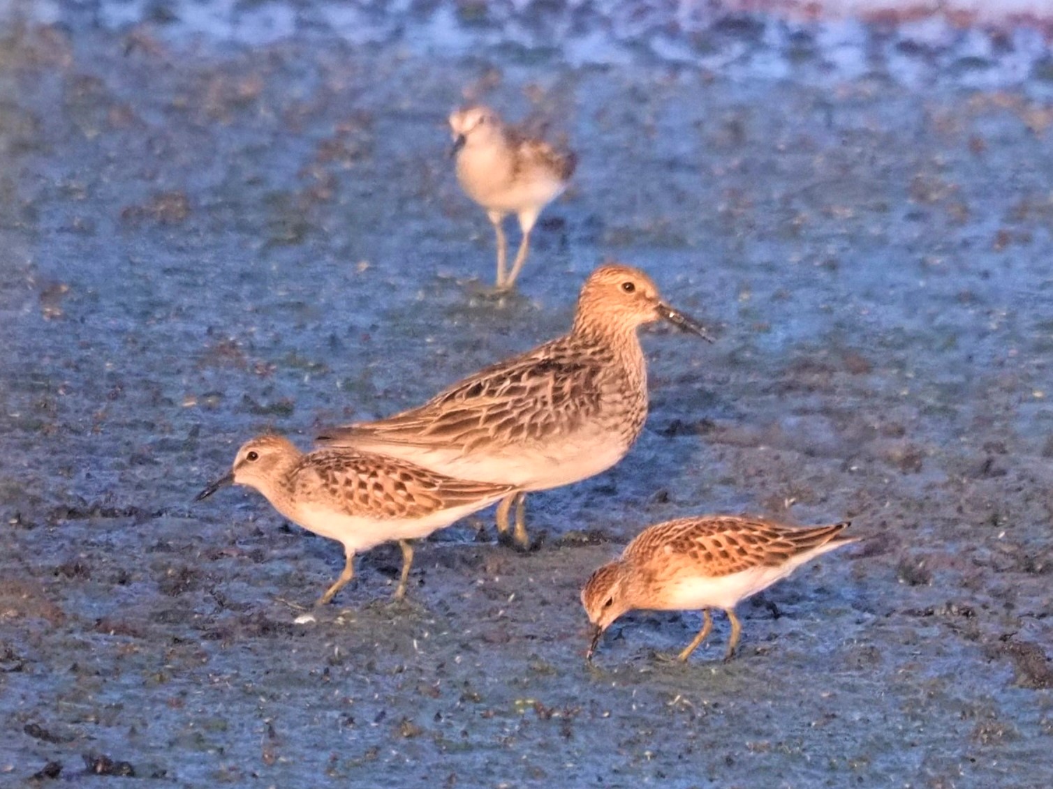 The Pectoral is sometimes described as “a very large Least”. It shares the brownish tones, yellow legs and slightly down-curved, medium length bill with the Least. However, as seen below it is much larger and longer-legged. One photo also shows the Pectoral compared to the Semipalmated Sandpiper and Lesser Yellowlegs.