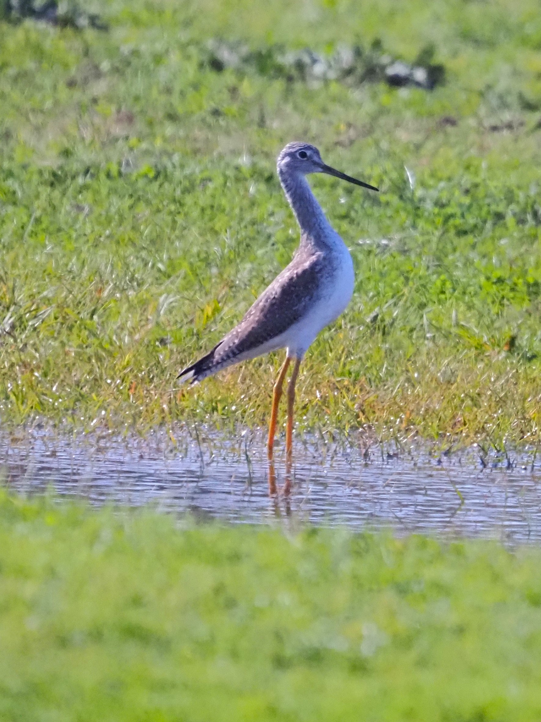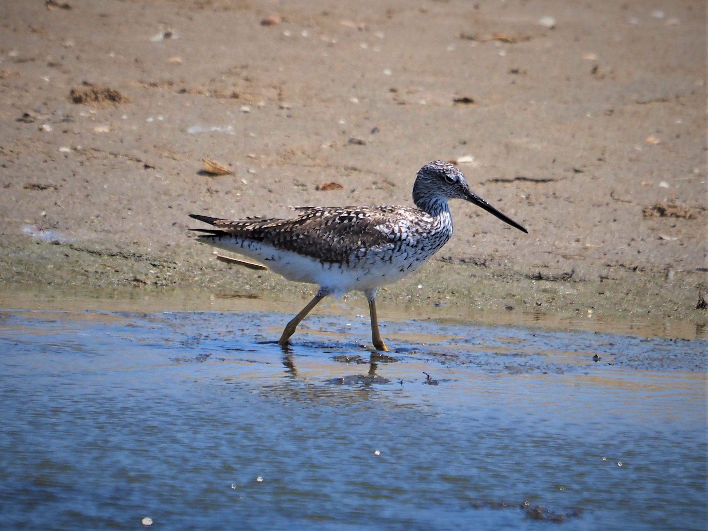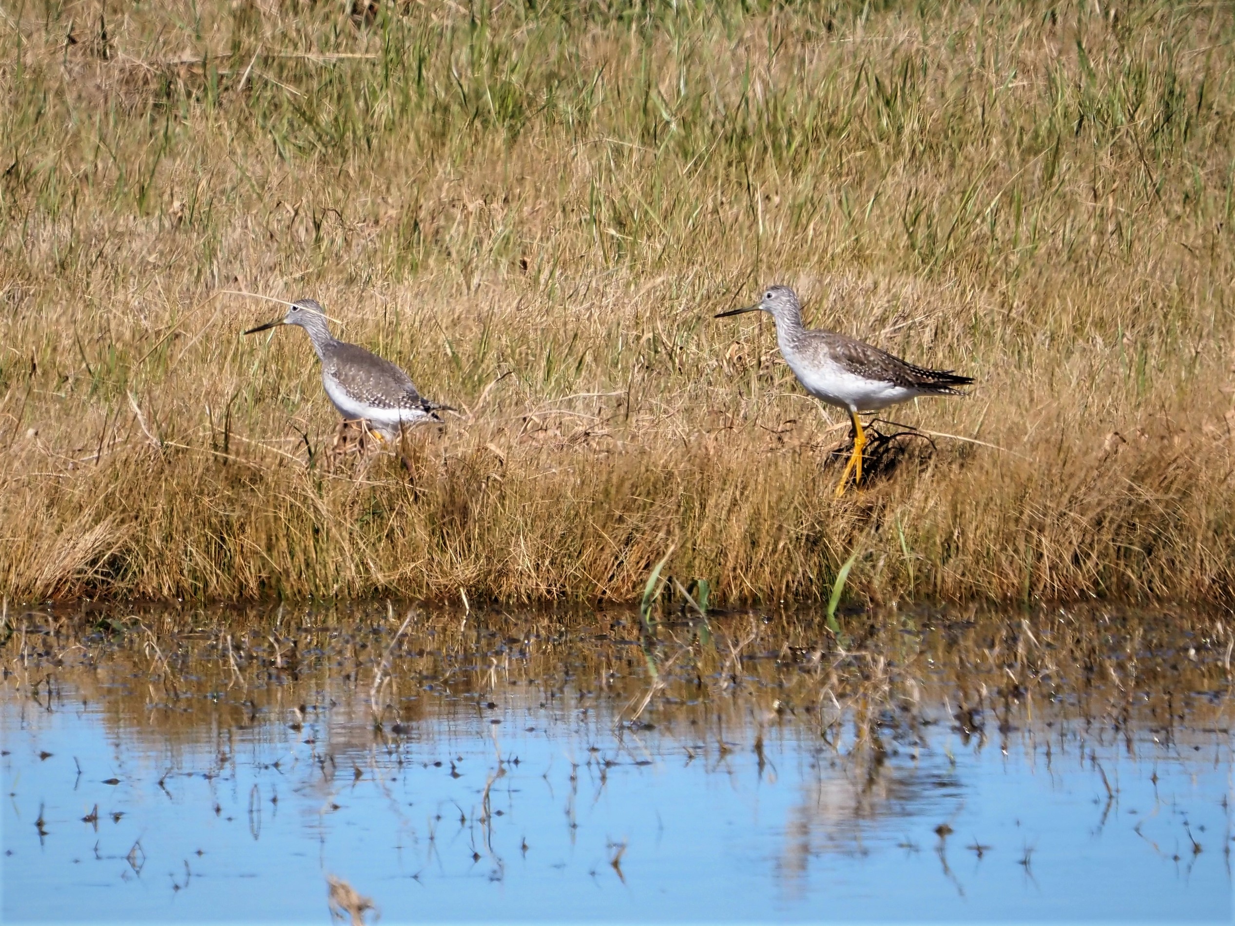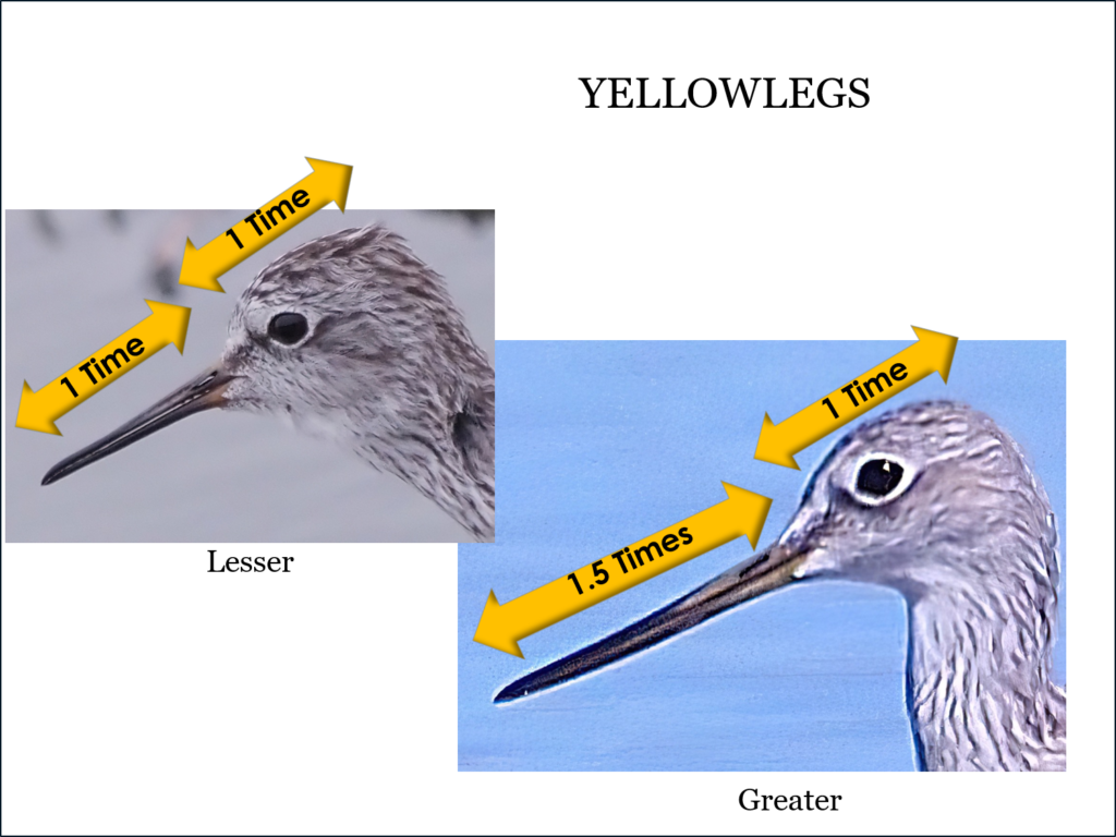 The Greater and Lesser Yellowlegs can be distinguished by comparison of the bill length with the length of the head. As shown below, the Lesser’s bill is approximately the same length as the head is wide, while the Greater’s bill is about 1.5 times the width of the head.