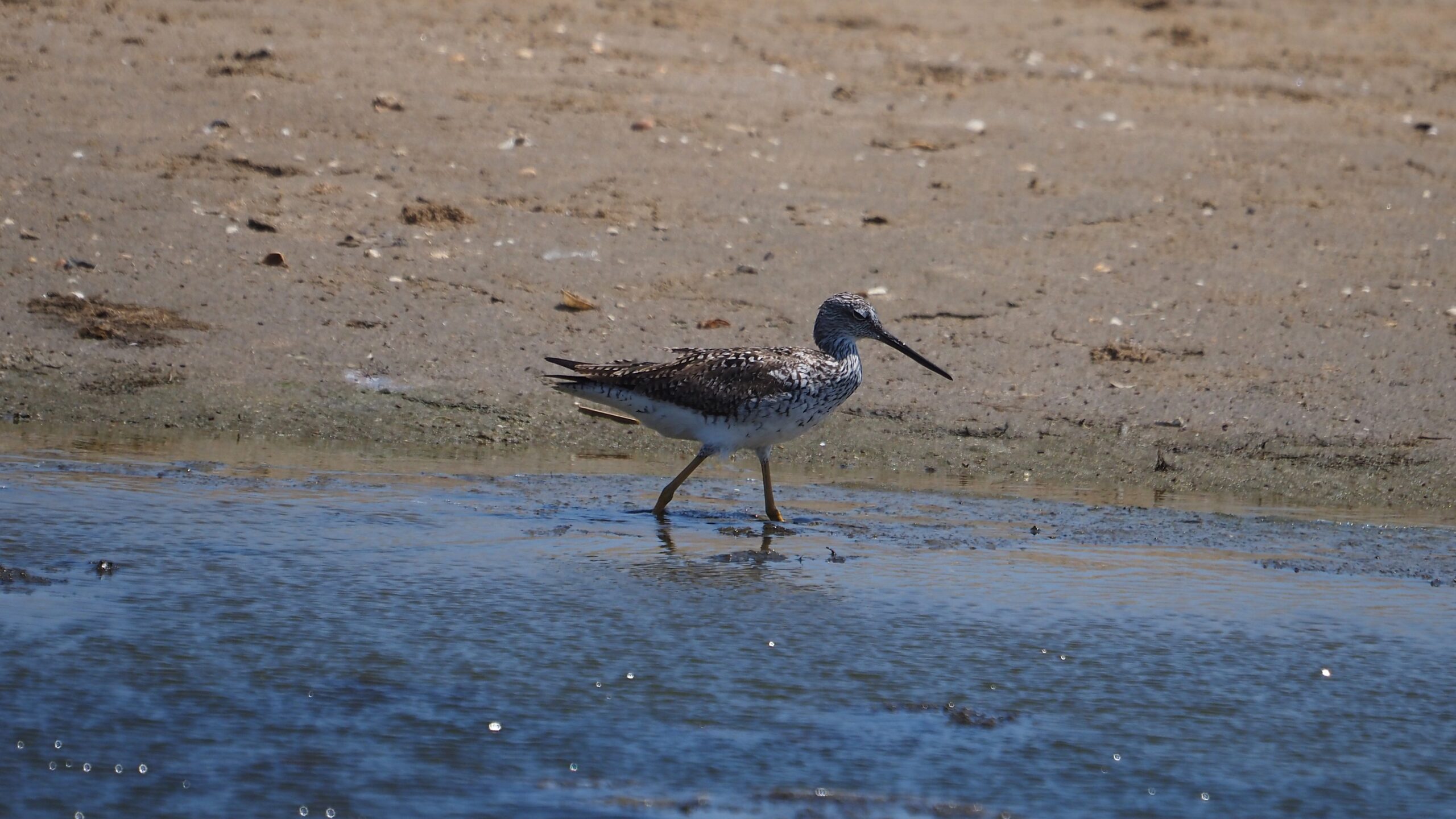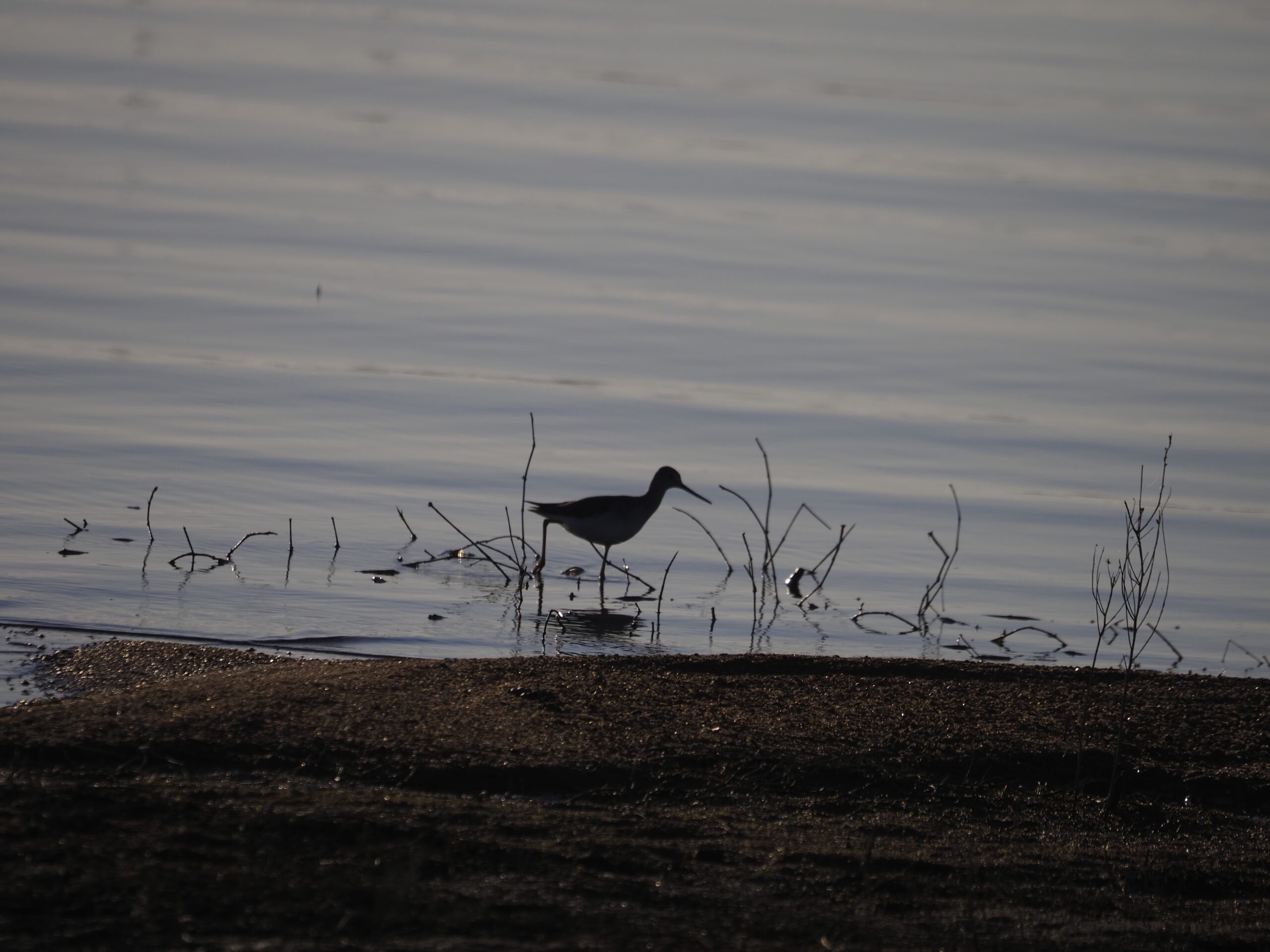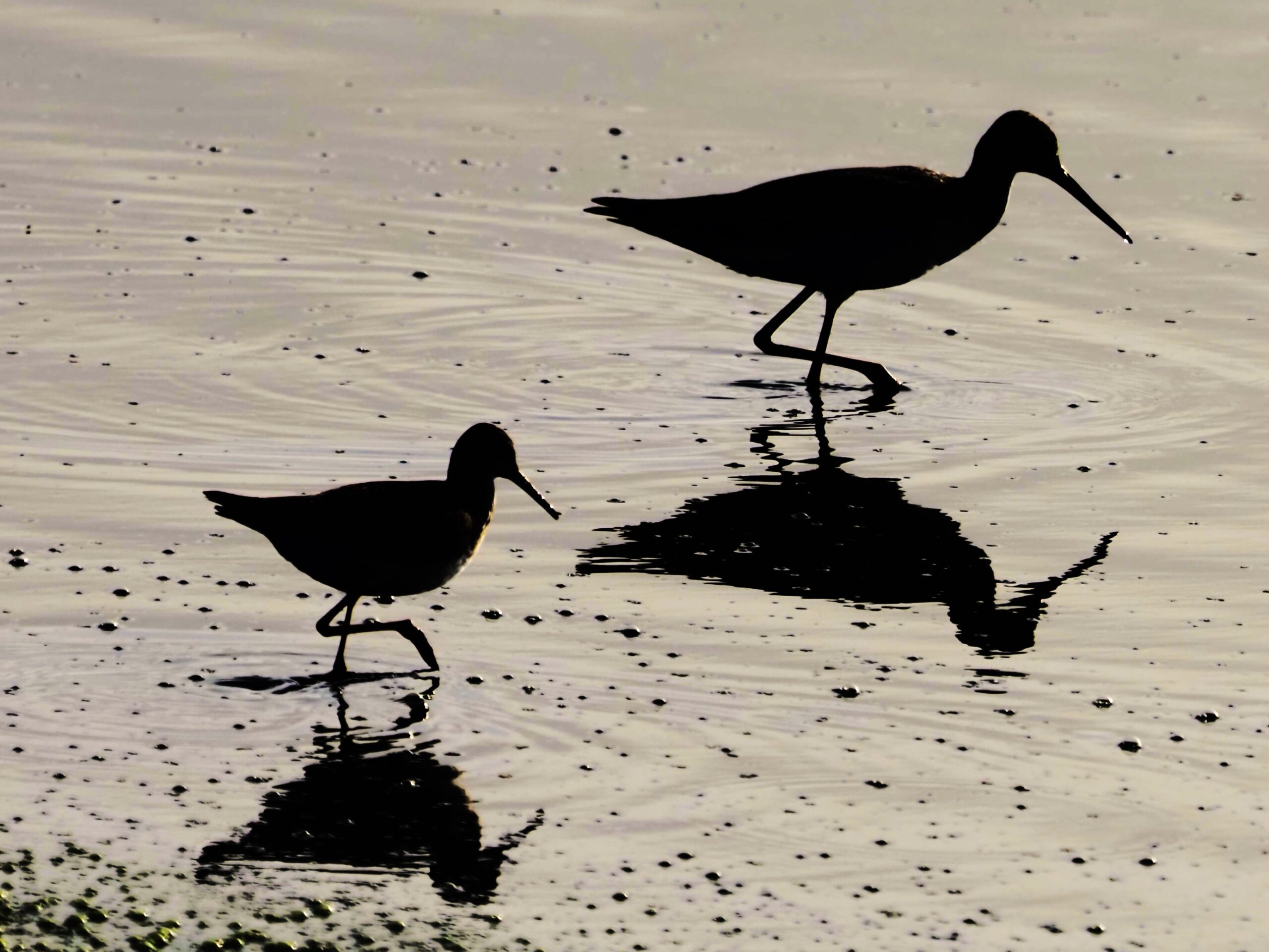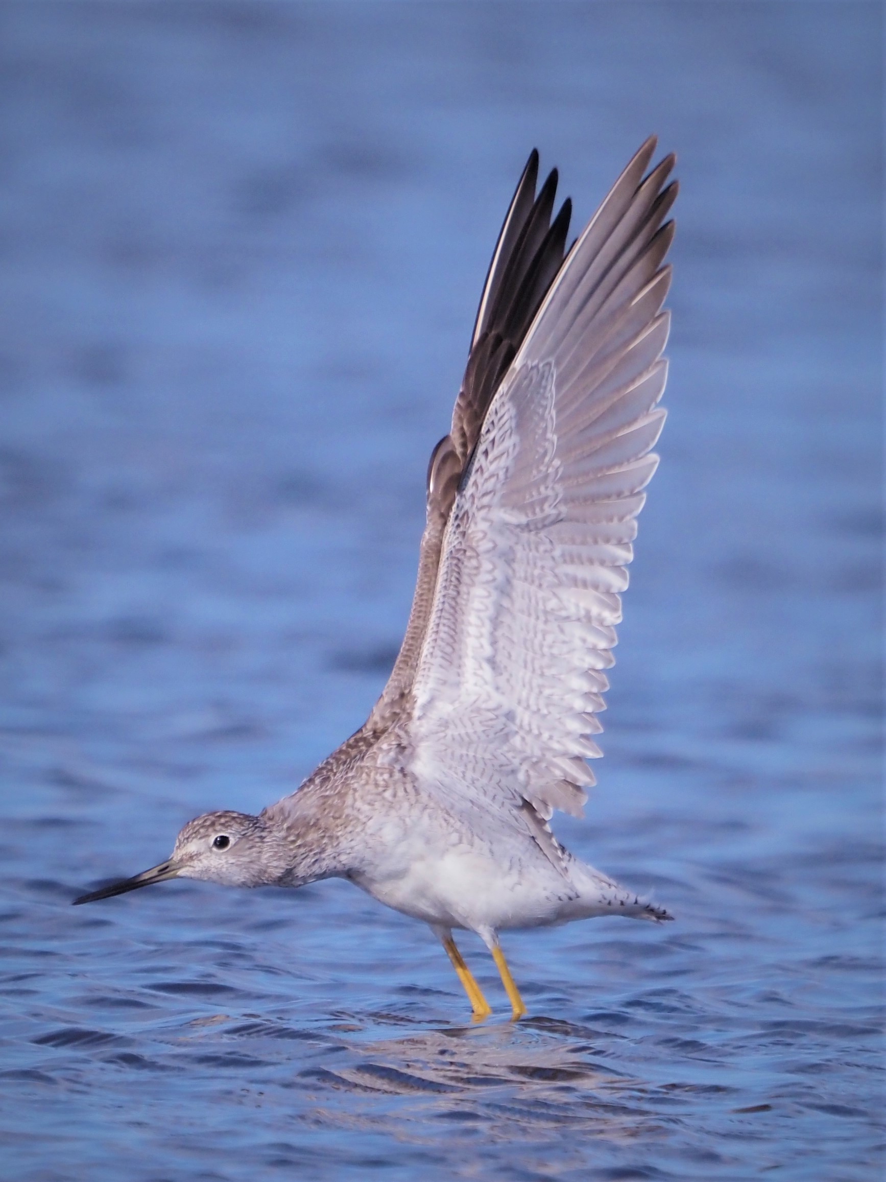 The Greater and Lesser Yellowlegs can be distinguished by comparison of the bill length with the length of the head. As shown below, the Lesser’s bill is approximately the same length as the head is wide, while the Greater’s bill is about 1.5 times the width of the head.
