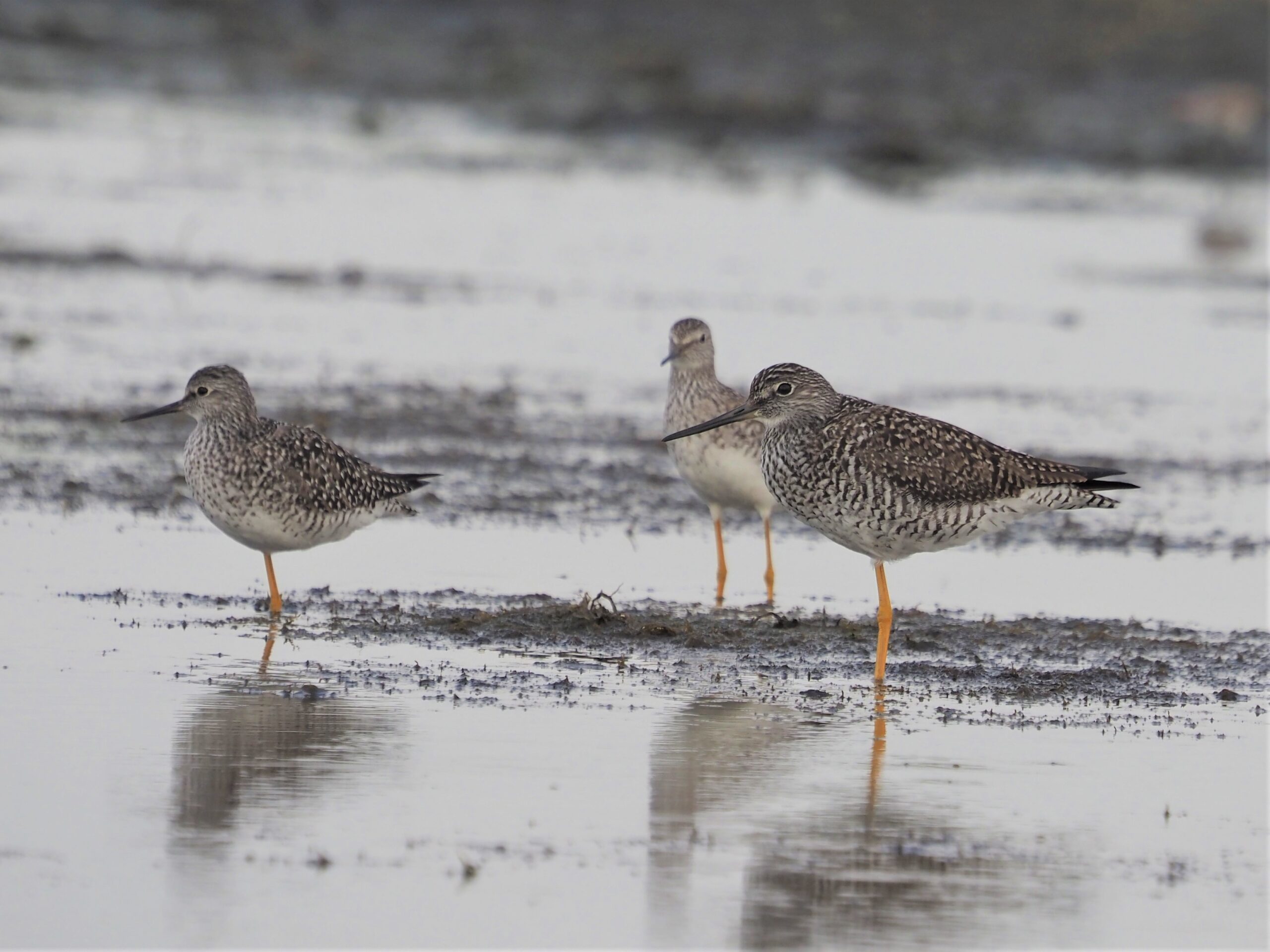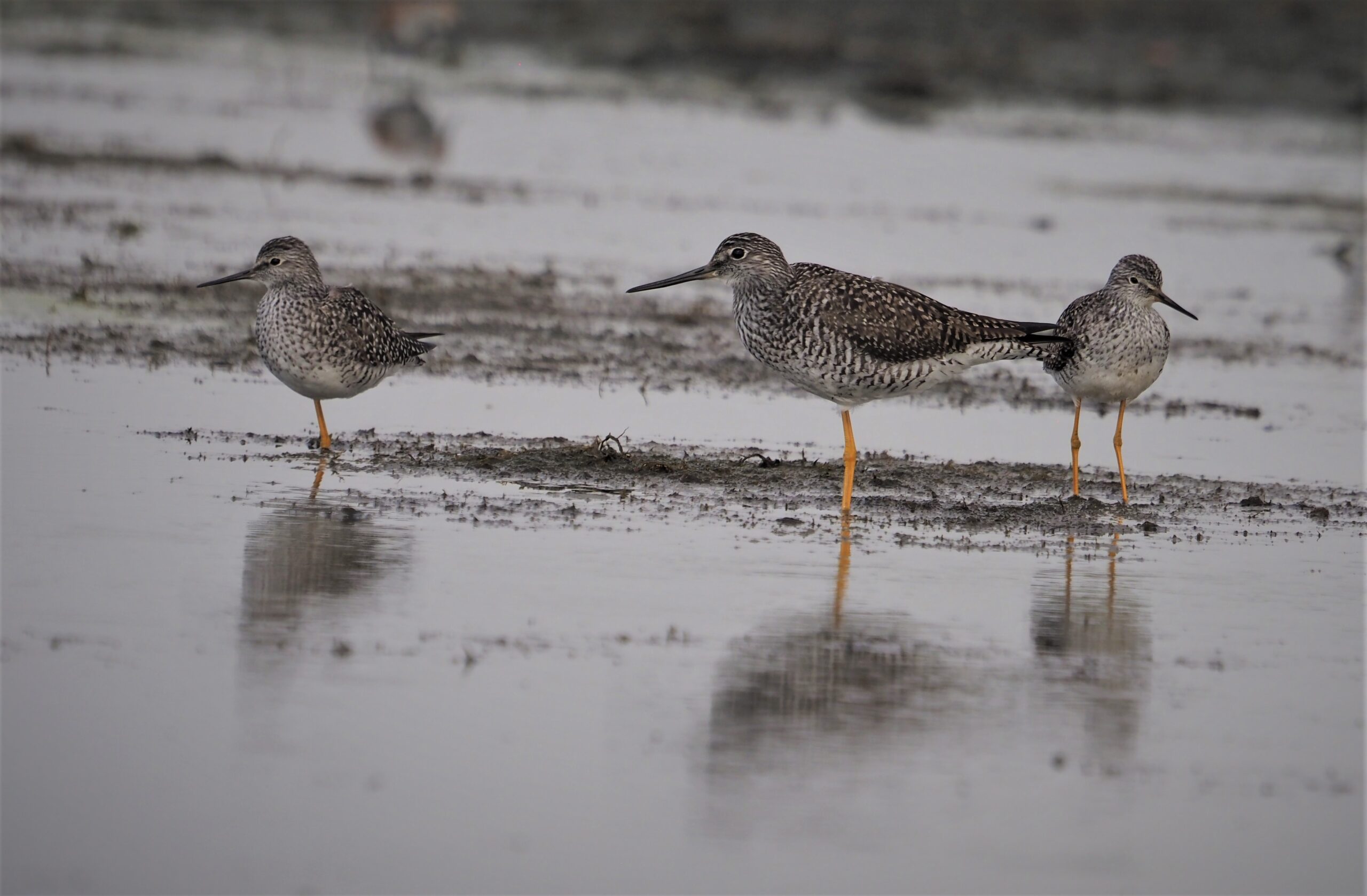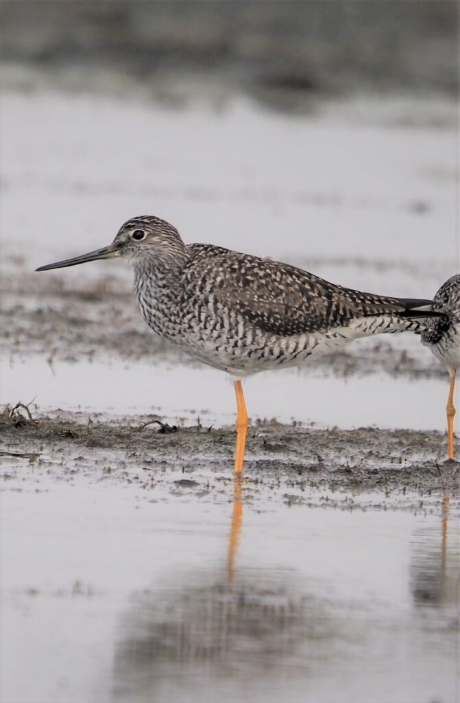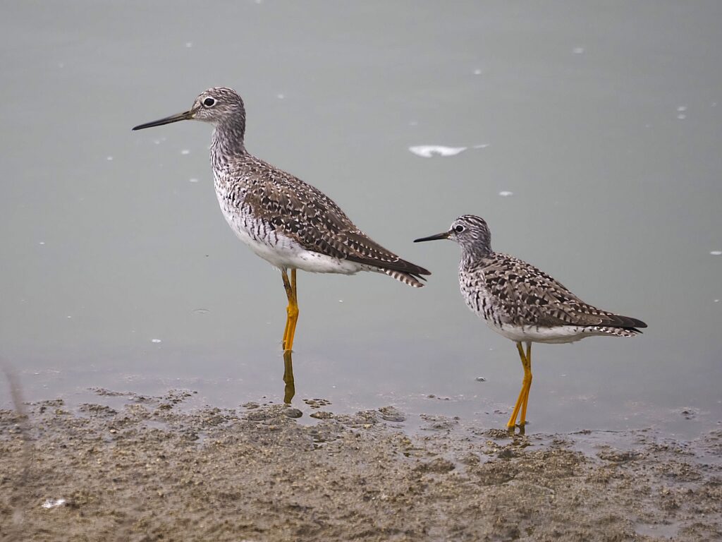 The Greater and Lesser Yellowlegs are directly compared in the photos below. Note that the Greater has an overall more robust structure, while the Lesser is usually more delicate. When directly compared the Greater is much larger and in alternate plumage has more barring on the flanks. Also note the slightly up-turned bill of the Greater, while the Lesser’s bill is very straight.