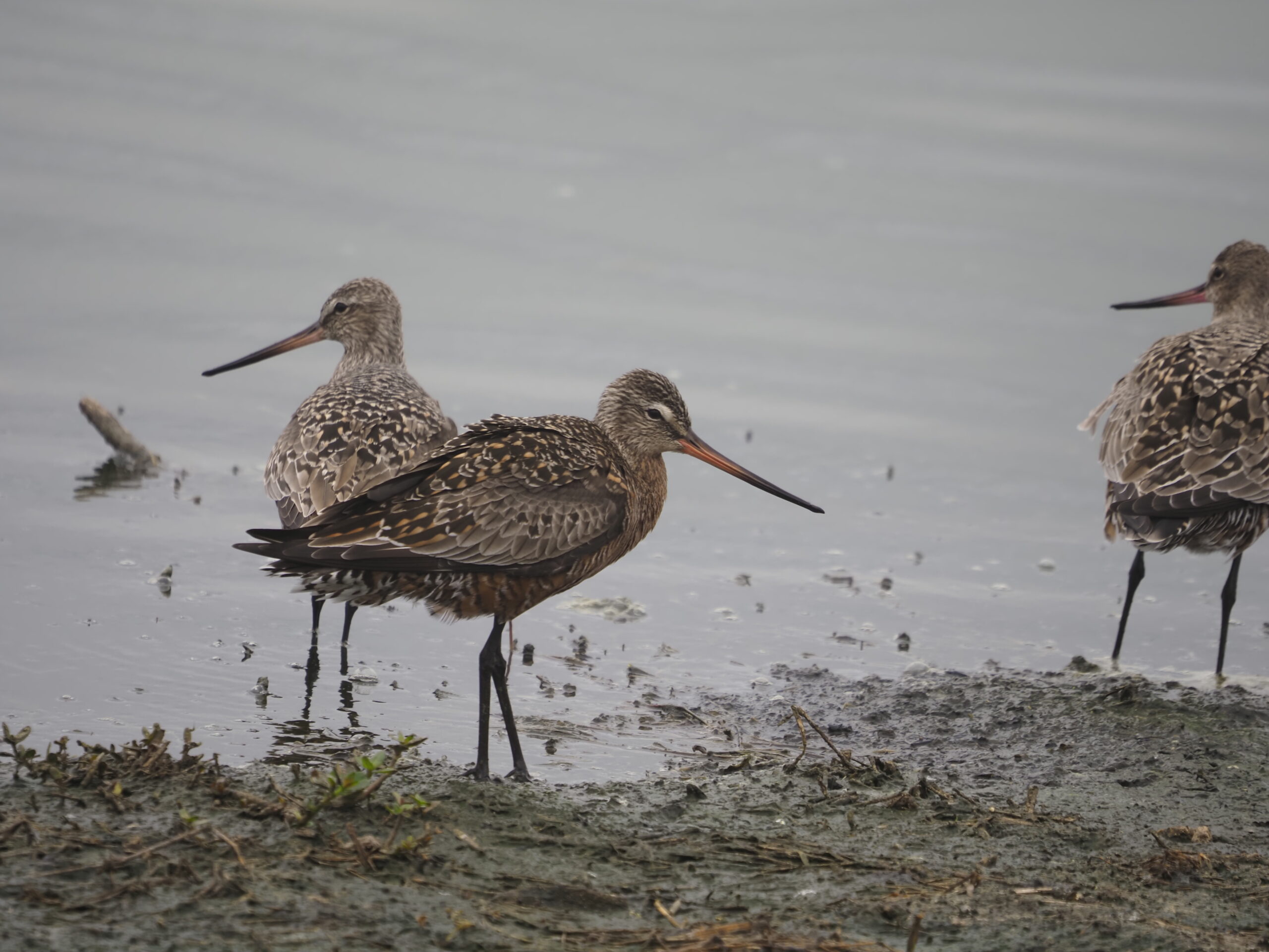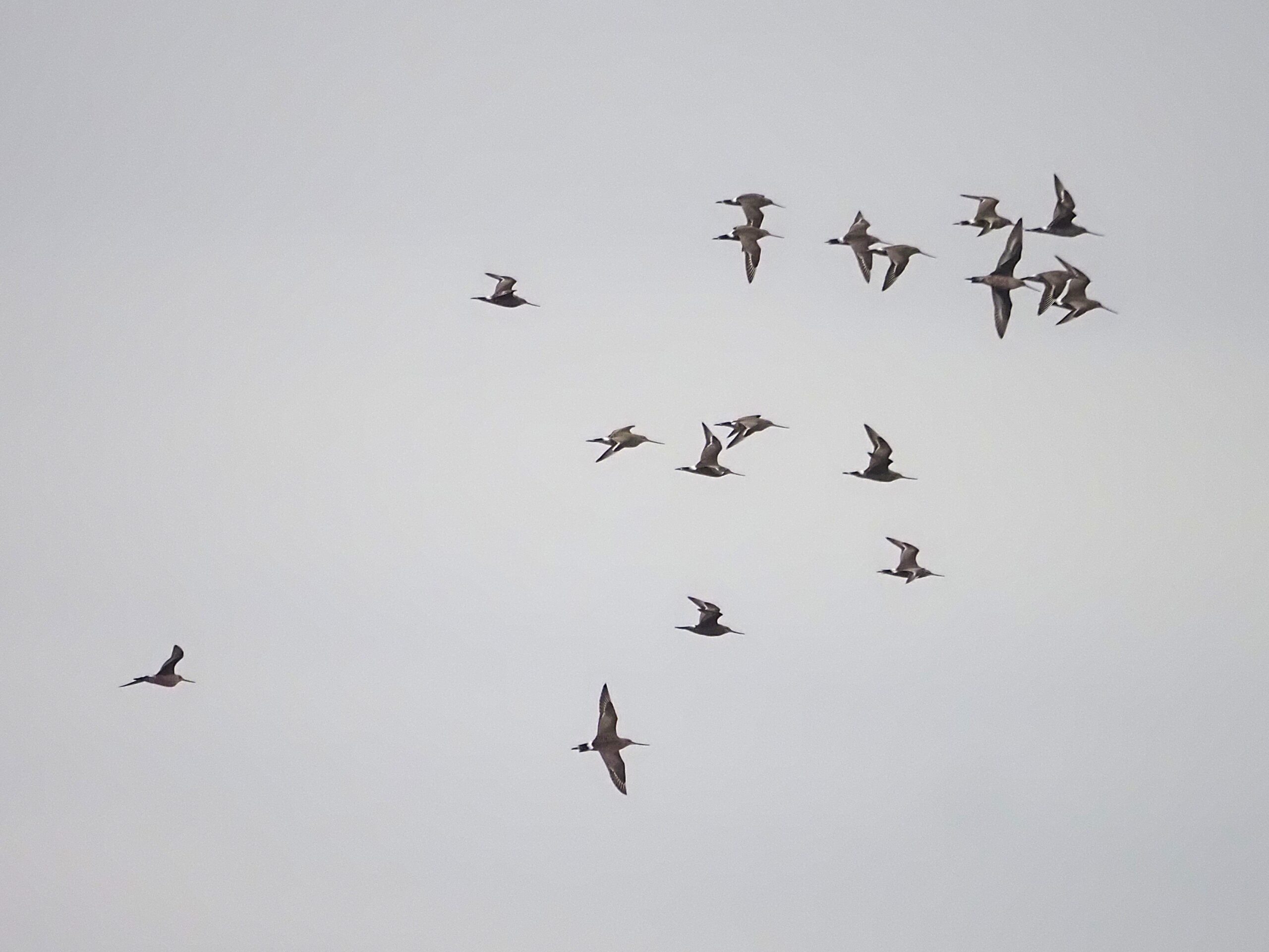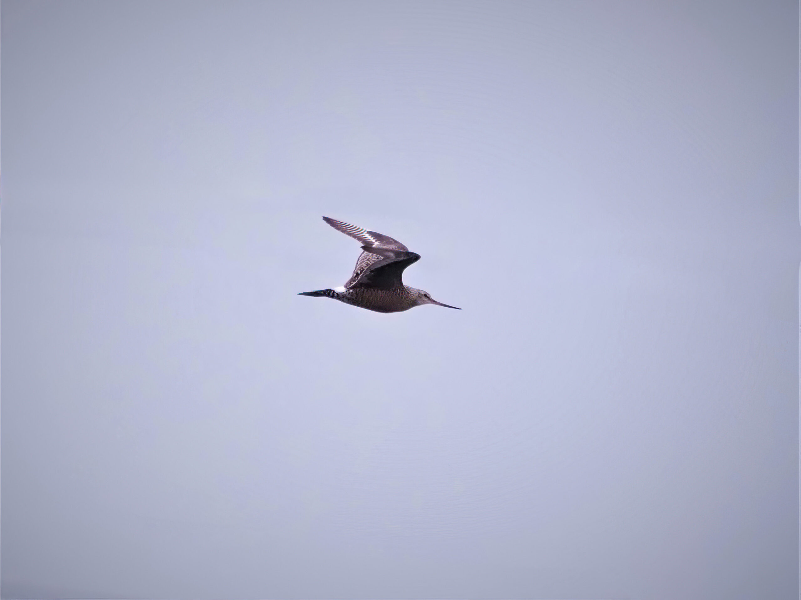 The Hudsonian Godwit is occasionally seen in moist fields in Central Texas in mid-April and irregularly seen on the Texas Coast at that time. As another elliptical migrant, the Hudsonian is seldom seen in Texas on its south-bound migration. In the spring of 2025 several groups of Hudsonian Godwits passed over and through Hornsby Bend, with a number staying multiple days — this was a rare treat to see this species for extended periods in Central Texas.