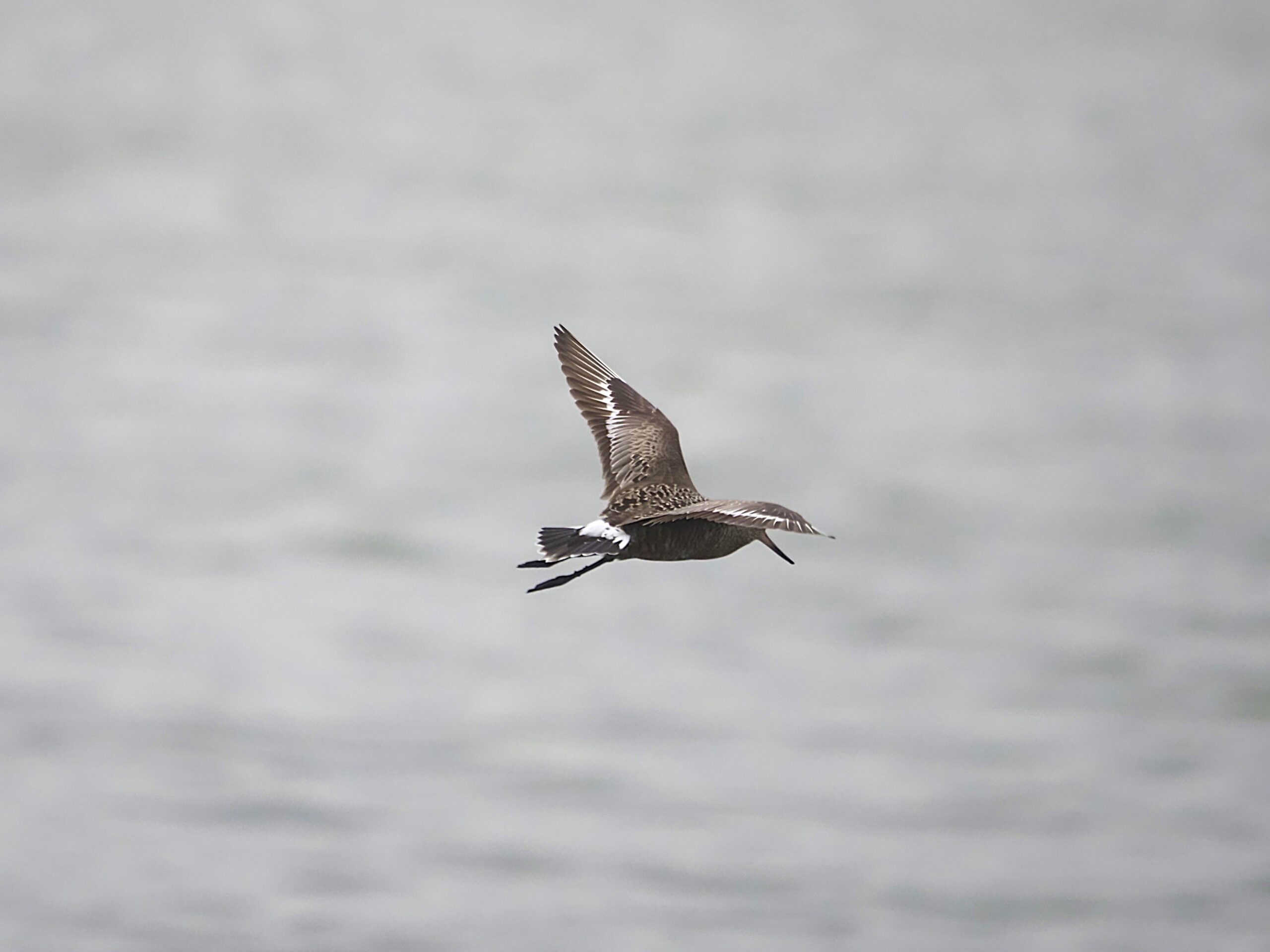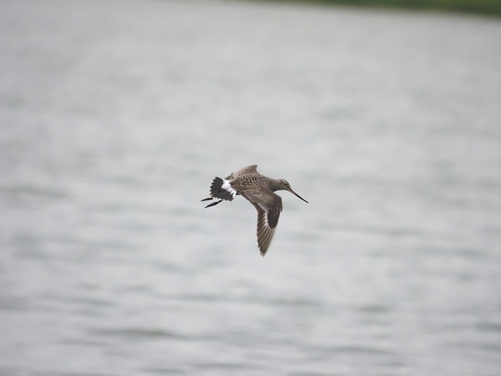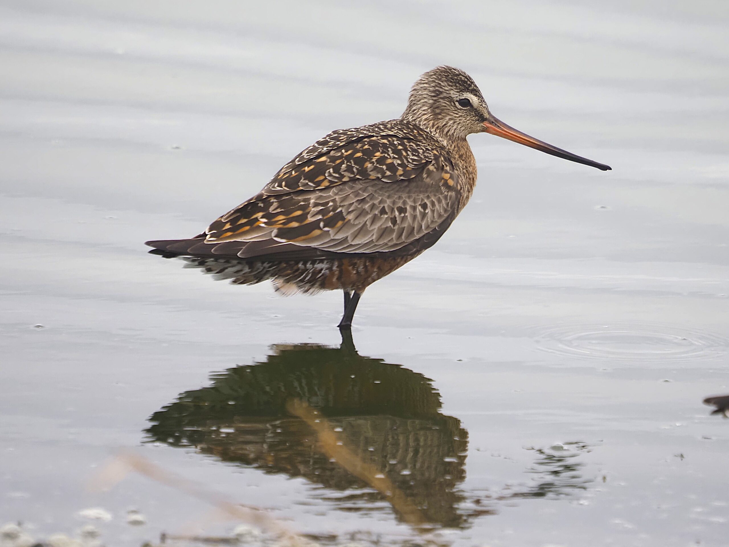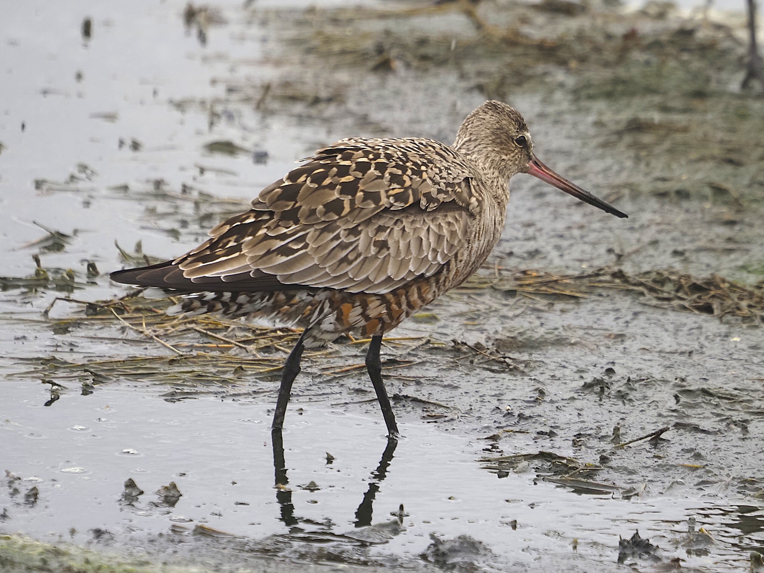 In alternate plumage it is rich tones of reddish-brown, black and white. The white rump, black tail, and white wing-stripes stand out in flight. Unlike the Marbled, the Hudsonian’s upper mandible is all dark. It is smaller than the more common Marbled Godwit.