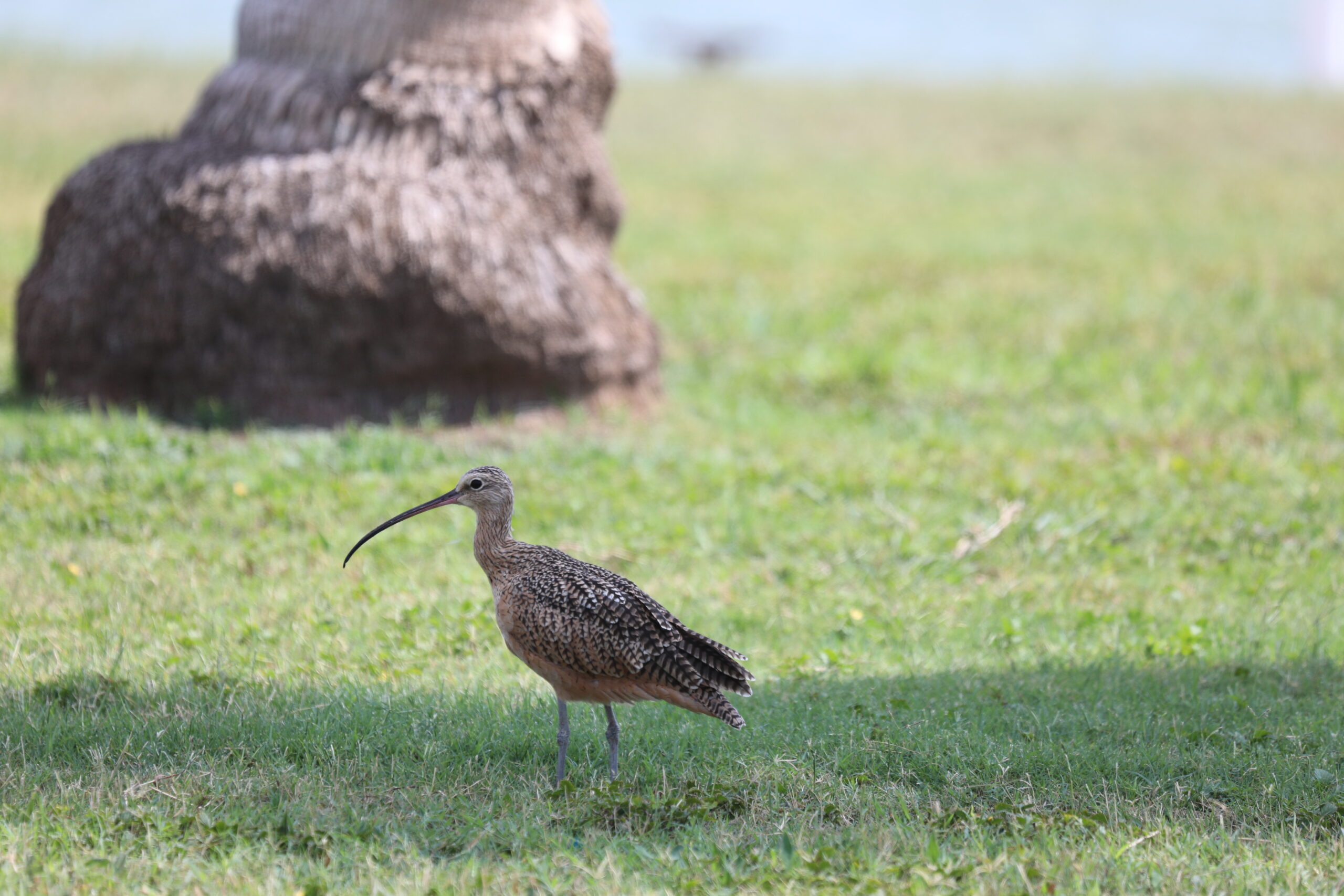 The Long-billed Curlew is seen year round on the Texas Coast and is infrequently seen in migration in Central Texas. Its long decurved bill and sunset orange/brown color make it almost unmistakable. If further differentiation from Whimbrel is needed, note that the Whimbrel has a darkish eye-stripe, a pale supercilium and a crown split by a pale central-crown stripe — in other words the Whimbrel has a stripey head. The Long-billed Curlew has s streaky head and face, with no obvious stripes. (Whimbrel photos can be found here).