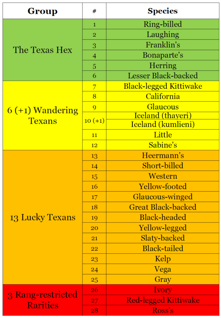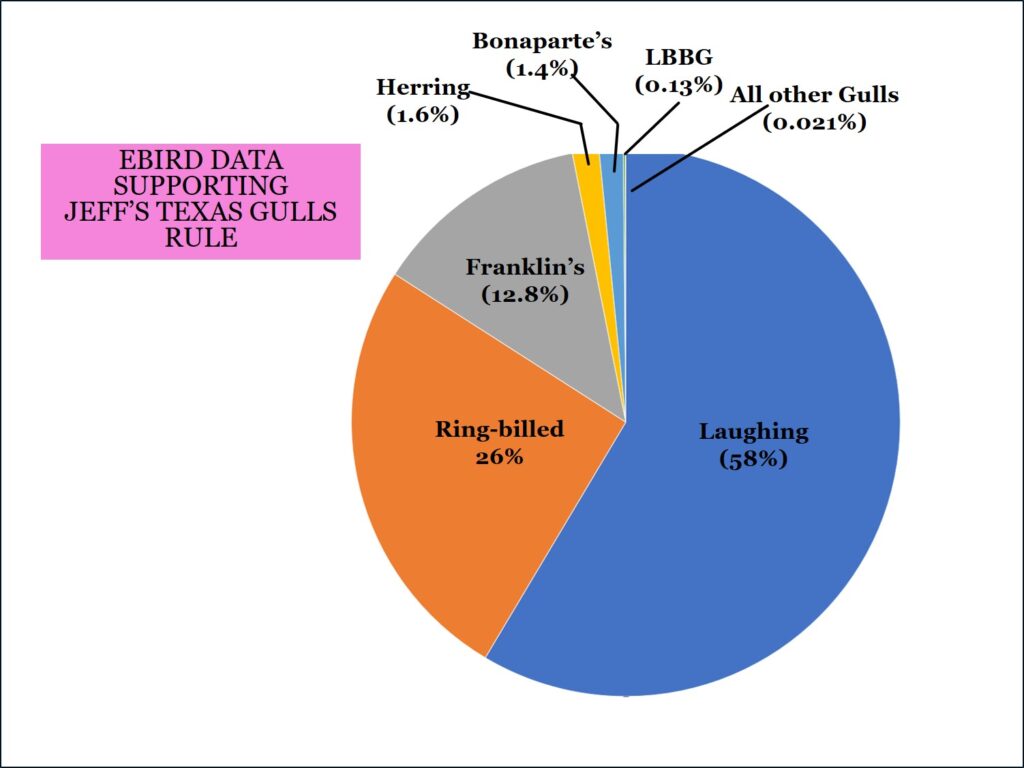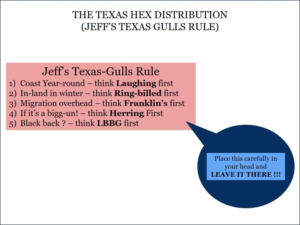 The Texas Hex are the most common and can be expected in winter at many gulling locations (e.g. lakes, landfills, coasts). Memorizing “Jeff’s Texas Gulls Rule” will help to identify over 90% of gulls in Texas. These rules are supported by direct observation as well as Ebird data.