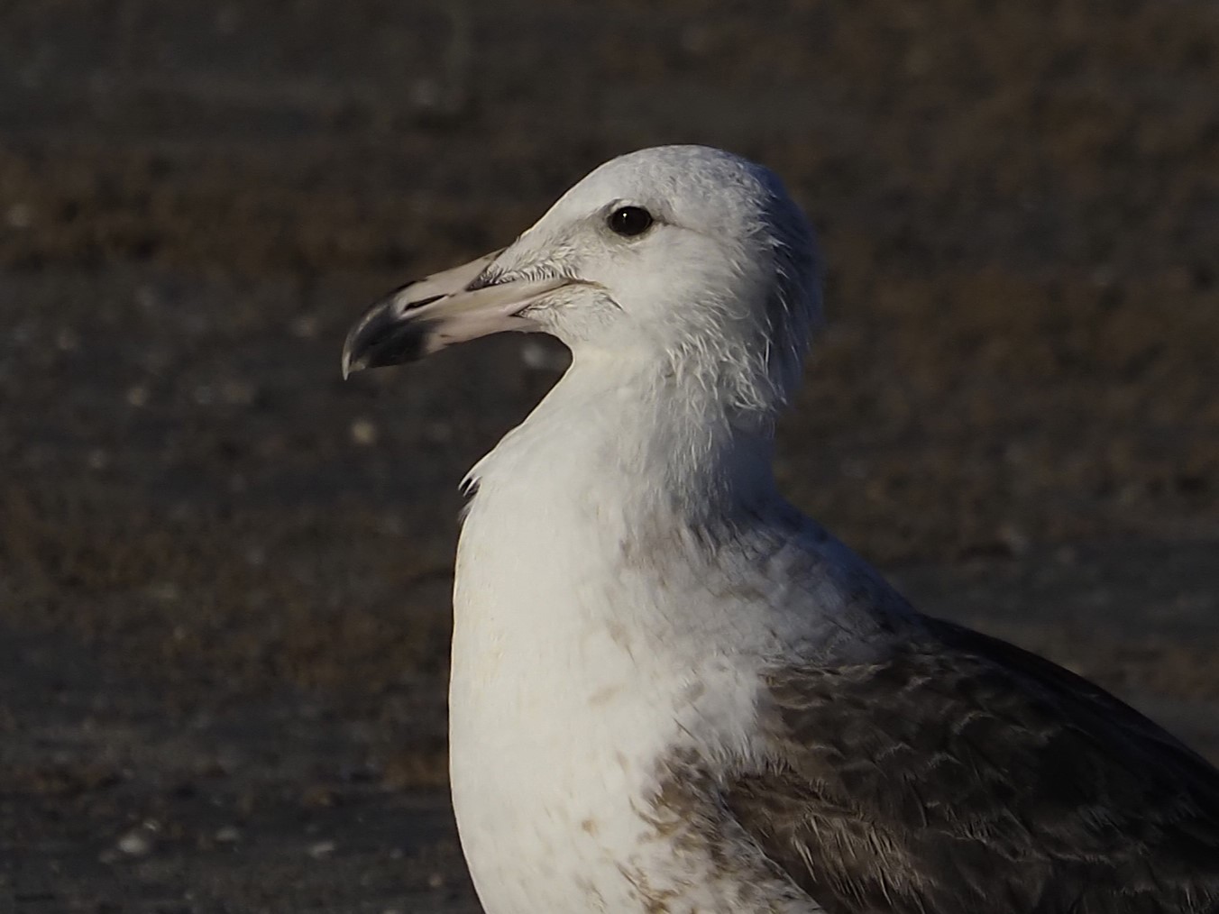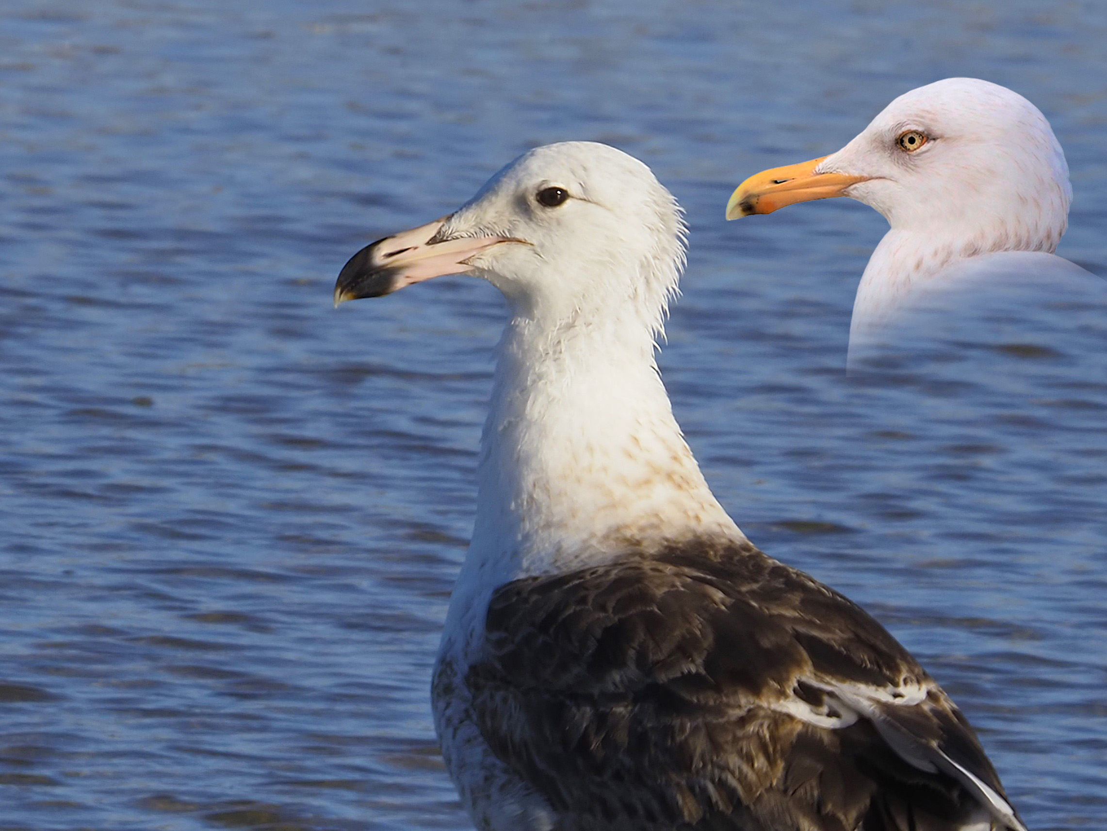 As can be seen from the photos below, the Kelp is a large dark-backed gull with a very large, bulbous-tipped bill. Adults are amongst the darkest-backed gulls. This immature had a dark brown back. The wide and long bill is compared to that of a Herring Gull in one of the photos below.