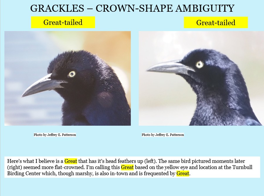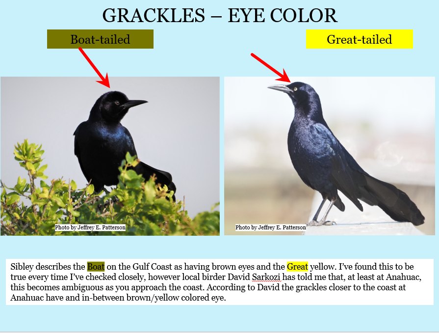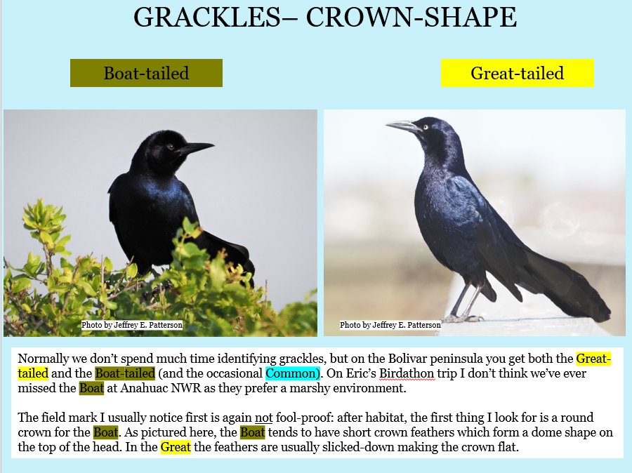 And so it goes — Grackles are next. They’re actually fun on the Bolivar Peninsula!! (you’re on you own for females (ask the males)).