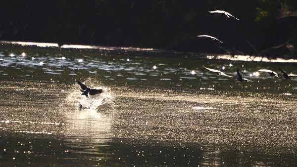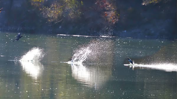 The first photo is a composite of 3 images. Grackles were harassing a kingfisher to try to kleptoparasitise his fish. The kingfisher would stay low to the water and when the grackles got close, he would hit the water, pausing for an instant and the grackles would over-fly him. Then he would turn around and fly up out of the water in the opposite direction trying to give them the slip.
