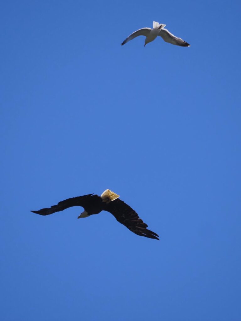 I’ve been thinking of the many Western GUlls as “big birds” (58″ wingspan), but they were dwarfed as they escorted this eagle on its way. Eagle’s are 80″ wingspan.