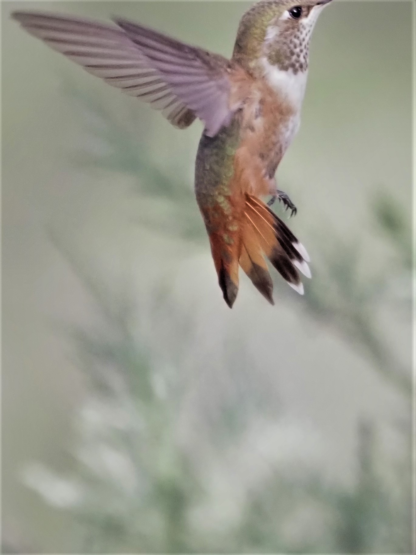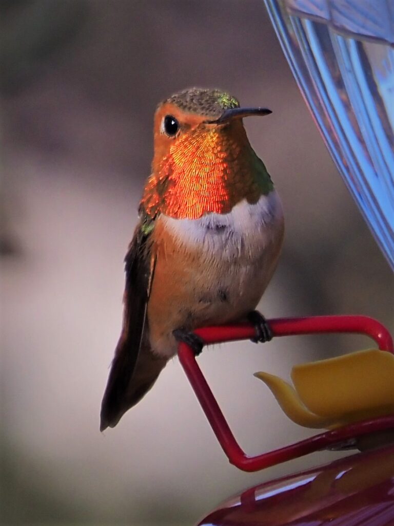 We have at least 3 rufous hummers at our Fort Davis place. The notch in R2 (2nd tail feather (retrices) from the middle) in one of the pix is diagnostic. Full adult male just showed up!! (more pix to come)