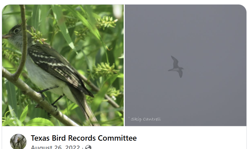 The Trindade Petrel was seen in late Feb 2022 from the Port Aransas jetty (Nueces Co) by Skip Cantrell. Initially IDed as a booby, the photos were only brought to the attention of others a couple weeks later when it was flagged in eBird by Caleb Helsel. The overall shape/jizz of the bird in the few photos of it show it to be a Pterodroma, with many experienced seabirders quickly landing on Trindade Petrel as the correct species ID. The TBRC thanks Todd McGrath for his critical review of this record. Photo by Skip Cantrell.