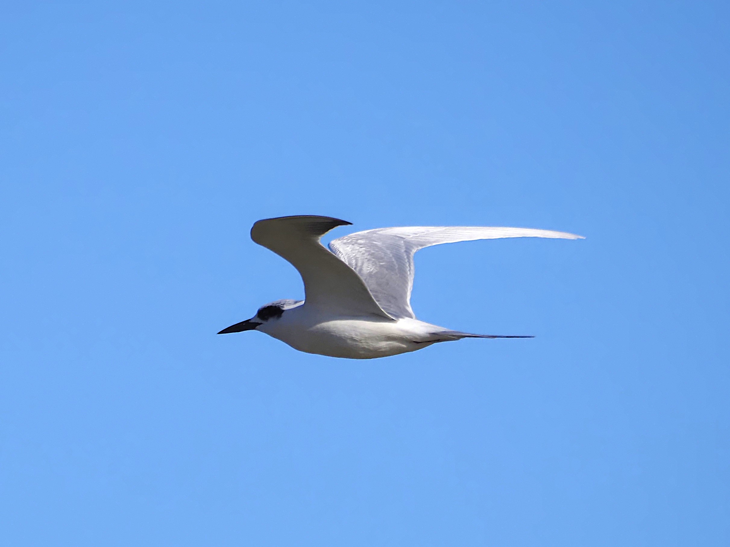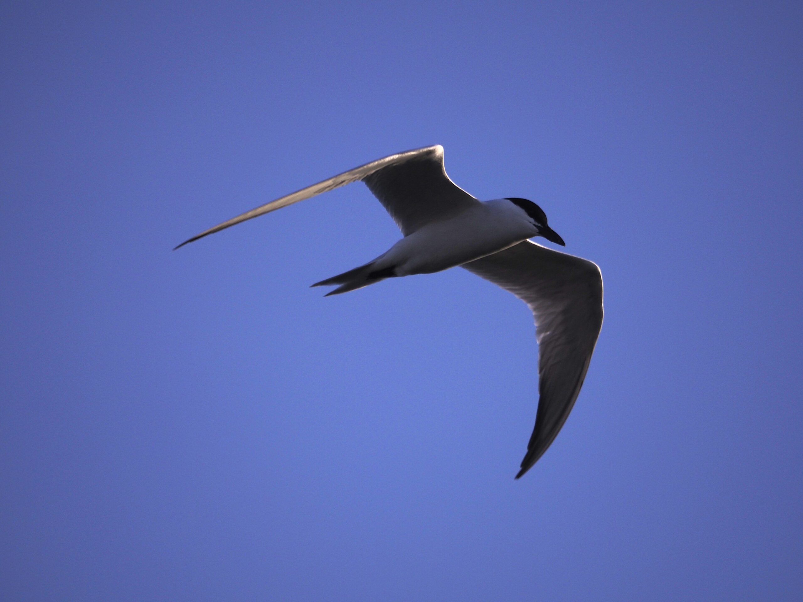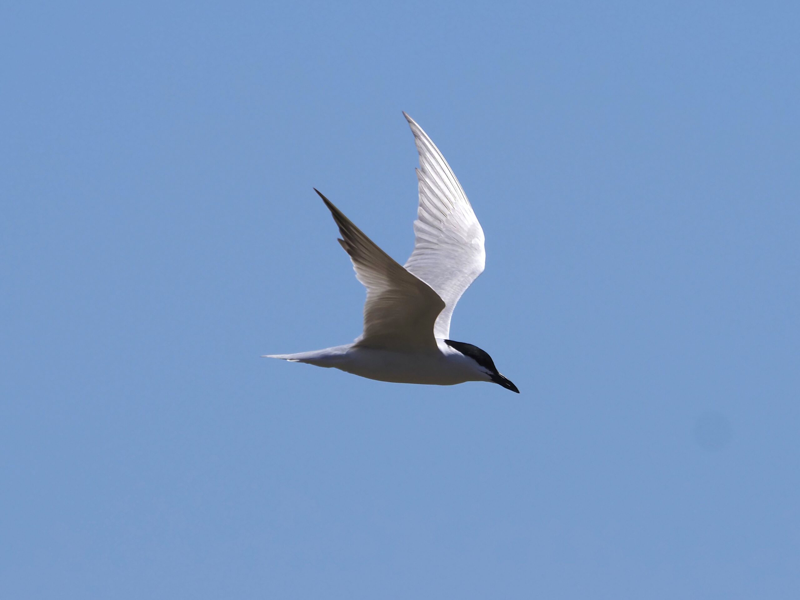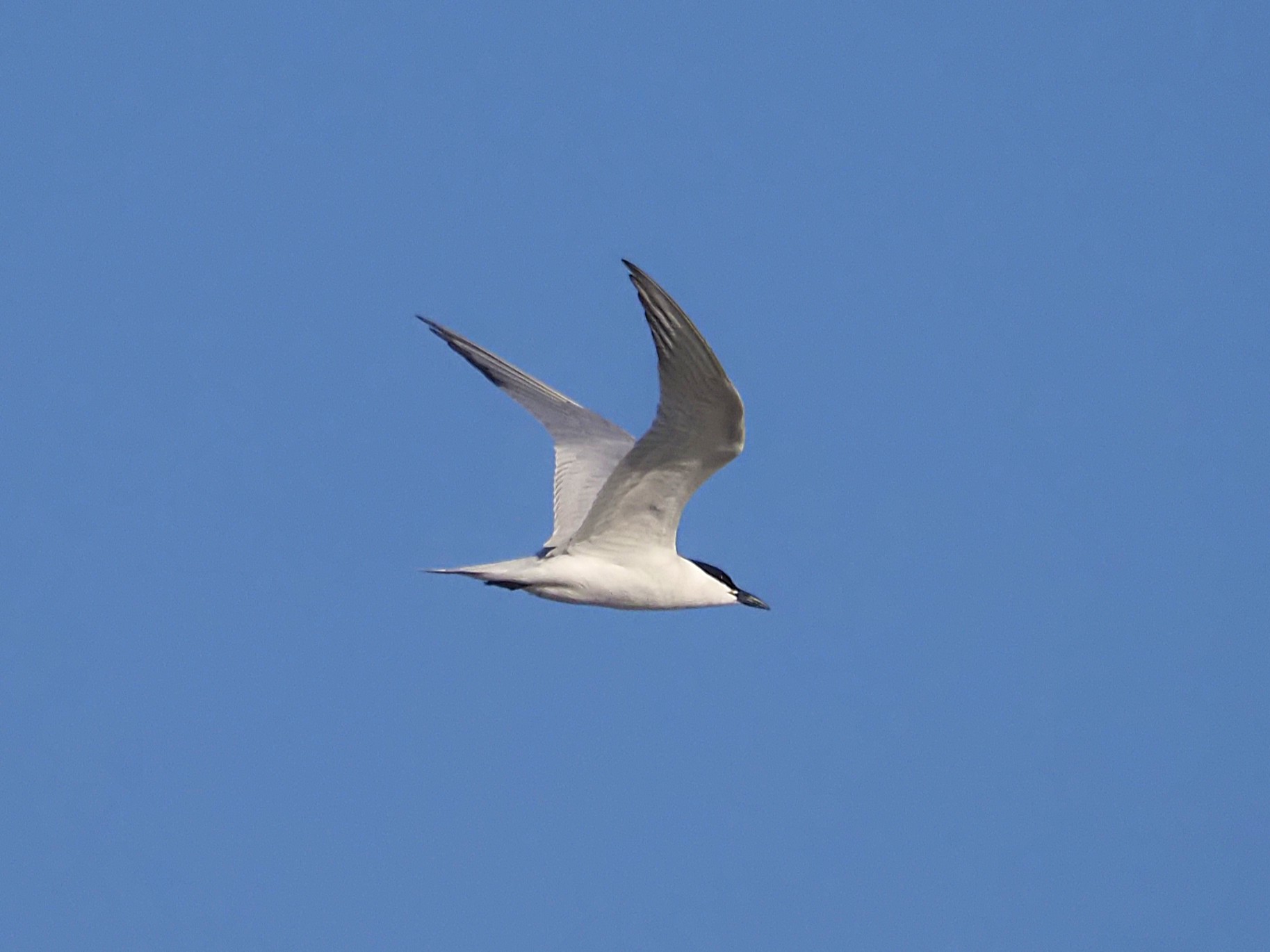 In flight the Gull-billed is pale backed, short-necked and shows a black stubby bill.